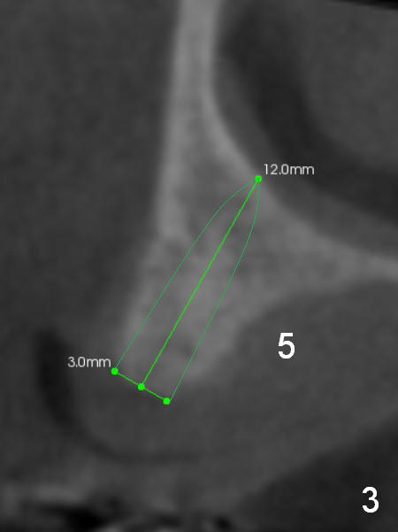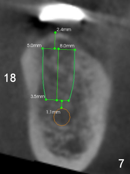 Wheel saws will be used to split the ridge before drilling at #7 (Fig.4). Surgical bur is to be used for ridge reduction prior to osteotomy at #19 (Fig.6), while at #18, osteotomy depth will be 10 mm for 8 mm implant (Fig.7).