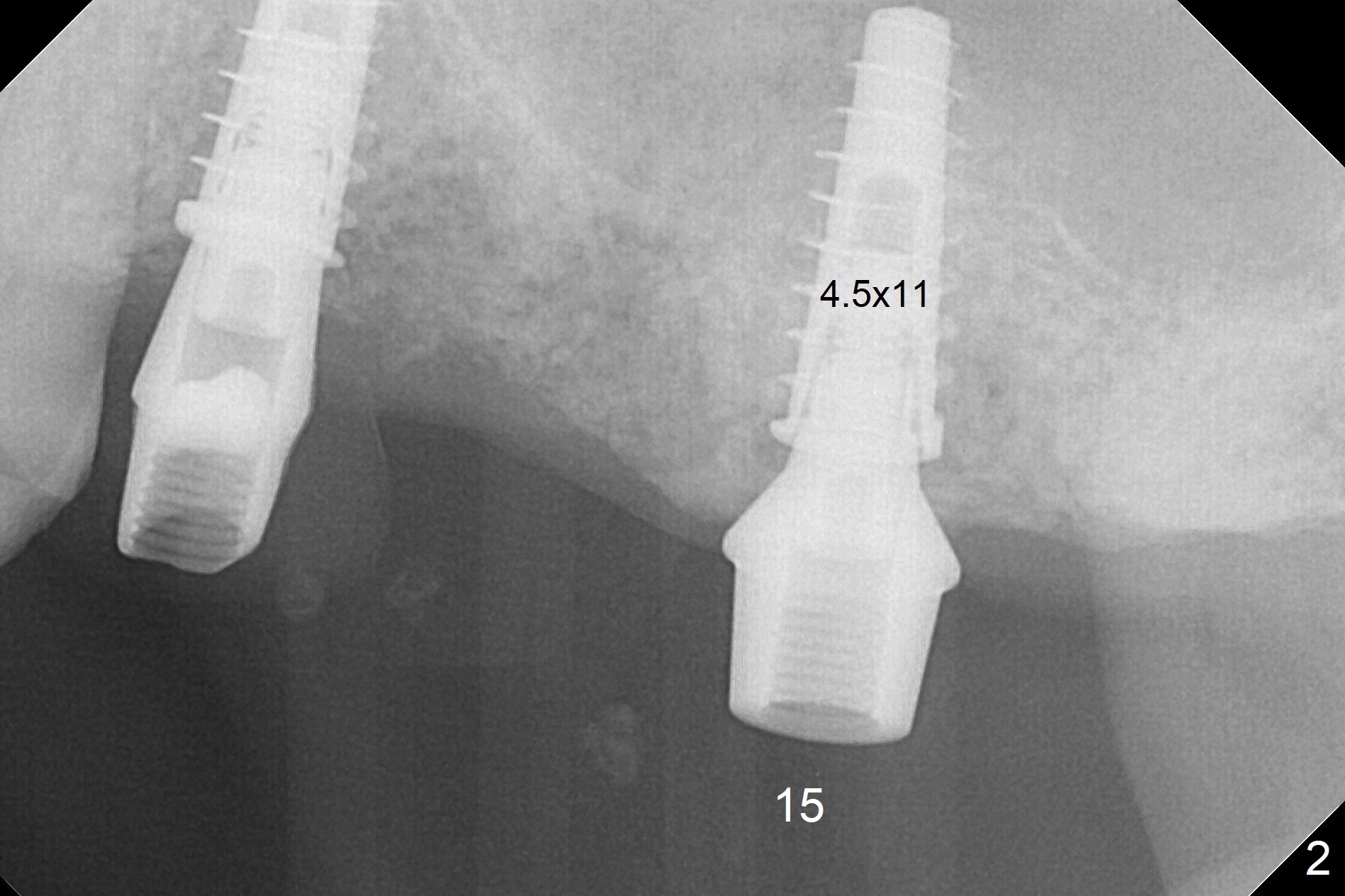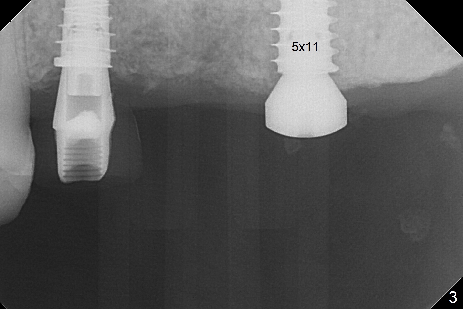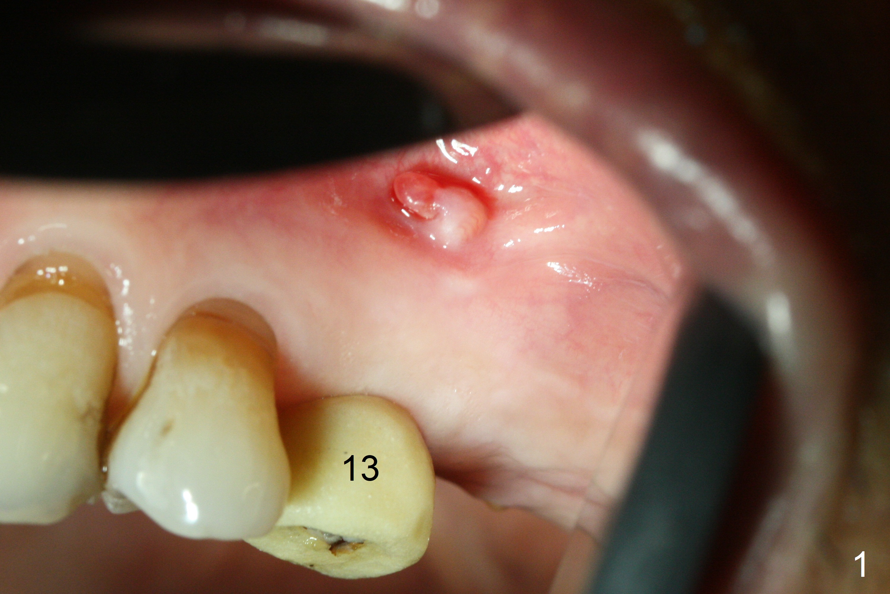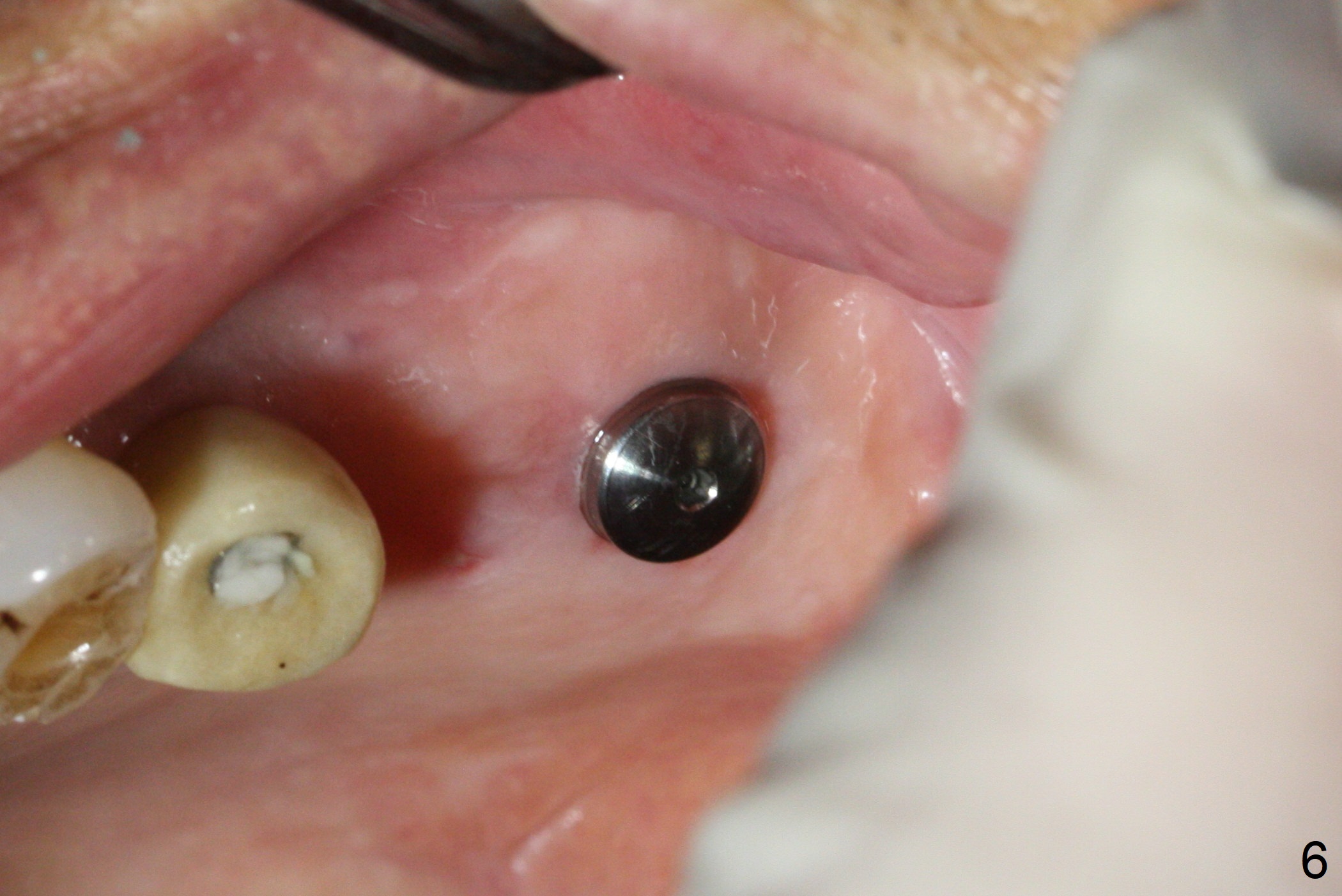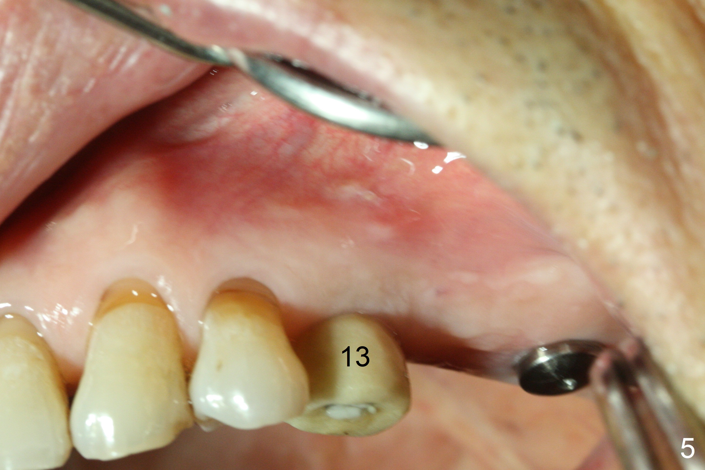 A fistula is found apical to #13 immediate implant 9 months postop (Fig.1). It is curetted without bony defect. Osteotomy at #15 is accomplished with traditional tapered osteotomes from 2 to 5 mm for 11 mm deep. Although the patient is a little uncomfortable with tapping (as compared to Magic Expanders), a 4.5x11 mm dummy implant is placed 2 mm subgingival with primary stability (Fig.2). Finally a 5x11 mm IBS implant (2 mm longer than the previous one) is placed with insertion torque > 50 Ncm; a 6x2 mm healing abutment is placed (Fig.3,4). The advantages of the flapless surgery (because of the wide ridge) include no allograft or suture. The fistula apical to #13 implant disappears 3 days postop (Fig.5), while the gingiva attaches to the healing abutment at #15 (Fig.6).