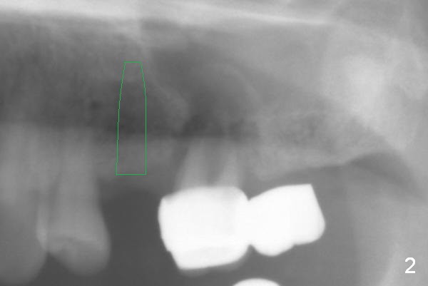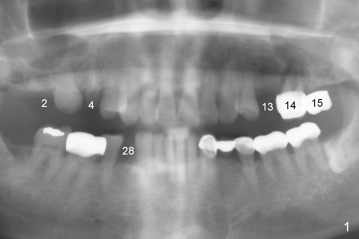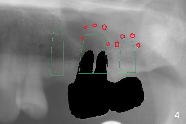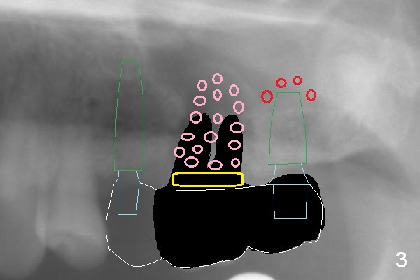 The 72-year-old man will return for #13-15 implantation after that at #2/4 and 28. There is severe wear in the cingula of the upper anterior teeth due to posterior collapse (several missing teeth, residual root and failing restoration, Fig.1). Prior to removal of the cantilever bridge (#14.15), an implant is placed at #13 (Fig.2). If the defect at #14 is too large after extraction, an implant is placed at #15 with an immediate provisional bridge (Fig.3 white line). Otherwise a large implant (possibly Tatum tapered) will be placed at #14 (Clindamycin) with splinted immediate provisional (Fig.4). Allograft is expected for sinus lift at #14 and 15 (Fig.3,4 red circles with Osteogen in 3:1 ratio). For socket preservation at #14, mix equal amount of allograft and Osteogen (Fig.3 pink), followed by Collagen plug (yellow) and the pontic of the provisional bridge. Prepare PRF (3-4 tubes of blood, one of them to be made for a plug).