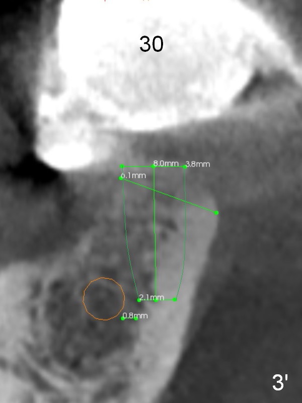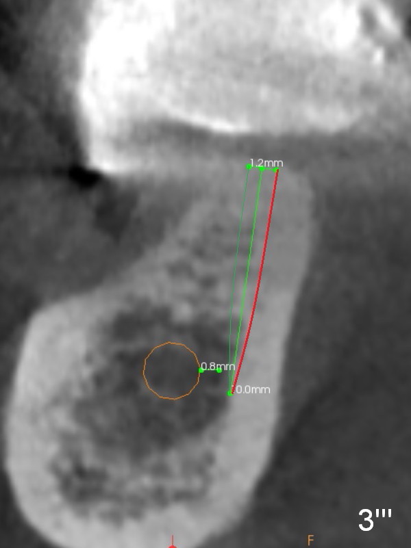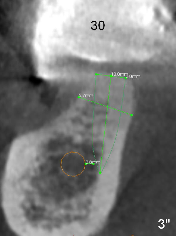 A 1-piece implant may be used at the site of #30 (Fig.3''). The initial osteotomy using 1.2 mm pilot drill should be along the lingual plate (cortical and medullary junction, Fig.3''' (red line), using a index finger along the lingual plate). The 2nd pilot drill (1.5 mm) goes down 8 mm and 2 mm for 6 mm. When the 1-piece implant (3x10 mm) is being placed, it will push the remaining medullary bone buccally (condensing effect, hopefully without pressure on the canal).