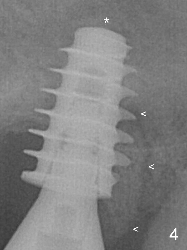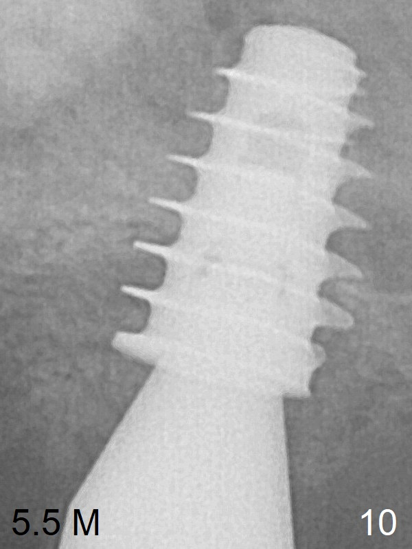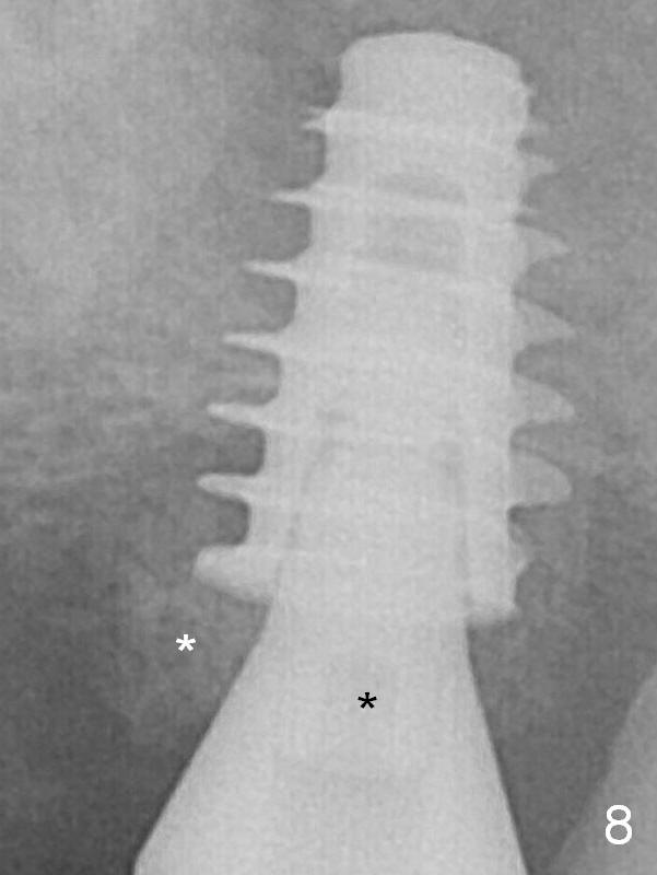 After placement of PRF membrane and bone graft (allograft, autogenous bone and Osteogen, Fig.4 *), a 6x9 mm IBS implant is placed with insertion torque of 30 Ncm. It appears that the fins of the implant slice into the bone at high magnification for engagement. Following further placement of the implant, bone graft is packed into the distal portion of the socket (<). The mesial gingiva is so thick that it is impossible to place bone graft mesial to the implant. When an implant is placed at #13 one month later, extend the incision to the mesial of #15 for bone graft. One month later, bone graft is placed mesial (Fig.8 white *) and palatal (black *) to the implant at #15 while a 3.8x13 mm implant is placed at #13 following bone expansion (using Magic Split and Magic Expander 3.0 mm). The pair abutment is changed to a healing one (6x4 mm) because of mobility 2.5 months postop. The implant seems to be stable 5.5 months postop (Fig.10), while the bone graft stays.