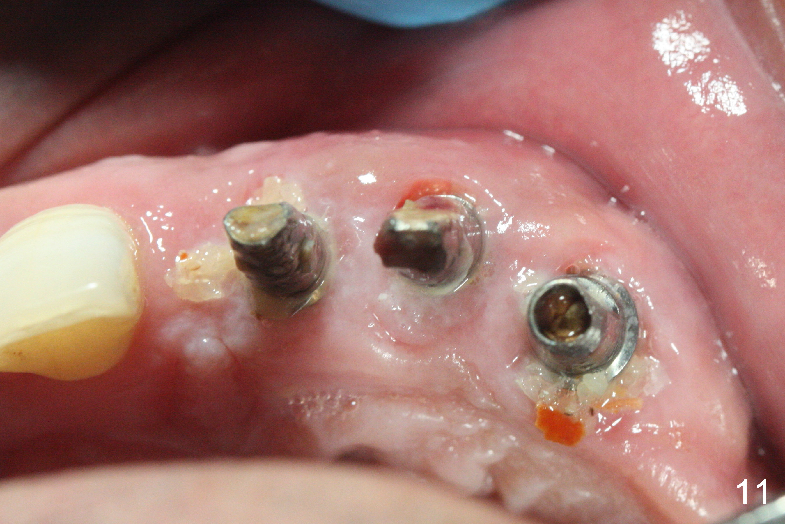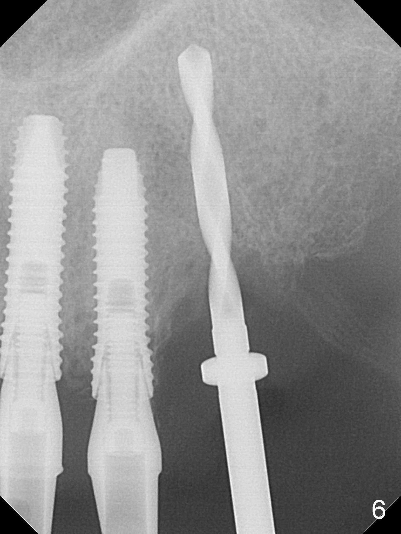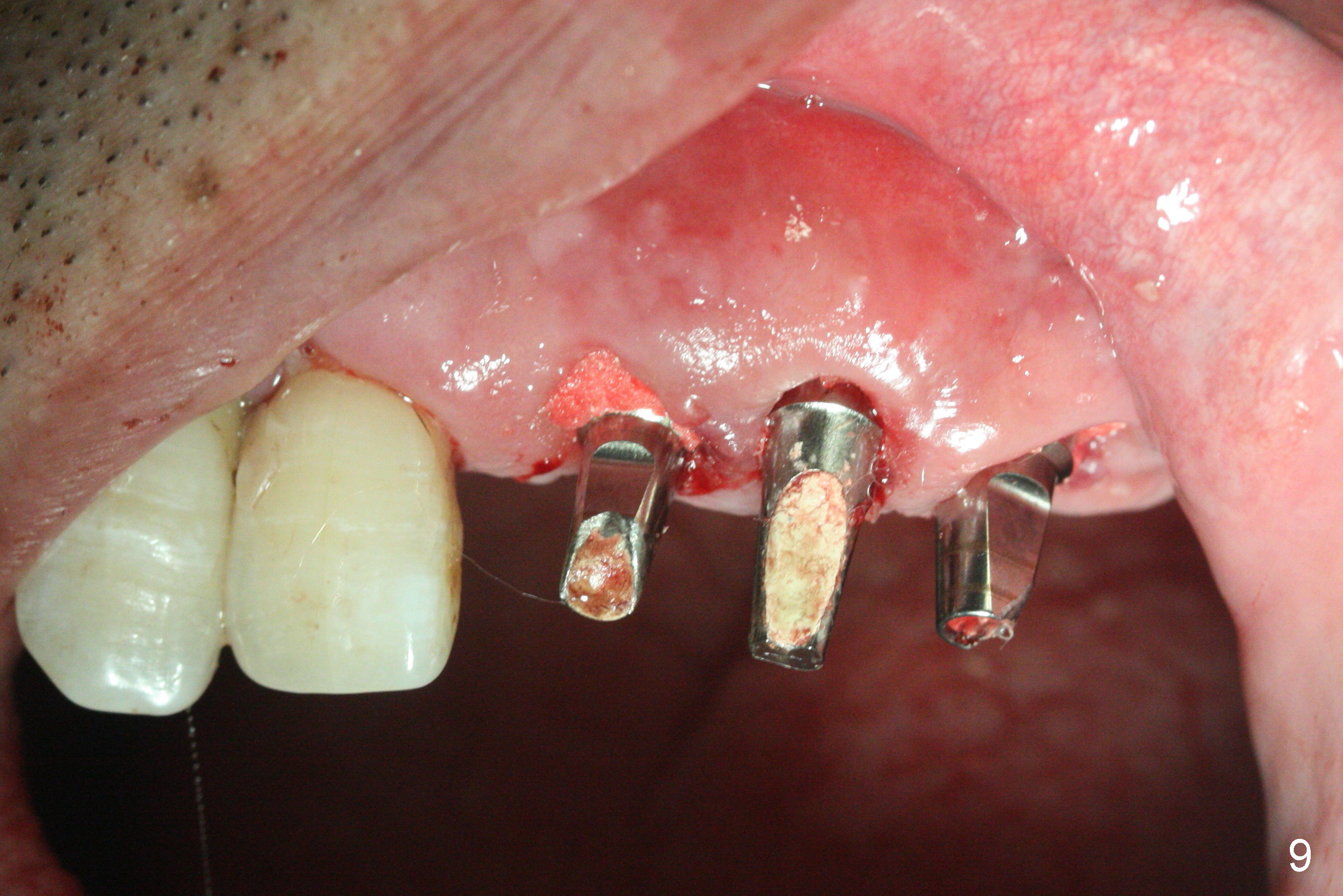 The dentition is poor except #6 and 8 (Fig.1). The gingiva is erythematous at #9-11 (Fig.2). The teeth #9 and 10 are extracted first; a 4x16 mm UF implant is placed at #9, while a 2 mm pilot drill is at the site of #10 (Fig.3). The implant at #9 is placed deeper with placement of 4.5x5.5(5) mm abutment; a 3.8x15 mm implant is placed at #10 initially (Fig.4). While the latter is placed deeper, a 4x16 mm implant is placed at #11 (Fig.5 after removal of #11-15 FPD (fixed partial denture)). In fact the trajectory at #11 is not difficult to be changed with 2 mm drill (Fig.6). After use of 3 mm drill, the implant is reinserted at #11 with ideal trajectory (Fig.7). After further seating of the implant at #11, graft is placed in the remaining sockets of #9-11 (Fig.8 *; later more graft is placed mesial to #11 implant (^)). Finally, a 4.5x7(5), 4.5x15° B (4) and 5.5x7(5) mm abutments are tightened and prepared (Fig.9) for splinted provisional at #9-10.