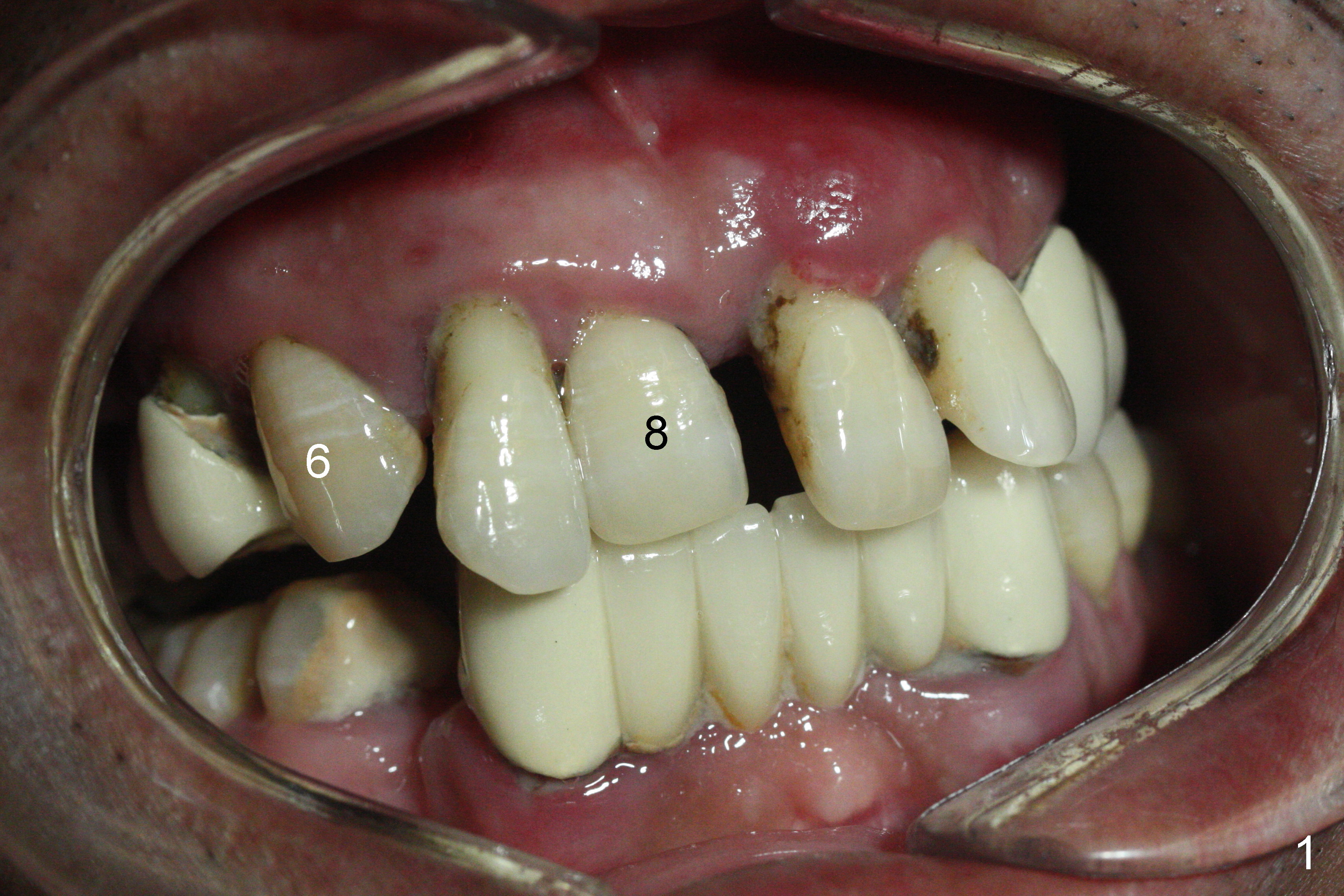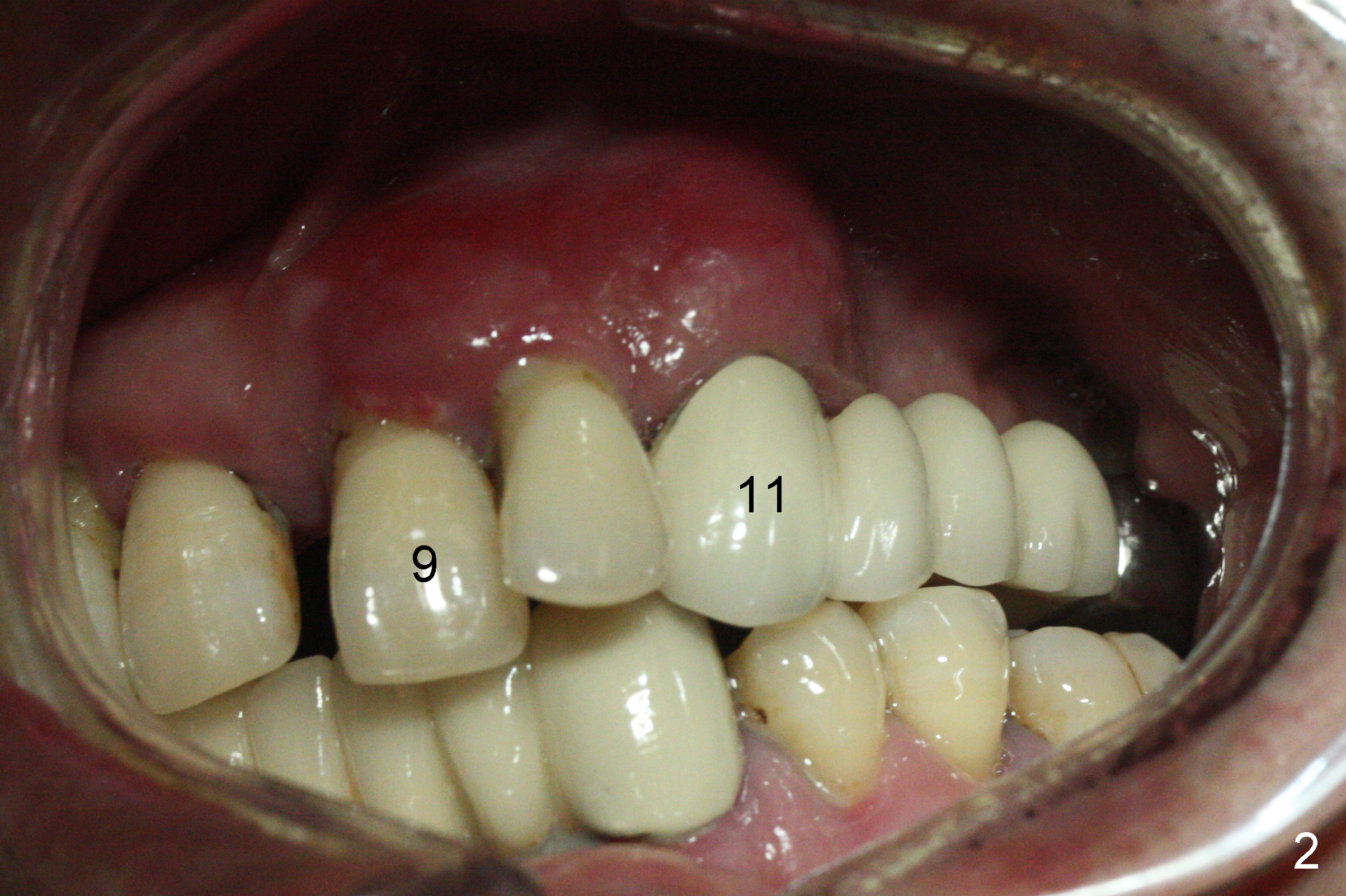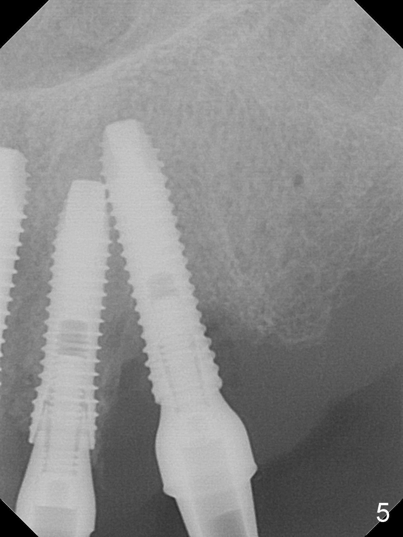 The dentition is poor except #6 and 8 (Fig.1). The gingiva is erythematous at #9-11 (Fig.2). The teeth #9 and 10 are extracted first; a 4x16 mm UF implant is placed at #9, while a 2 mm pilot drill is at the site of #10 (Fig.3). The implant at #9 is placed deeper with placement of 4.5x5.5(5) mm abutment; a 3.8x15 mm implant is placed at #10 initially (Fig.4). While the latter is placed deeper, a 4x16 mm implant is placed at #11 (Fig.5 after removal of #11-15 FPD (fixed partial denture)). In fact the trajectory at #11 is not difficult to be changed with 2 mm drill (Fig.6). After use of 3 mm drill, the implant is reinserted at #11 with ideal trajectory (Fig.7). After further seating of the implant at #11, graft is placed in the remaining sockets of #9-11 (Fig.8 *; later more graft is placed mesial to #11 implant (^)). Finally, a 4.5x7(5), 4.5x15° B (4) and 5.5x7(5) mm abutments are tightened and prepared (Fig.9) for splinted provisional at #9-10.
