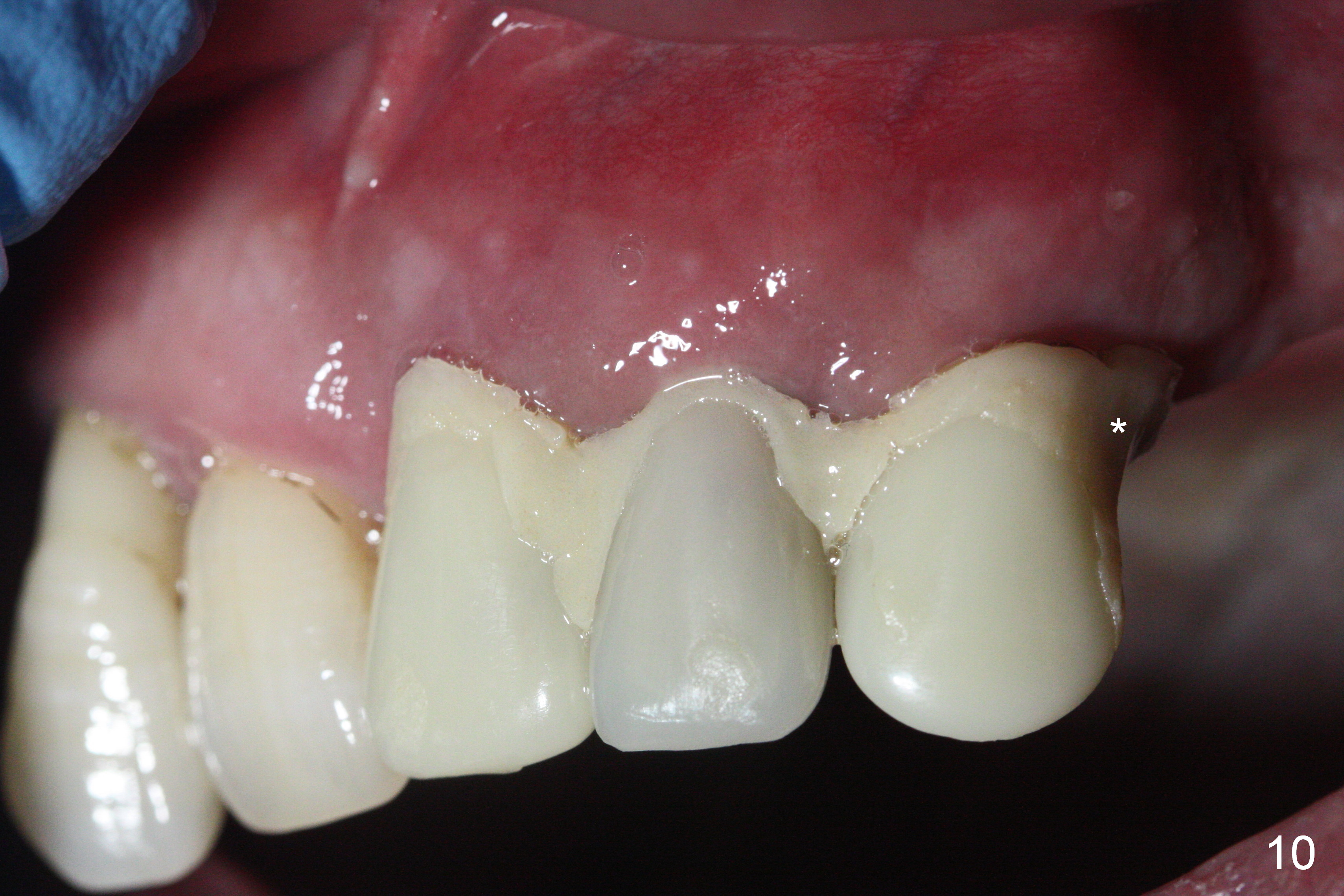 The patient returns 8 days postop, uncomfortable with overhang in the provisional (Fig.10 *). The sockets appear to be healing with loose bone graft (Fig.11) when the provisional is removed for trimming (Fig.12). Six (for #7,13) and seven (#9-11,15) months postop, the soft (Fig.13,17) and hard (Fig.14-16,18) tissues heal. It appears that the trajectory at #9,11 and 13 should be changed by using angled abutments (Fig.18,19 (panoramic X-ray taken 2 months earlier)) before provisional and final restoration.