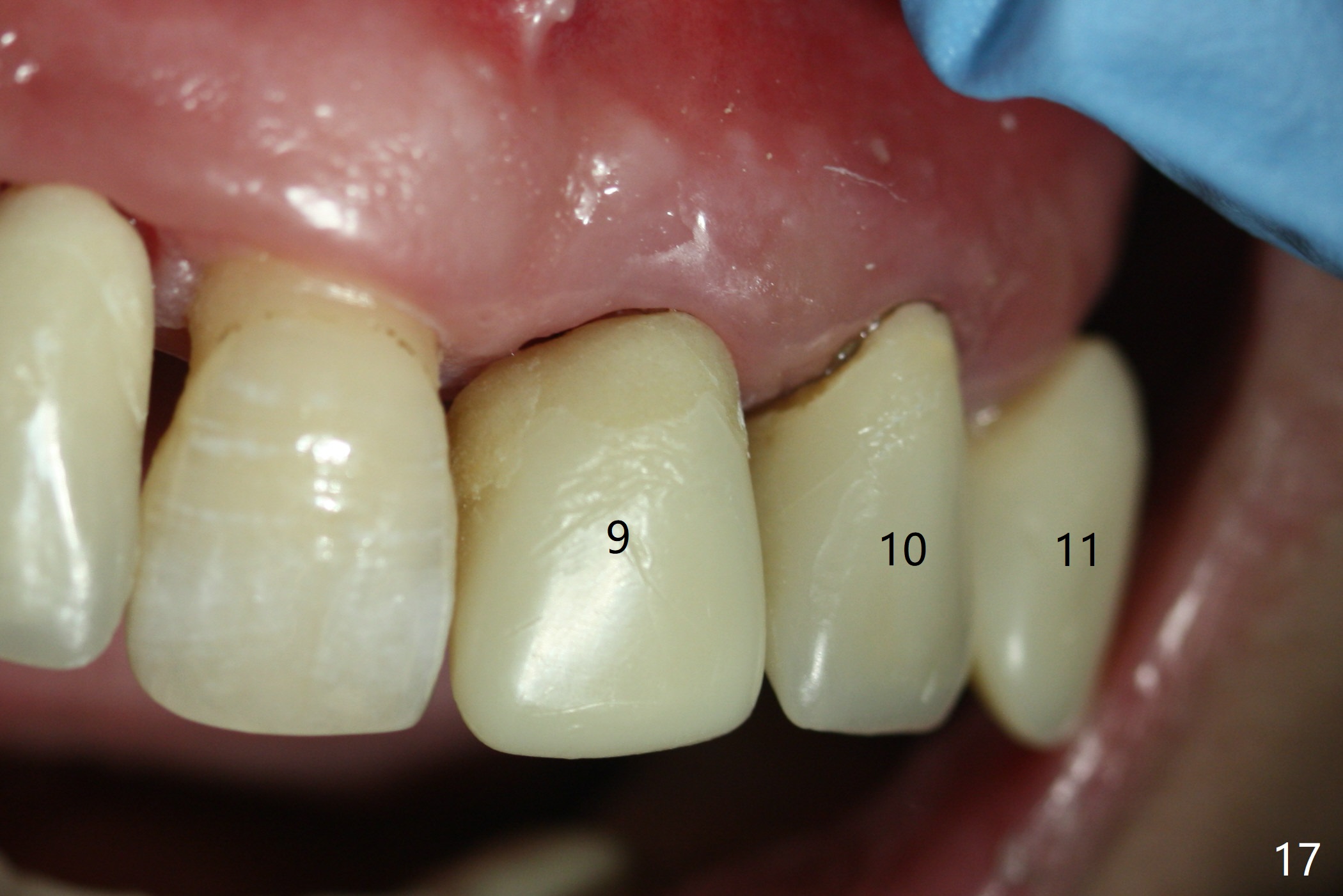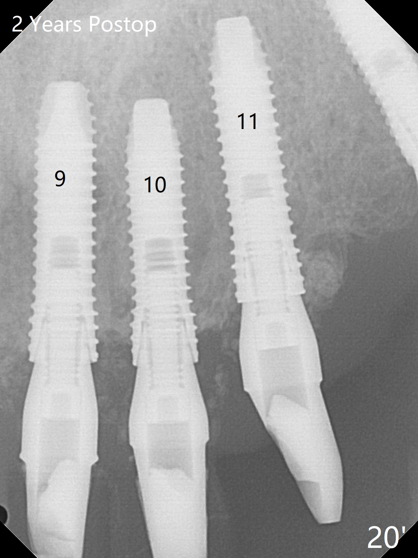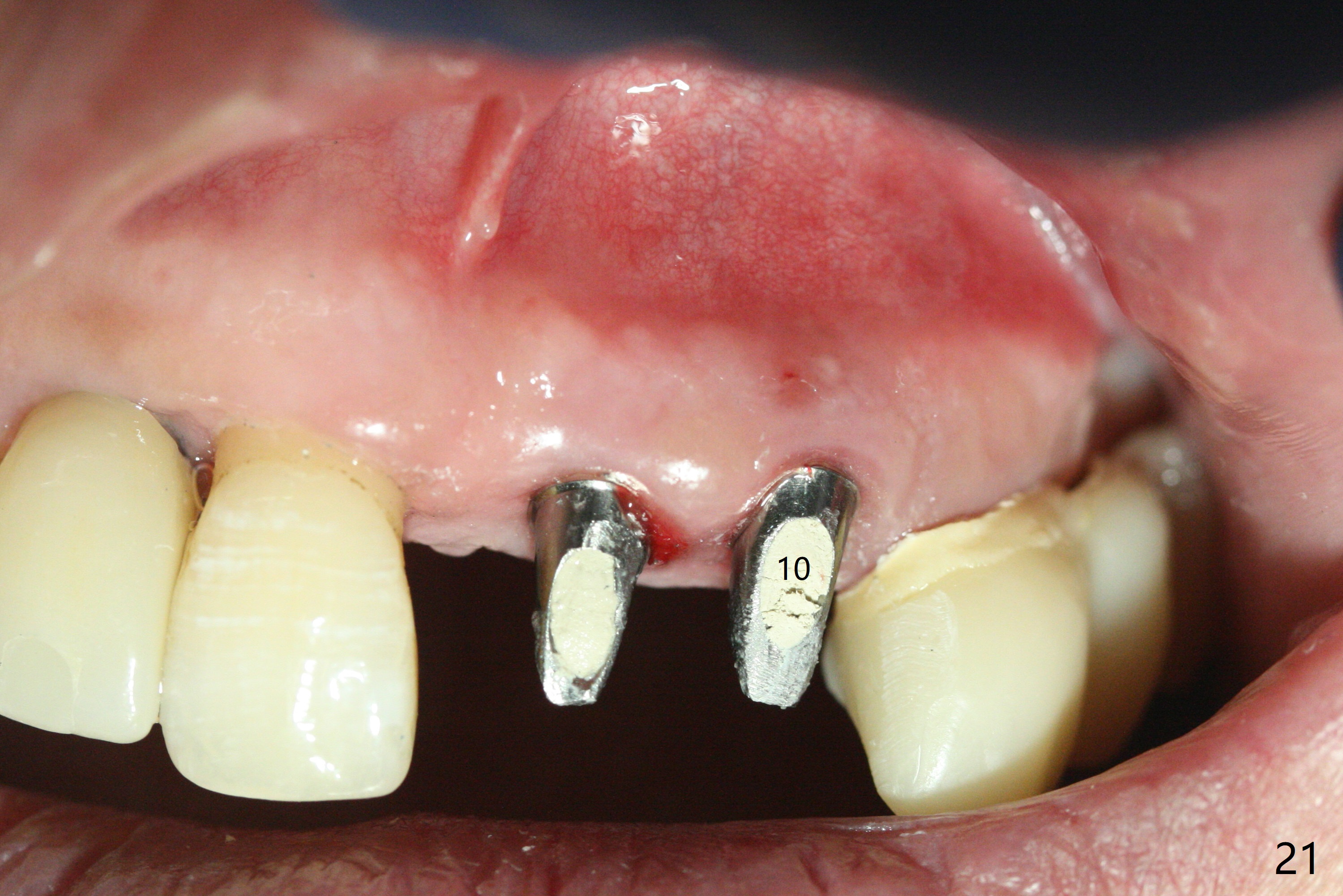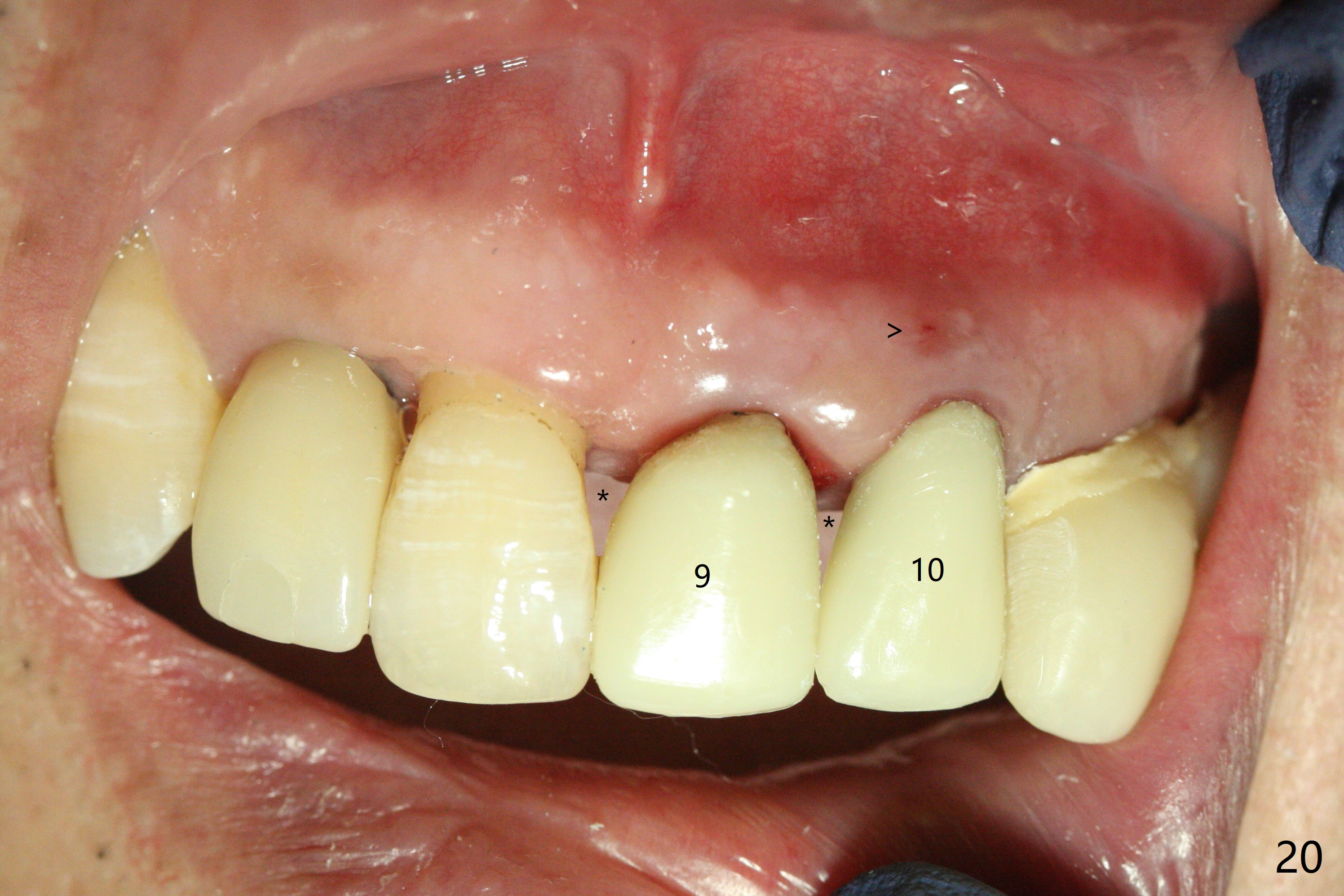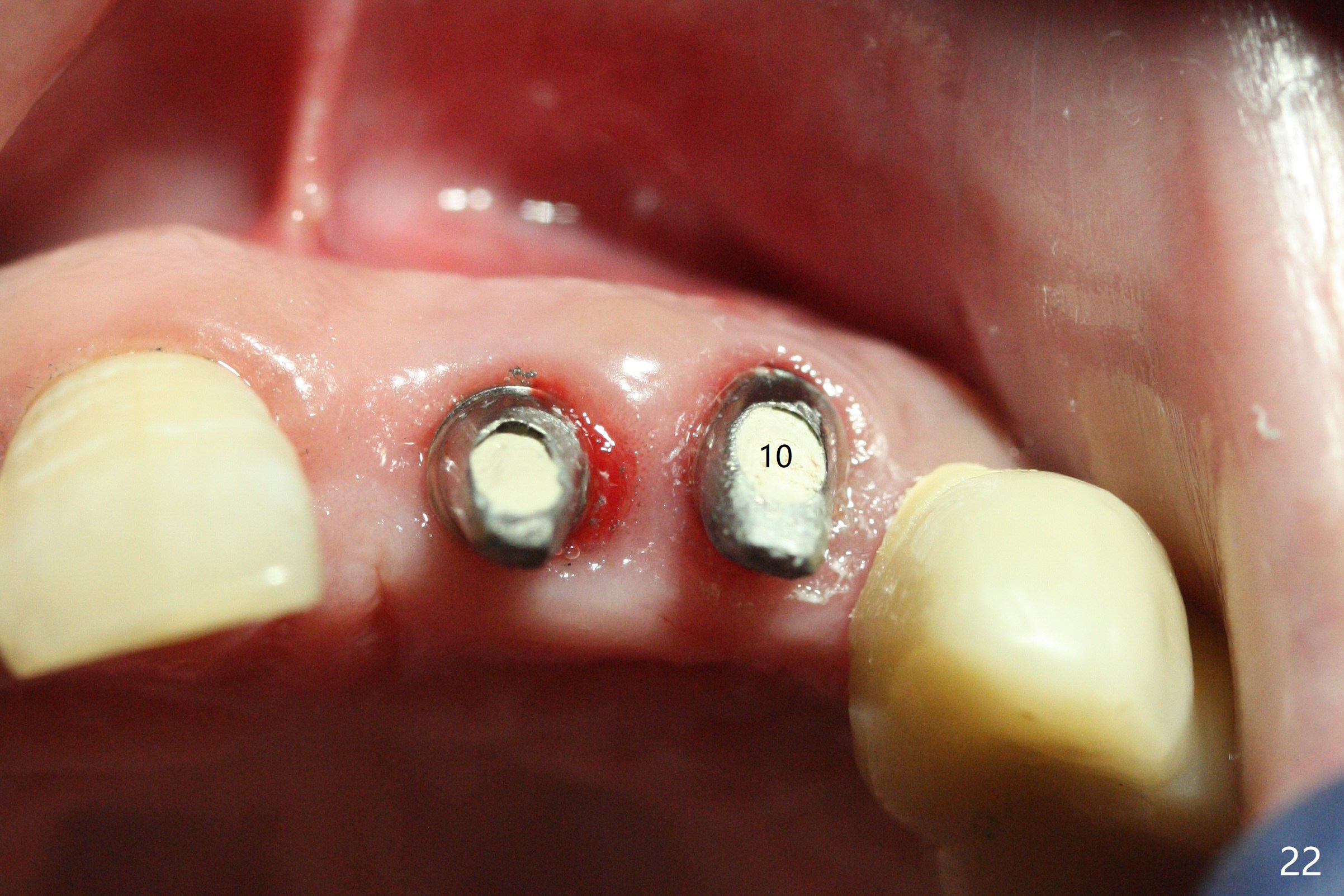 There is 1-2 thread exposure mesial and distal at #10 two years postop (Fig.20'), which may be related to the small fistula labially (Fig.20 >). It appears that the implant at #10 was placed too high (Fig.21) and labially (Fig.22). In fact the bridge fractures between #12 and 13 during pandemic.