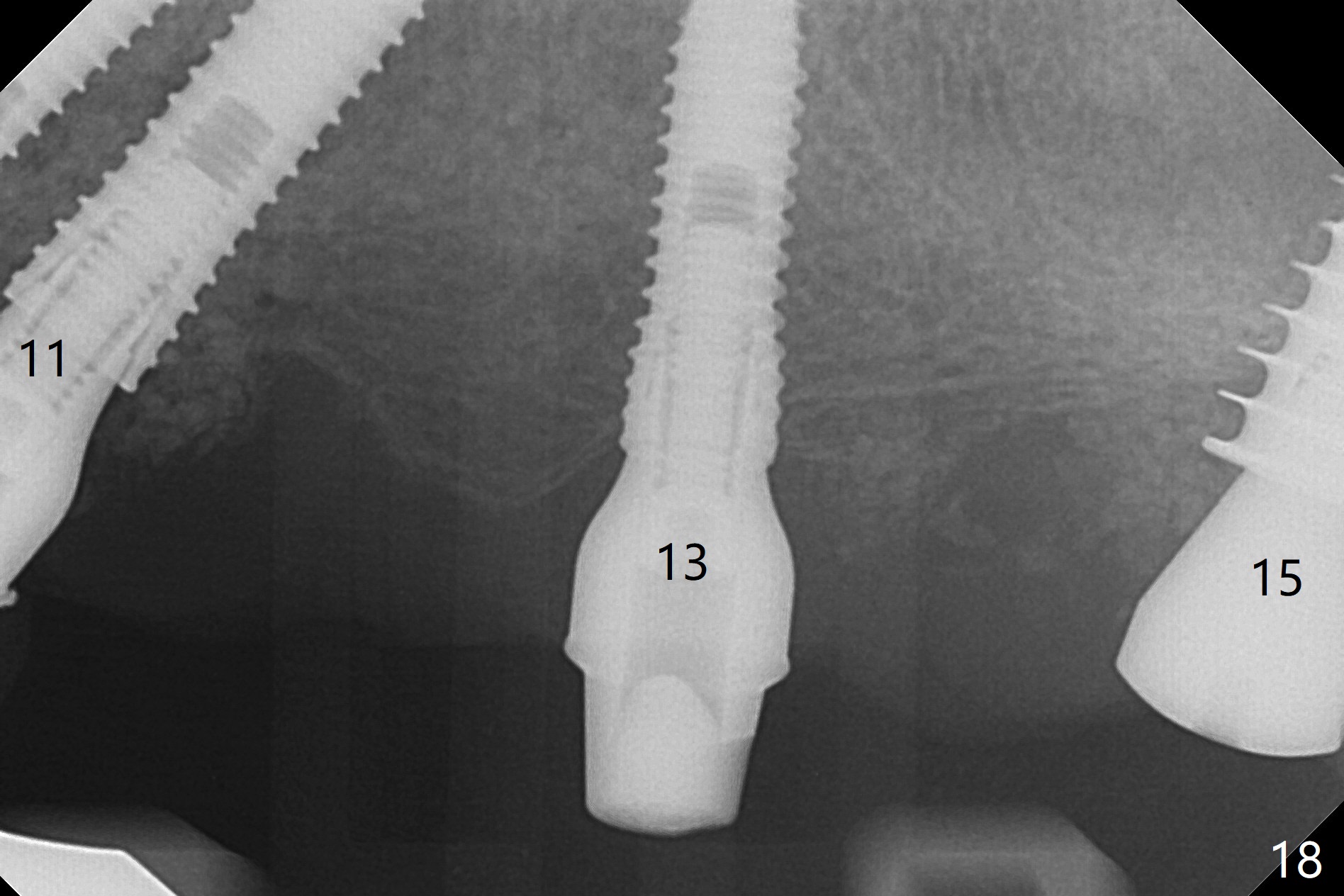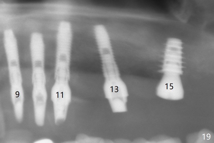 In fact angled abutments are used at #11 and 13 (4.5x15 degree (5 mm)A) with a straight abutment at #15 (5.5x4(4) mm).