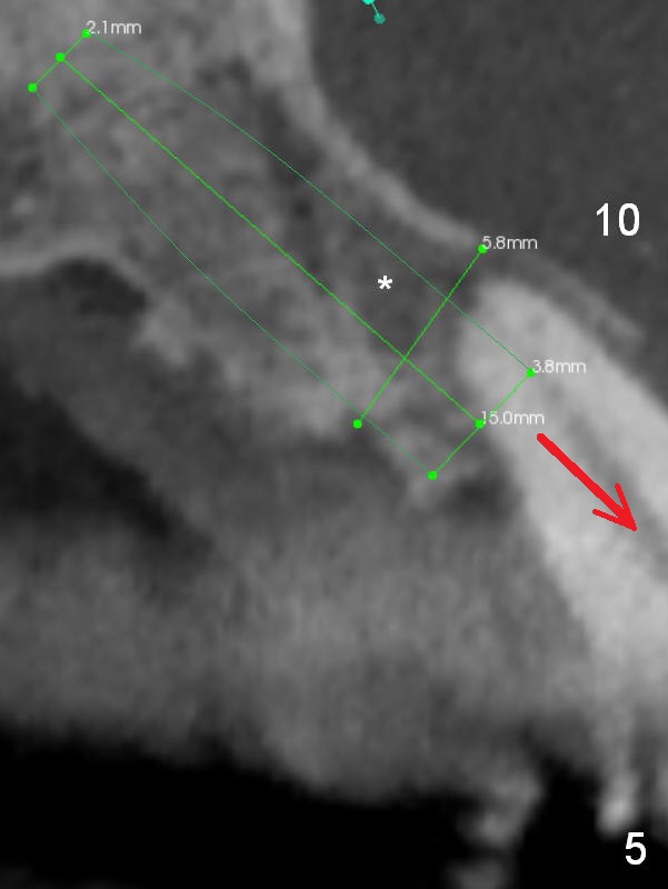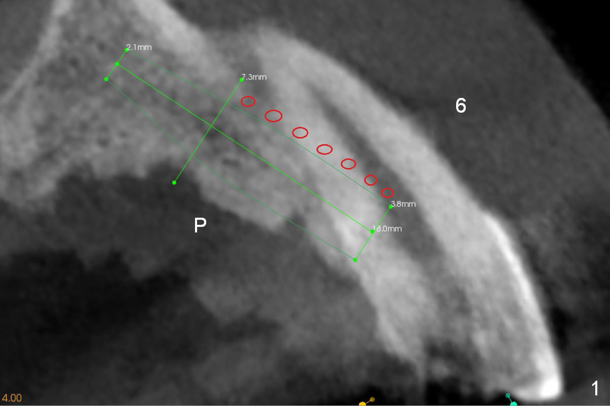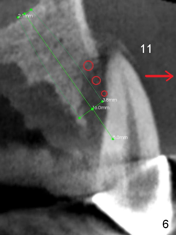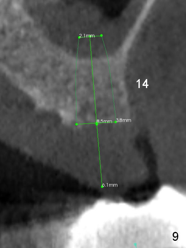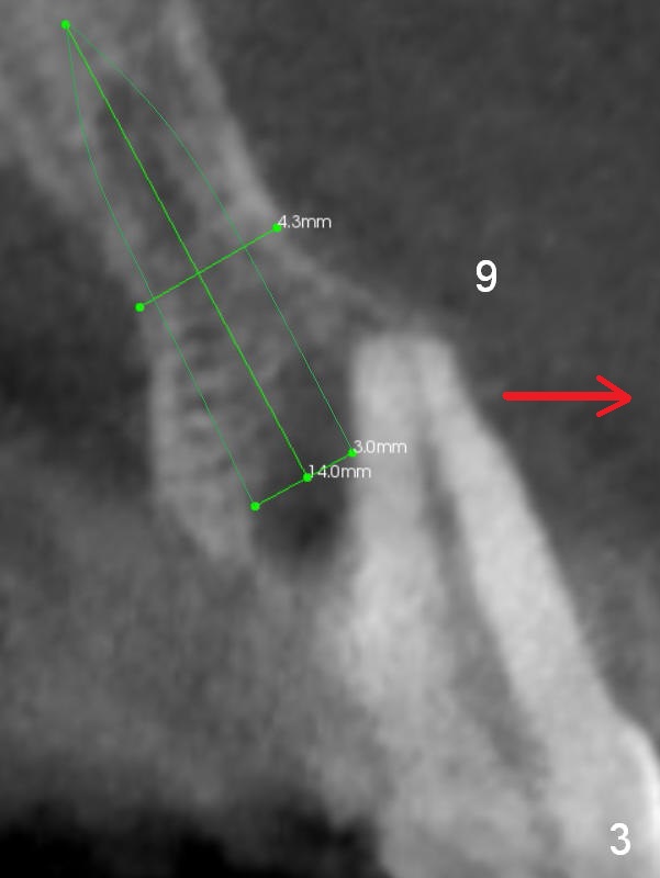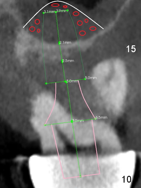 The bone width at #9 is narrow (Fig.3, as compared to Fig.2 for #8). Prepare SM (straight) and Tatum (angled) 1-piece implants. Try to place a 2-piece implant at #10 if possible (Fig.5, compare to Fig.4) so that FPDs and crowns can be converted to hybrid denture in the future.