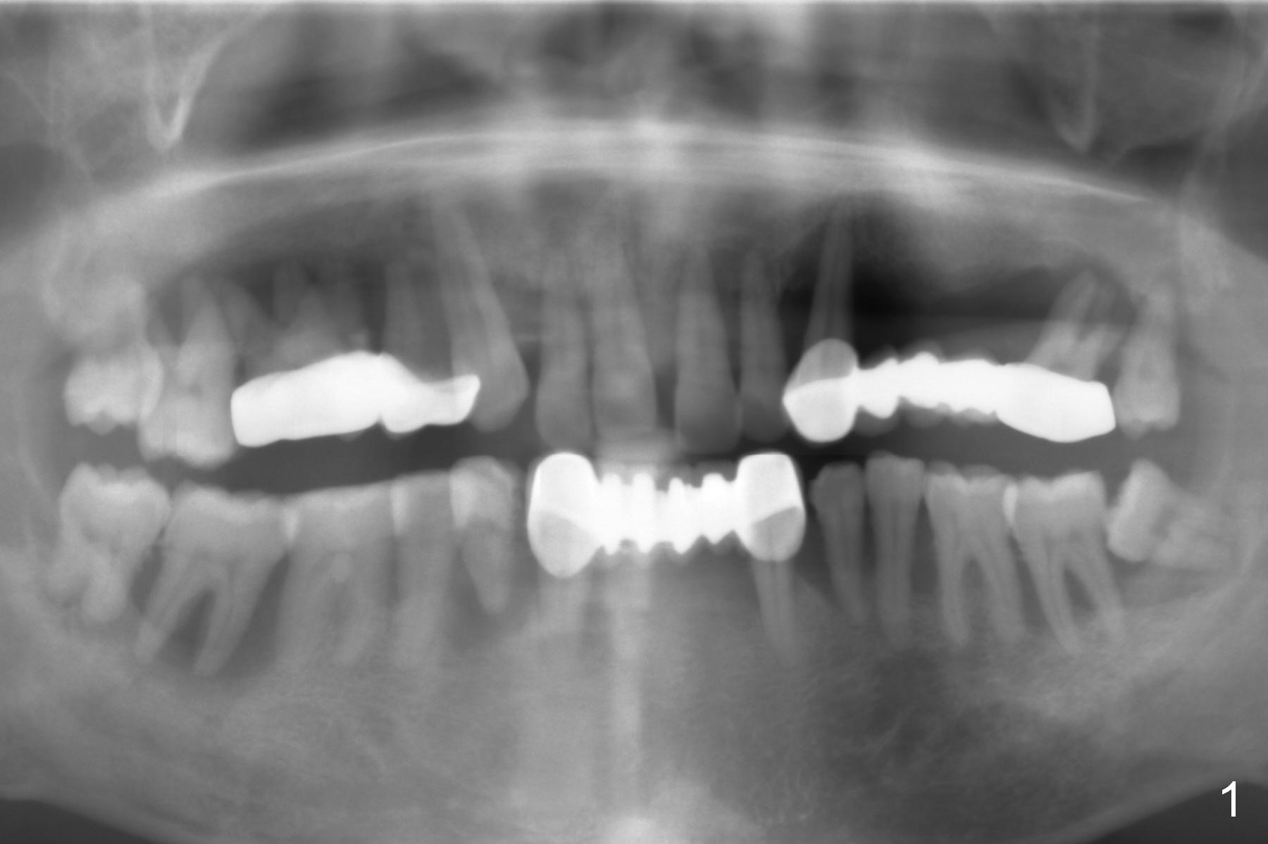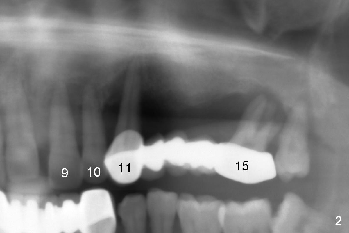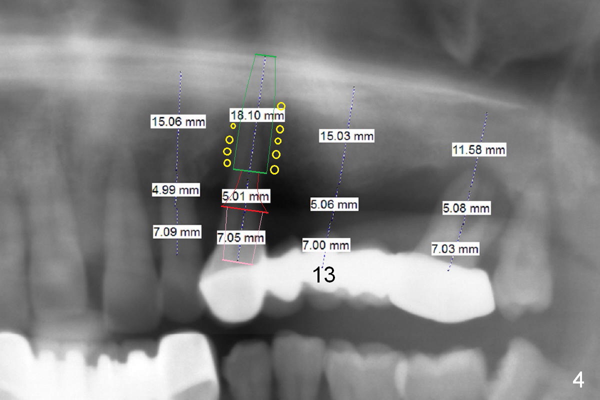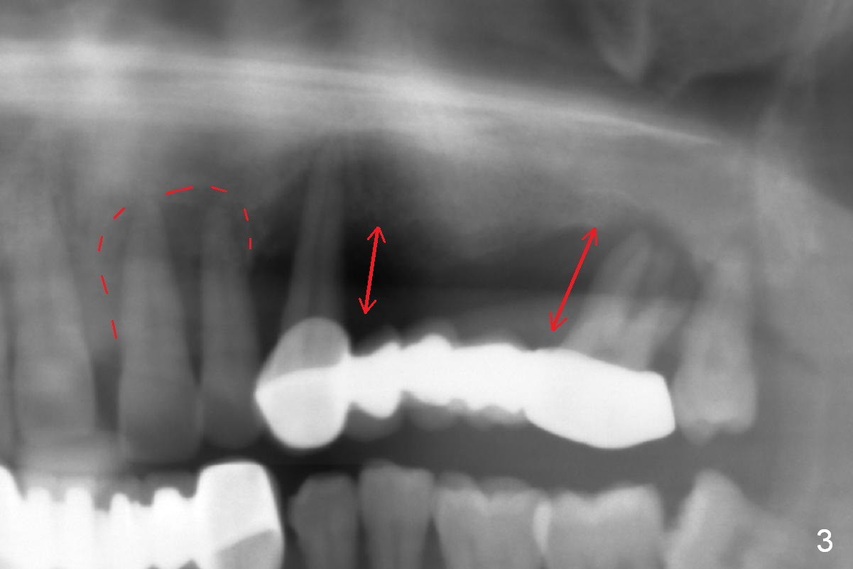 A 45-year-old man has advanced periodontitis and bruxism (sufficient remaining bone height, Fig.1). Full mouth restoration will be done by quadrant with preservation of a few of relatively healthy teeth. The 1st quadrant to be treated will be the upper left (Fig.2). The teeth #9-11 and 15 will be extracted (Metronidazole) with immediate implants. A delayed implant will be added at #13 for #11-15 bridge (Fig.4). In addition to the large radiolucency around the roots of #9 and 10 (Fig.3 red dashed line), the gingiva at #11 and 15 is excessively thick (red arrows). For example at #11, a long implant has to be placed a little more outside the bone (Fig.4 green area), since the longest cuff of the abutment (red area) is 5 mm for UF implant system. The longer the cuff, the less amount of the implant will be outside the bone with less chance of periimplantitis. When the coronal implant threads are exposed, a large amount of bone graft has to be placed (Fig.4 yellow circles).