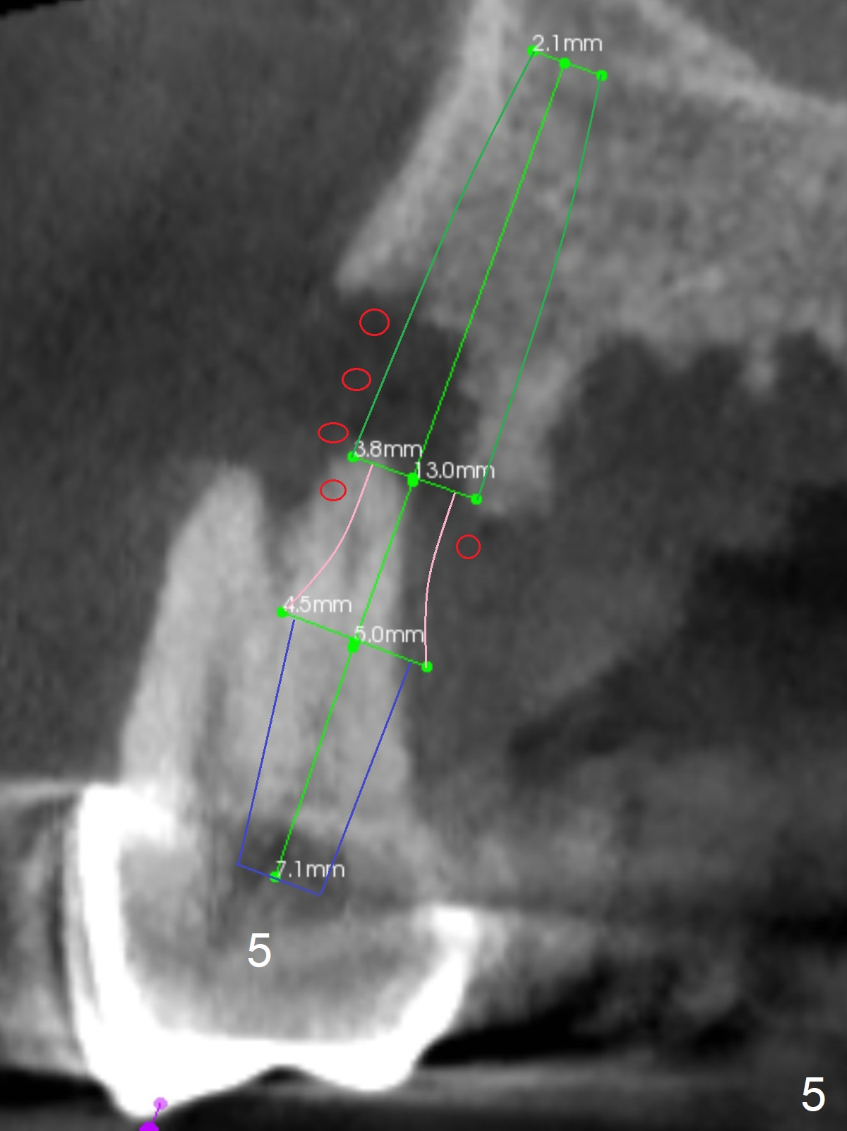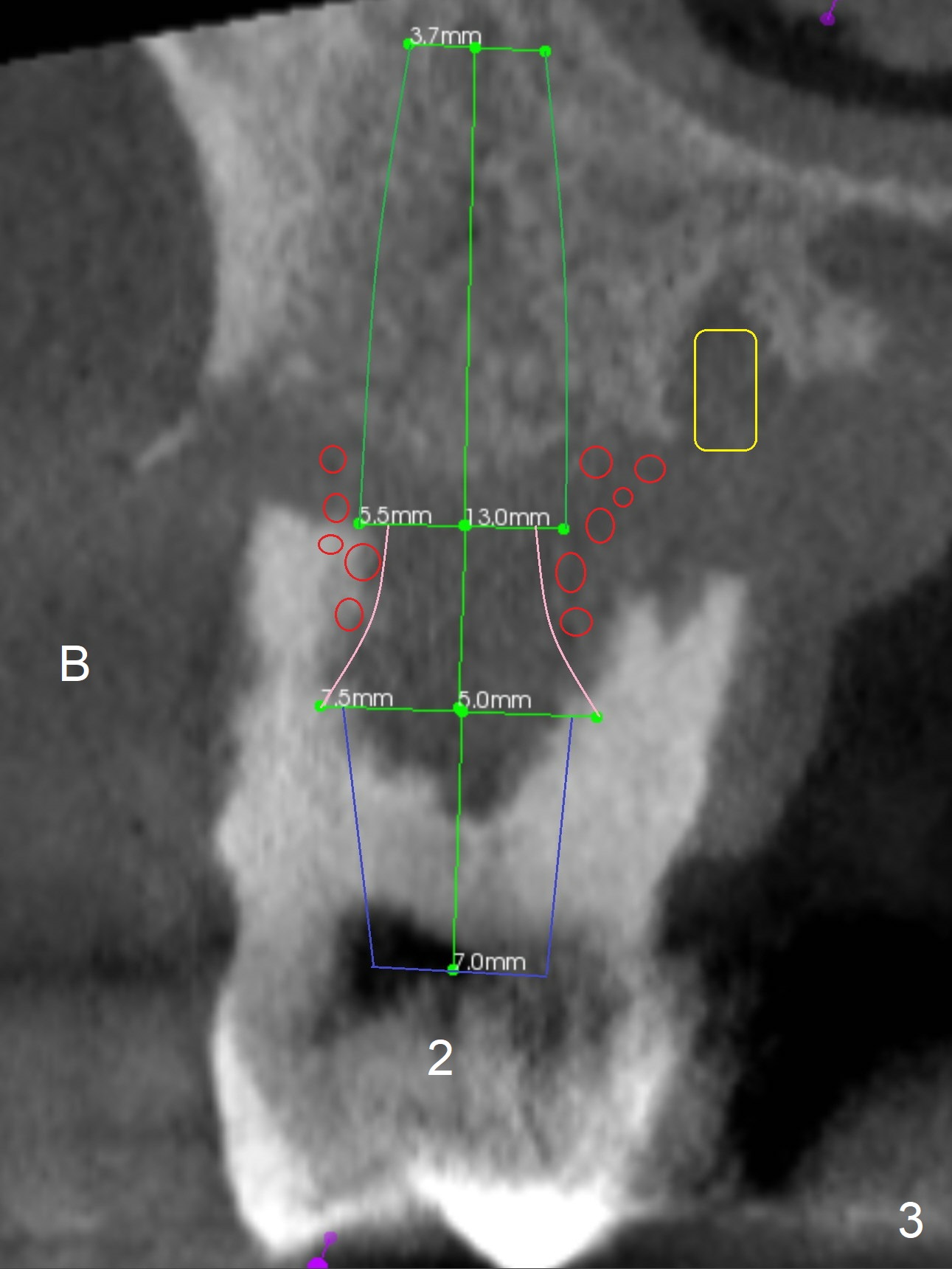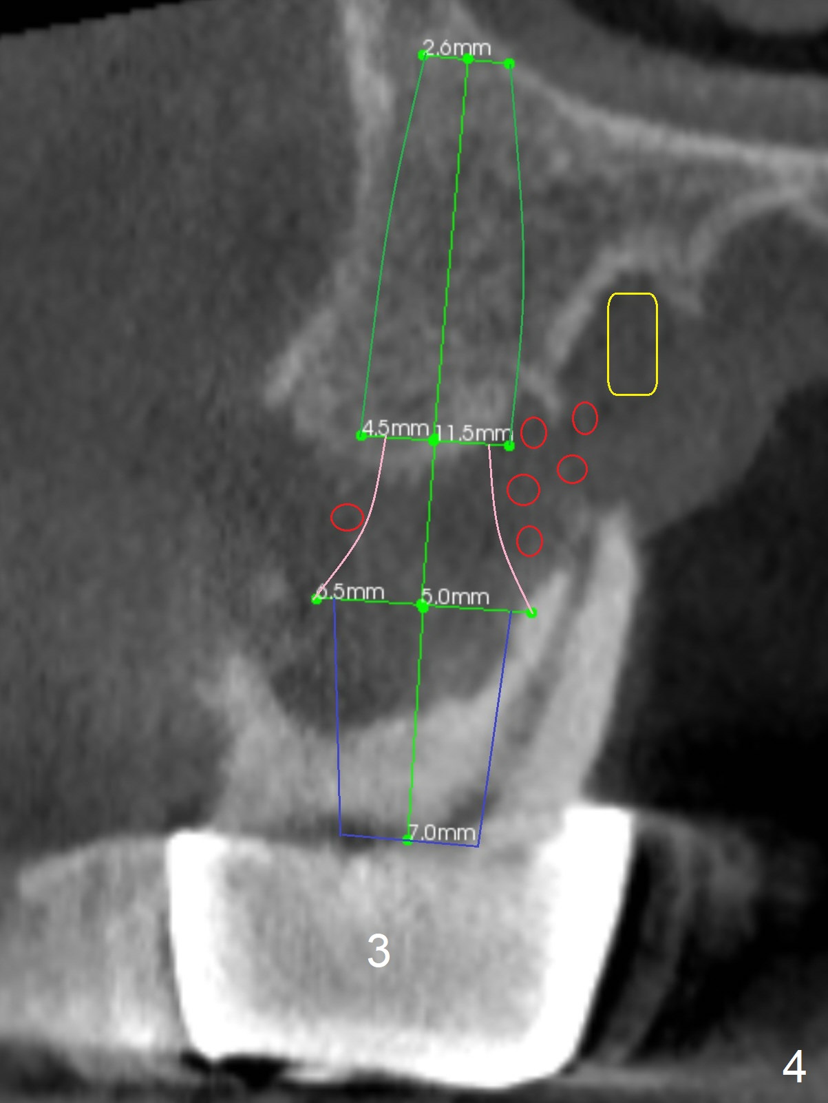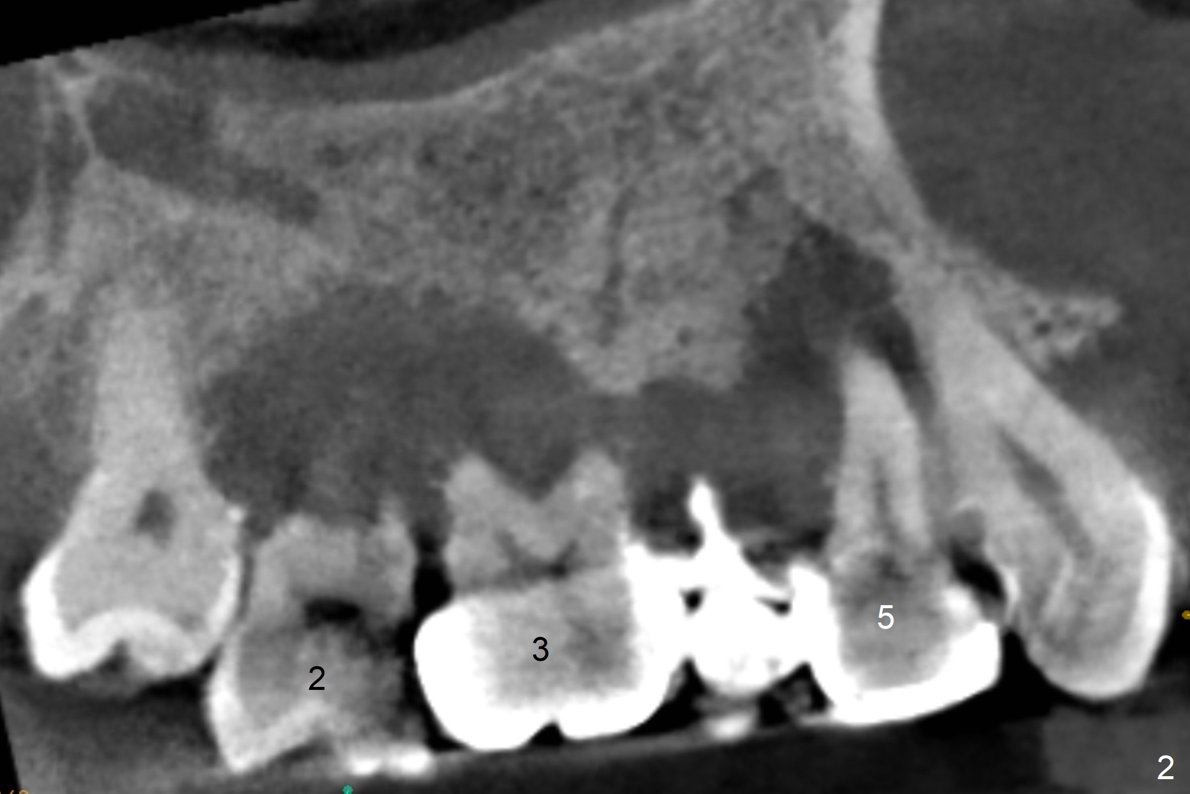 Extract #2 or remove #3-5 FPD first whichever is looser. Use the other as reference guide. Place Osteogen plug in the palatal socket of #2 ad 3 (Fig.3,4 yellow box) and allograft around the implants (red circles).