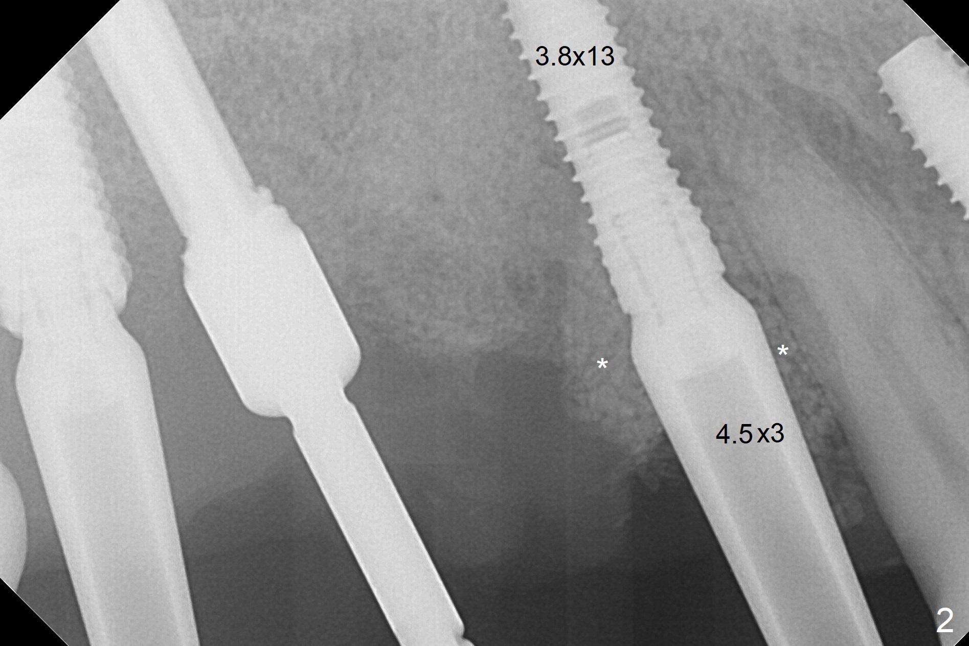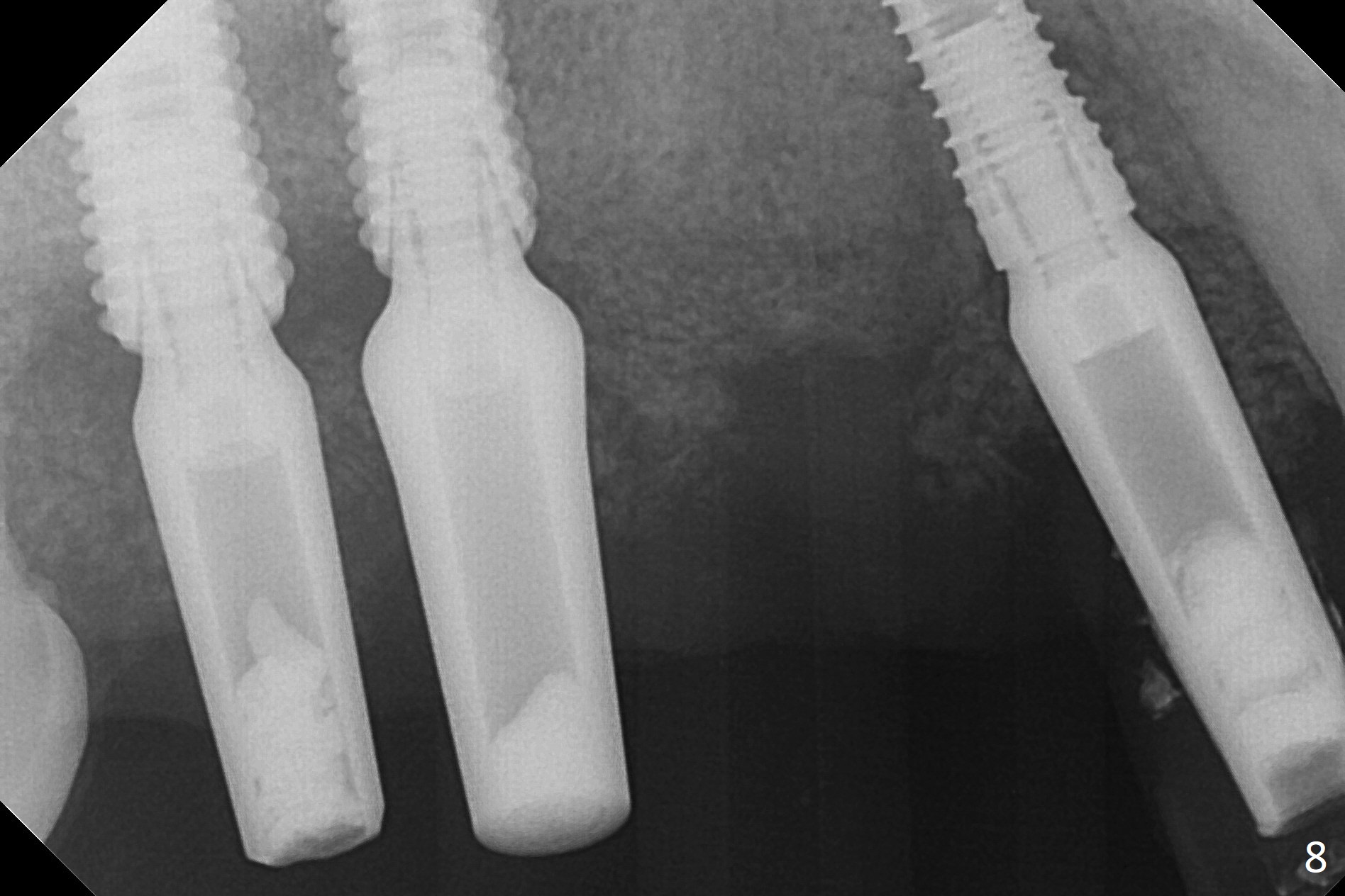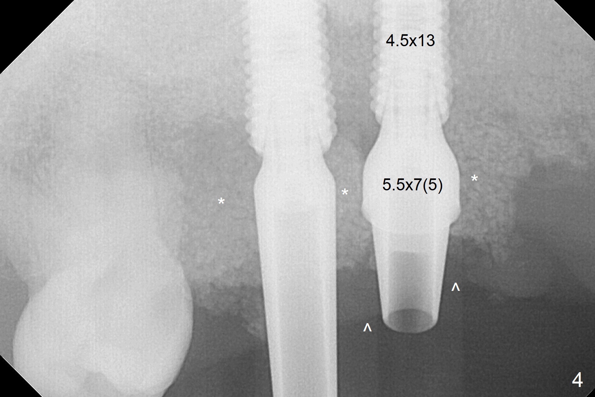 After extraction, the depths of initial osteotomy at #2, 3 and 5 are 13, 11.5 and 10 mm, respectively (Fig.1). Following adjustment of trajectory, a 3.8x13 mm UF implant is placed at #5 (Fig.2) with insertion of a 4.5x2 mm mill abutment as well as mineralized cortical/cancellous allograft (Vanilla, *). The mill abutment is chosen because the margin of a 5.5x7(5) mm cemented abutment is severely subgingival (Fig.4 at #3; ^ gingival margin). By the same token, a 4.5x3 mm mill abutment is placed at #2. In fact all of the 3 implants are placed 2-3 mm out of the bone (Fig.5). To prevent periimplantitis, abundant allograft is placed around the implants/abutments (Fig.2,4 *). Nearly 2 months postop, the mill abutment at #2 is adjusted for its height, while a 5.5x2.5 mm mill abutment is placed at #3 (Fig.6). To regain the buccal gingiva, the buccal margin of the provisional is shortened (Fig.6,7). Two weeks later, the gingival regrowth is not obvious (Fig.8 (nearly 3 months postop)). Local poor oral hygiene remains. A provisional FPD is fabricated. If his occlusion is normal for another 2 weeks, impression will be taken for upper (or UL) permanent restoration.