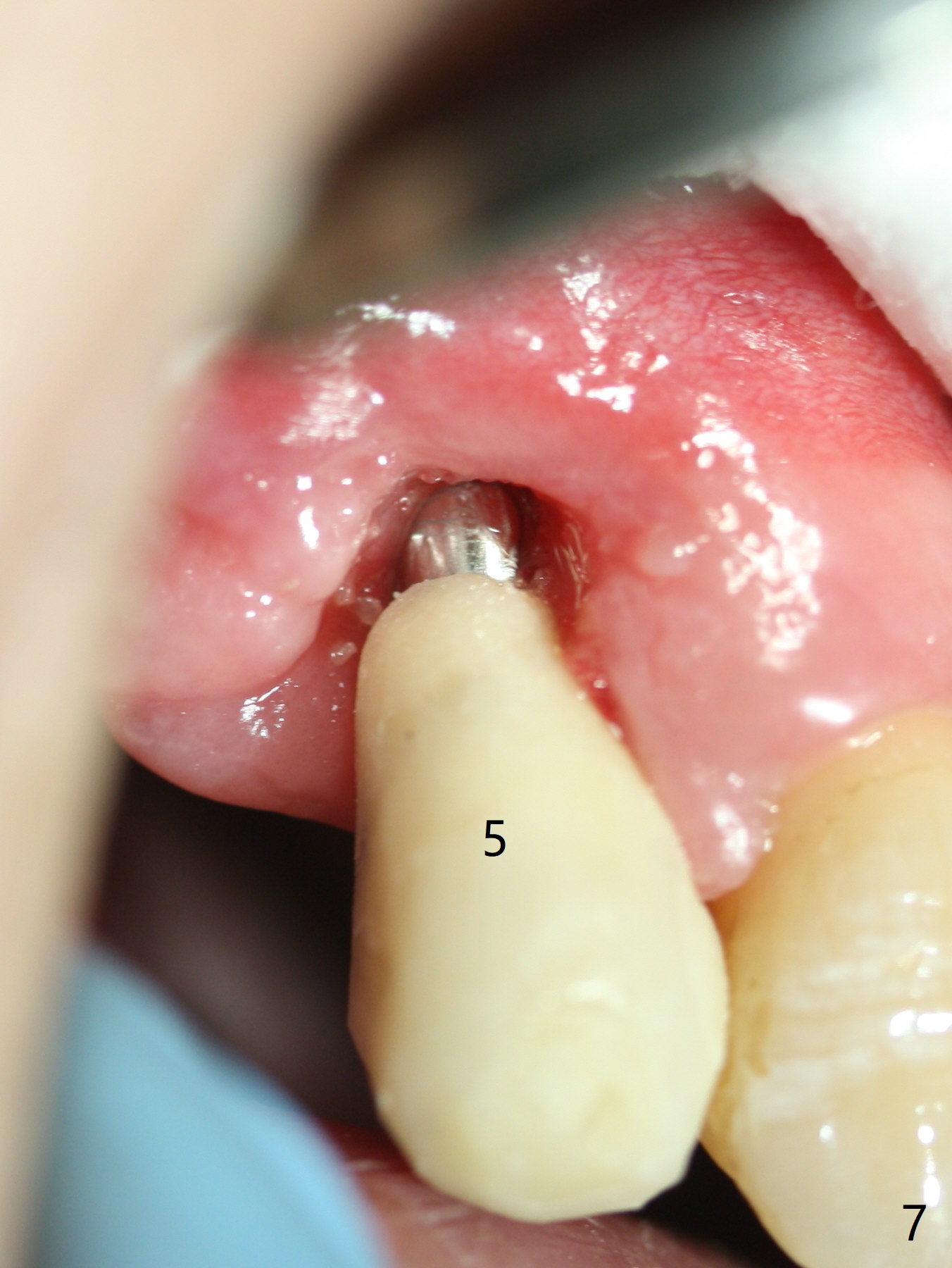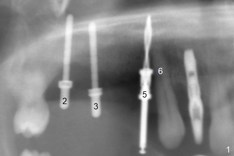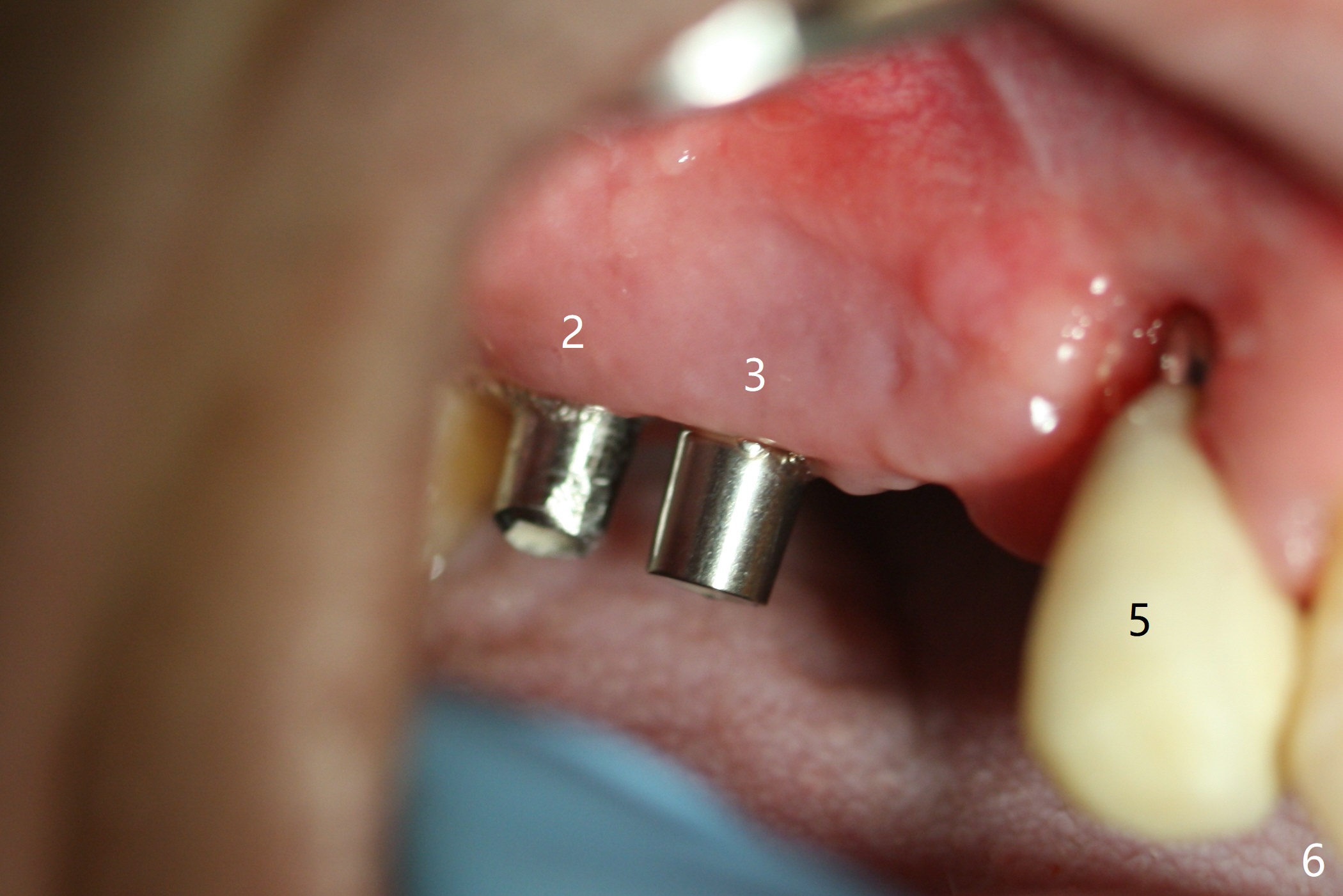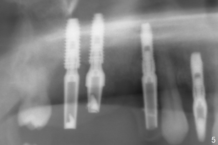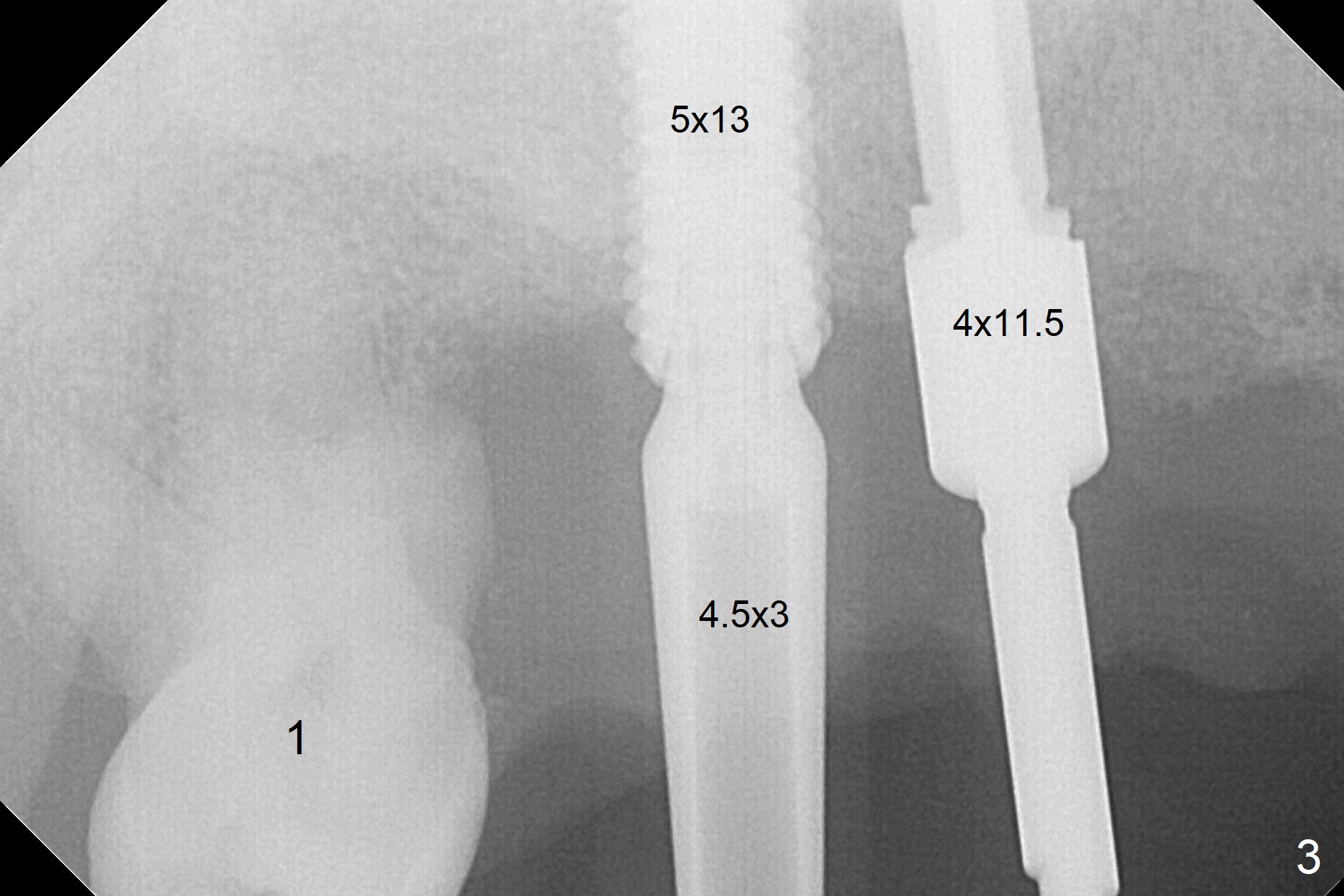 After extraction, the depths of initial osteotomy at #2, 3 and 5 are 13, 11.5 and 10 mm, respectively (Fig.1). Following adjustment of trajectory, a 3.8x13 mm UF implant is placed at #5 (Fig.2) with insertion of a 4.5x2 mm mill abutment as well as mineralized cortical/cancellous allograft (Vanilla, *). The mill abutment is chosen because the margin of a 5.5x7(5) mm cemented abutment is severely subgingival (Fig.4 at #3; ^ gingival margin). By the same token, a 4.5x3 mm mill abutment is placed at #2. In fact all of the 3 implants are placed 2-3 mm out of the bone (Fig.5). To prevent periimplantitis, abundant allograft is placed around the implants/abutments (Fig.2,4 *). Nearly 2 months postop, the mill abutment at #2 is adjusted for its height, while a 5.5x2.5 mm mill abutment is placed at #3 (Fig.6). To regain the buccal gingiva, the buccal margin of the provisional is shortened (Fig.6,7). Two weeks later, the gingival regrowth is not obvious (Fig.8 (nearly 3 months postop)). Local poor oral hygiene remains. A provisional FPD is fabricated. If his occlusion is normal for another 2 weeks, impression will be taken for upper (or UL) permanent restoration.
