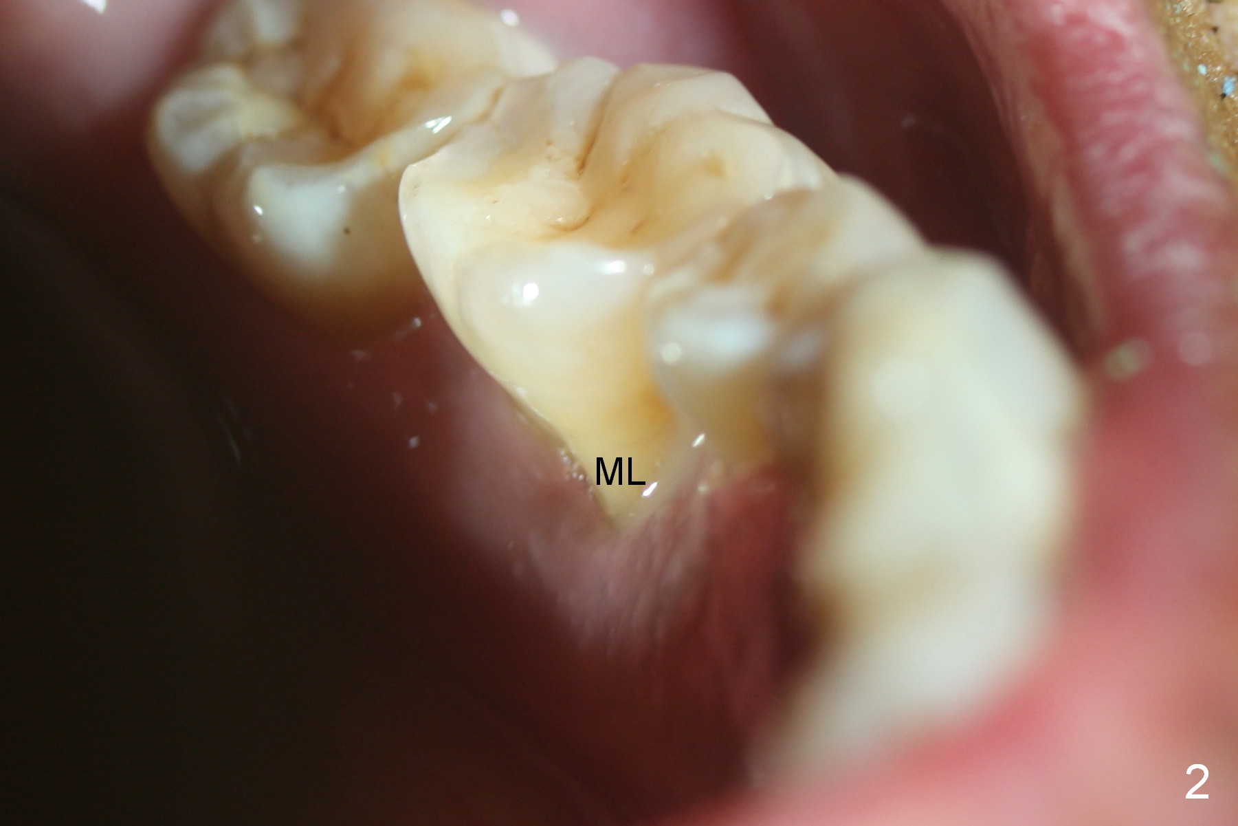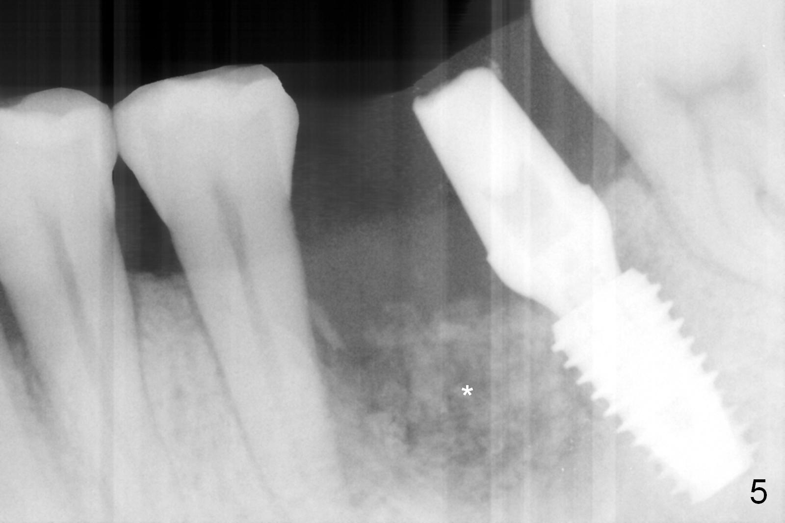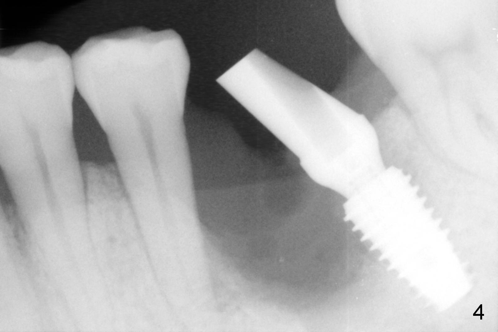 Considering the severe bone loss in the meisal socket, socket preservation is indicated if immediate implant is not feasible. Preop exam shows that the mesiobuccal gingival recession (Fig.1 MB) is not as severe as the mesiolingual one (Fig.2 ML). Because of oozing from the mesial socket, buccal envelop incision is made with flap raising to increase visibility. Probably due to periodontal infection, pain control is difficult. Osteotomy buccal to the Inferior Alveolar Canal proves to be risky. In addition, osteotomy in the mesial socket is more difficult than the distal one (Fig.3). Once the osteotomy depth is determined relative to the superior border of the Inferior Alveolar Canal (4 mm), the osteotomy depth increases by 2 mm. A 5.5x10 mm implant is placed with insertion torque ~ 35 Ncm (Fig.4); a 15 ° angled abutment (5.5 mm in diameter, 4 mm in cuff) is placed mesially. Then the abutment is turned lingually favorable for restoration (Fig.5), the remaining socket is filled with allograft/Osteogen (*) and Collagen Plug.