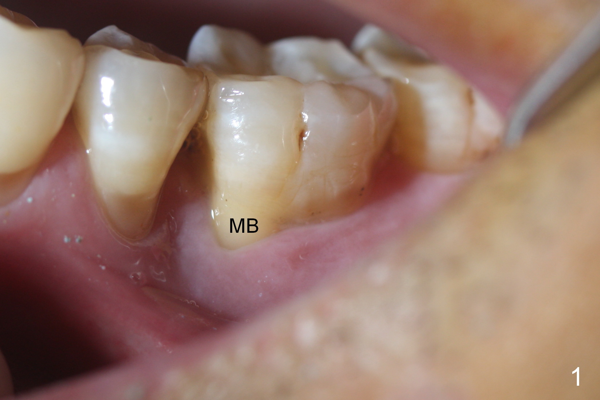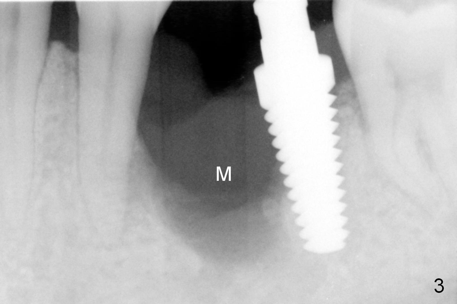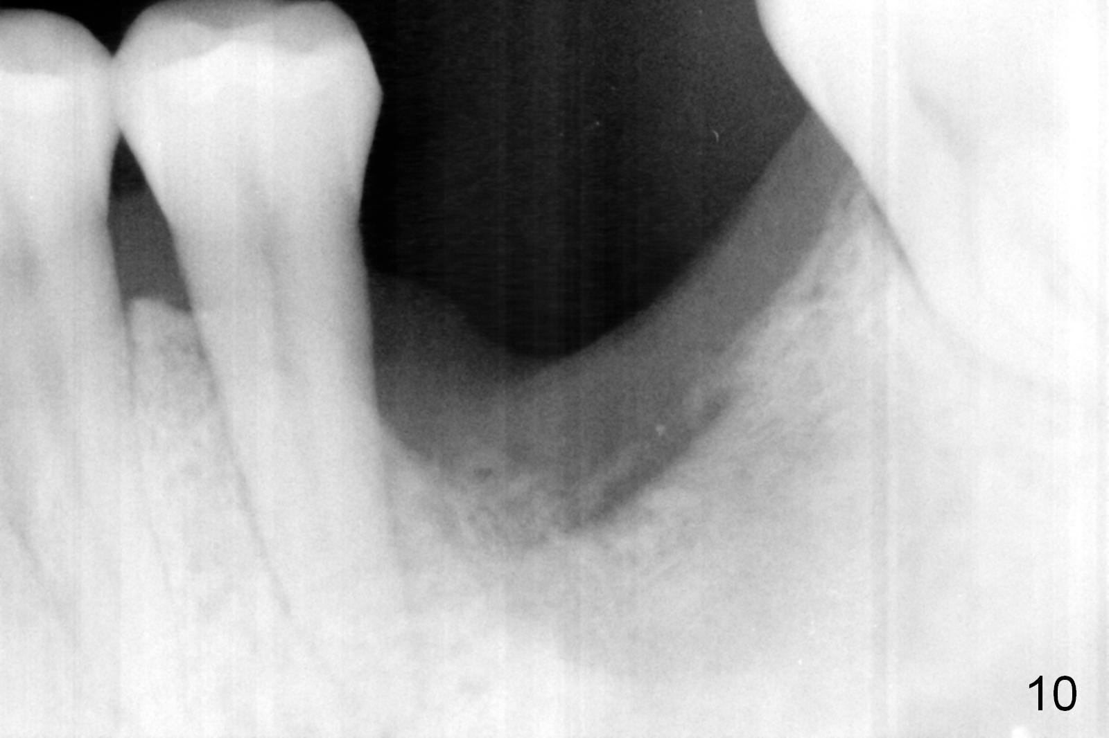 Considering the severe bone loss in the meisal socket, socket preservation is indicated if immediate implant is not feasible. Preop exam shows that the mesiobuccal gingival recession (Fig.1 MB) is not as severe as the mesiolingual one (Fig.2 ML). Because of oozing from the mesial socket, buccal envelop incision is made with flap raising to increase visibility. Probably due to periodontal infection, pain control is difficult. Osteotomy buccal to the Inferior Alveolar Canal proves to be risky. In addition, osteotomy in the mesial socket is more difficult than the distal one (Fig.3). Once the osteotomy depth is determined relative to the superior border of the Inferior Alveolar Canal (4 mm), the osteotomy depth increases by 2 mm. A 5.5x10 mm implant is placed with insertion torque ~ 35 Ncm (Fig.4); a 15 ° angled abutment (5.5 mm in diameter, 4 mm in cuff) is placed mesially. Then the abutment is turned lingually favorable for restoration (Fig.5), the remaining socket is filled with allograft/Osteogen (*) and Collagen Plug.