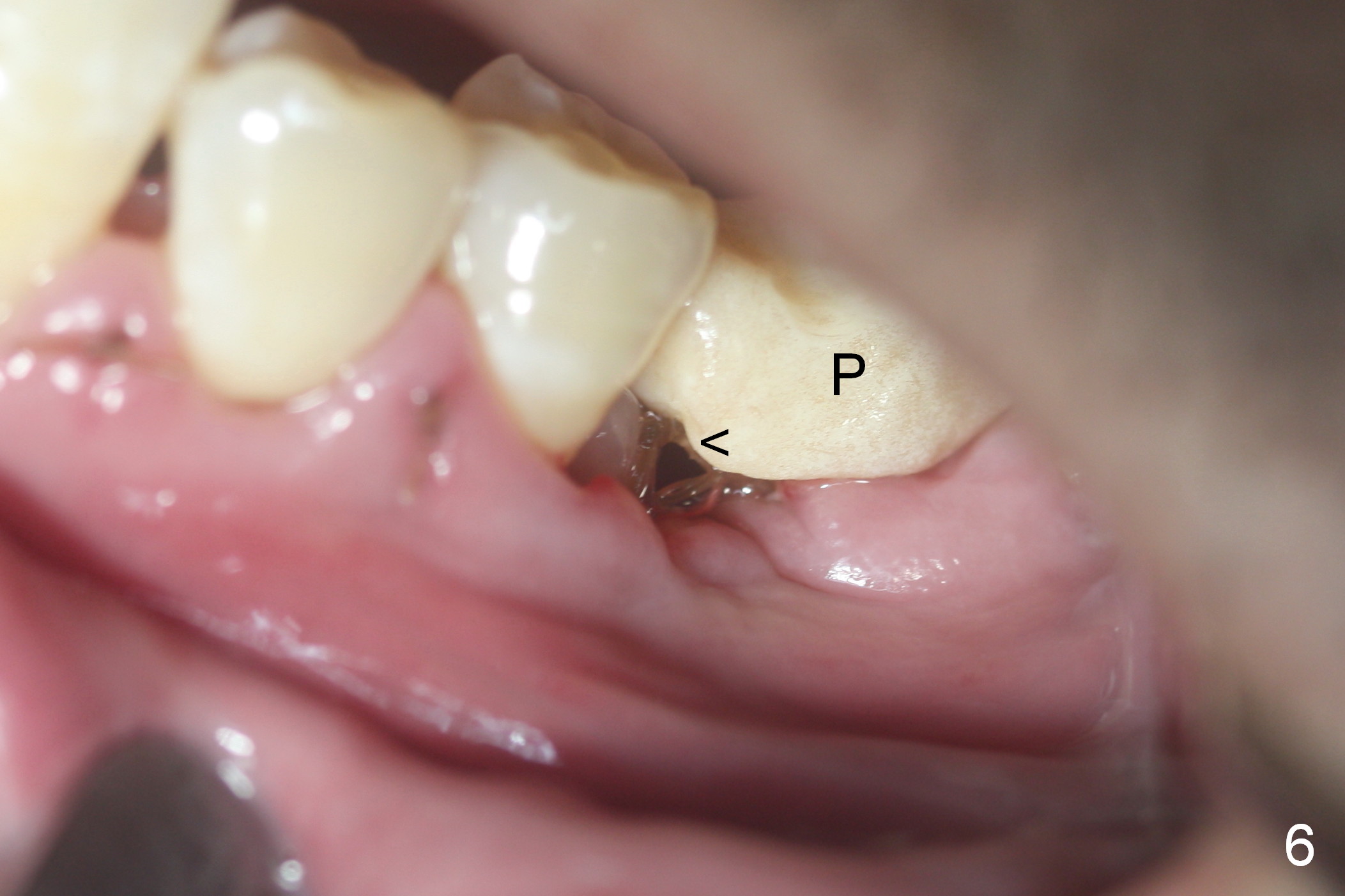 The patient is doing well postop. The mesial socket appears to have collapsed 7 days postop (Fig.6 <). The mesial portion of the immediate provisional (P) should have been overbuilt to compensate for the socket with lost buccal and lingual plates.