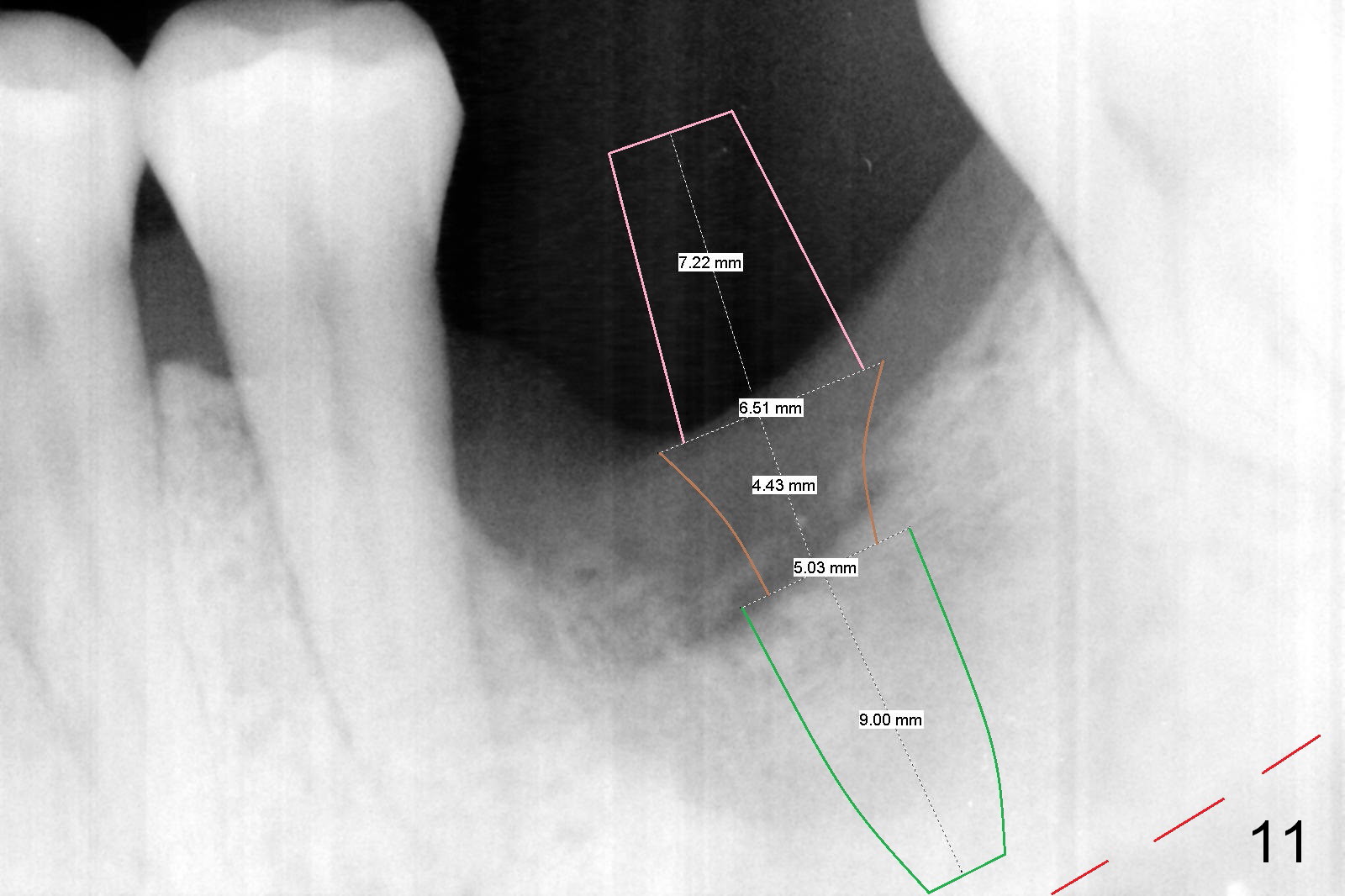 There is bone growth in the mesial socket 5 months post graft (Fig.10). Use Magic Split to get access and test bone density (which must be low or medium in the upper portion). Use drills beyond the socket if necessary. Crown/implant ratio is unfavorable (Fig.11); so progressive loading is essential.