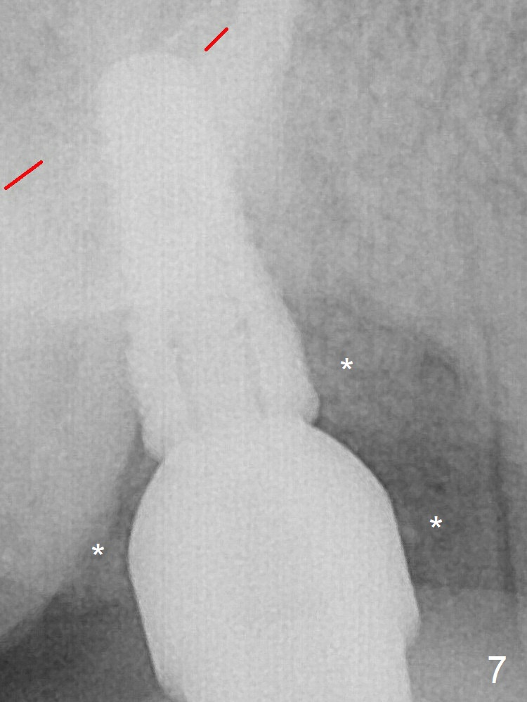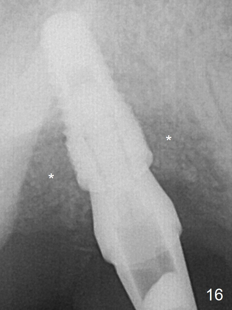 The 4.5x10 mm SM implant appears to have penetrated the sinus floor for primary stability (Fig.7 red dashed line). *: bone graft around the coronal portion and the implant and the apical portion of the abutment (6.8x5.5(6) mm). There is no loss of bone graft 3 months postop (Fig.16 (abutment: 4.8x7(4.5) mm)).