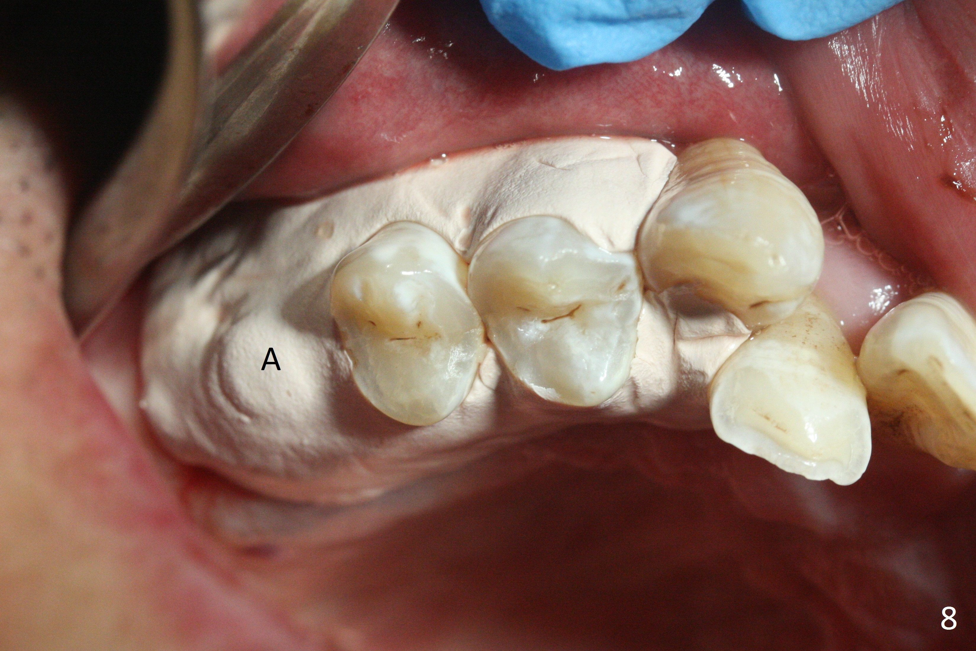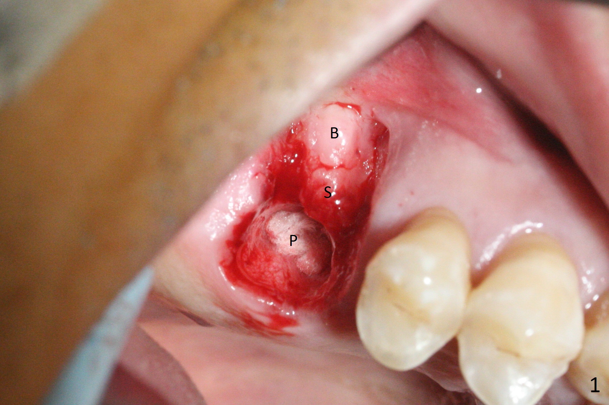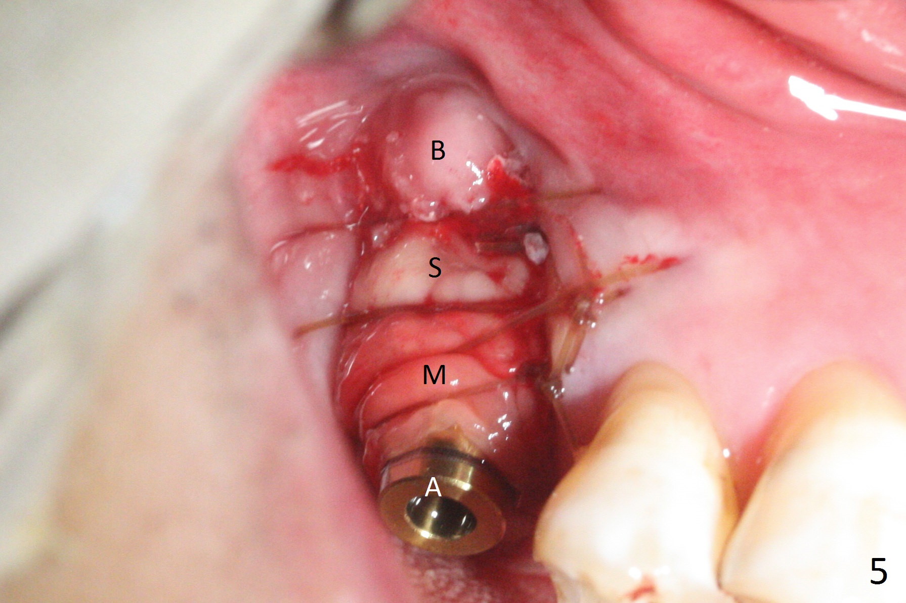 The palatal socket (Fig.1 P, packed with gauze) is intact, but implant trajectory may not be ideal. Buccal to the palatal socket are 2 pieces of the gingiva, buccal (B) and Septal (S). After the septal gingiva is pushed buccally (Fig.2 arrow), the underlying sloped septal bone is exposed (Fig.3 white area). Osteotomy is established as palatal as possible (Fig3 black circle) using DIO Sinus Master Kit, supplemented by Tatum osteotomes and DIO SM 3.8 mm tap drill for final sinus lift (Fig.4). Following further osteotomy using 4.1 and 4.5 mm taps, a 4.5x10 mm implant (Fig.6,7) with insertion torque >65 Ncm. Due to buccal bone loss, the coronal buccal threads are exposed 1-2 mm, which is covered by combination of allograft, autogenous bone and Osteogen. Prior to implantation, PRF plug and bone graft are used for sinus lift. The septal gingiva now is approximately 1-2 mm coronal to the implant plateau (Fig.5 S). The most coronal buccal gingival defect is covered by 3 pieces of PRF membrane (Fig.5 M) against a 6.8x5.5(6) mm abutment (A). Finally the socket is protected by periodontal dressing (Fig.8).