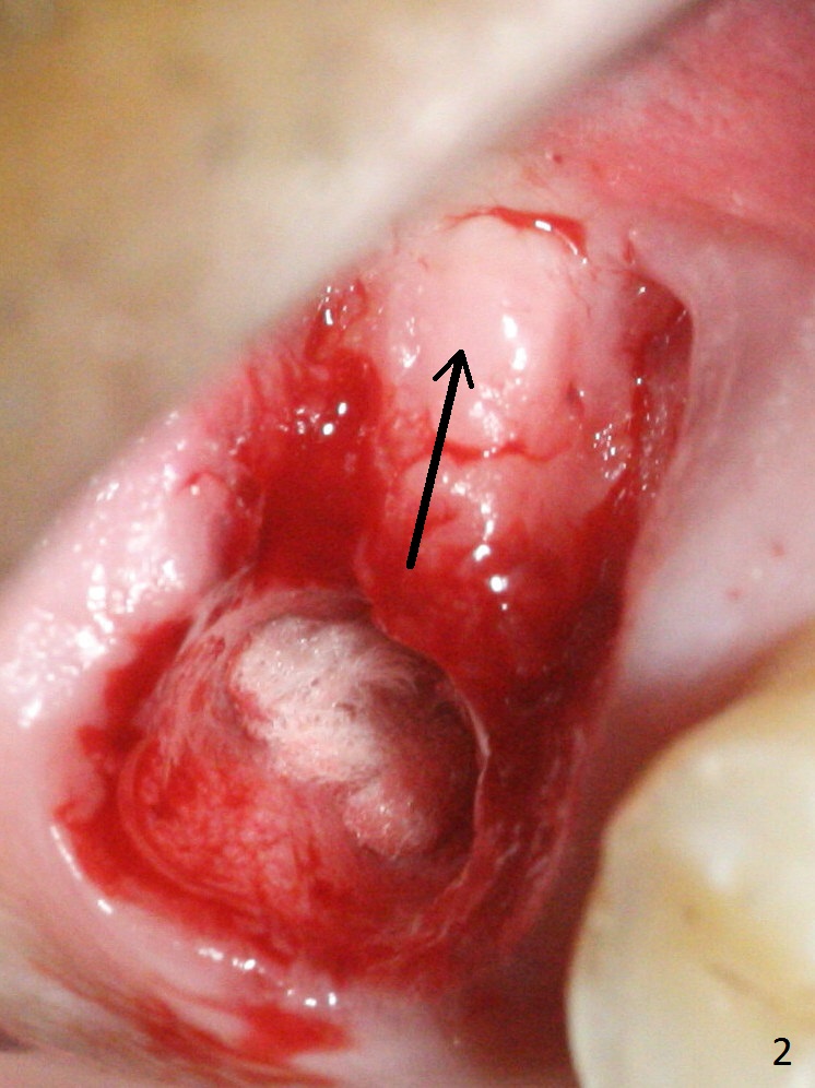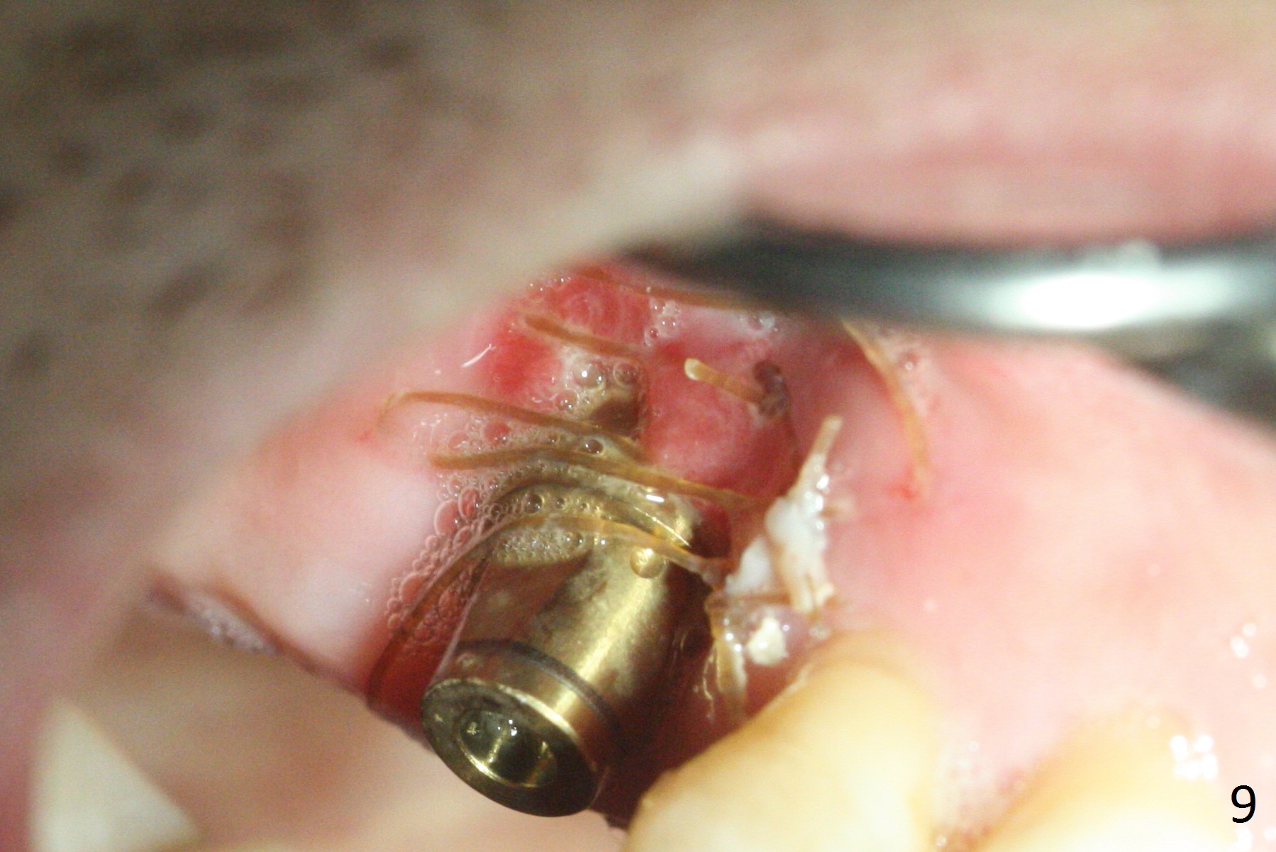 The distopalatal portion of the periodontal dressing dislodges 10 days postop. It appears after removal of the remaining dressing that PRF membranes has dissolved, while the remaining buccal and septal gingiva is healing (Fig.9). The wound leaves open for secondary healing.