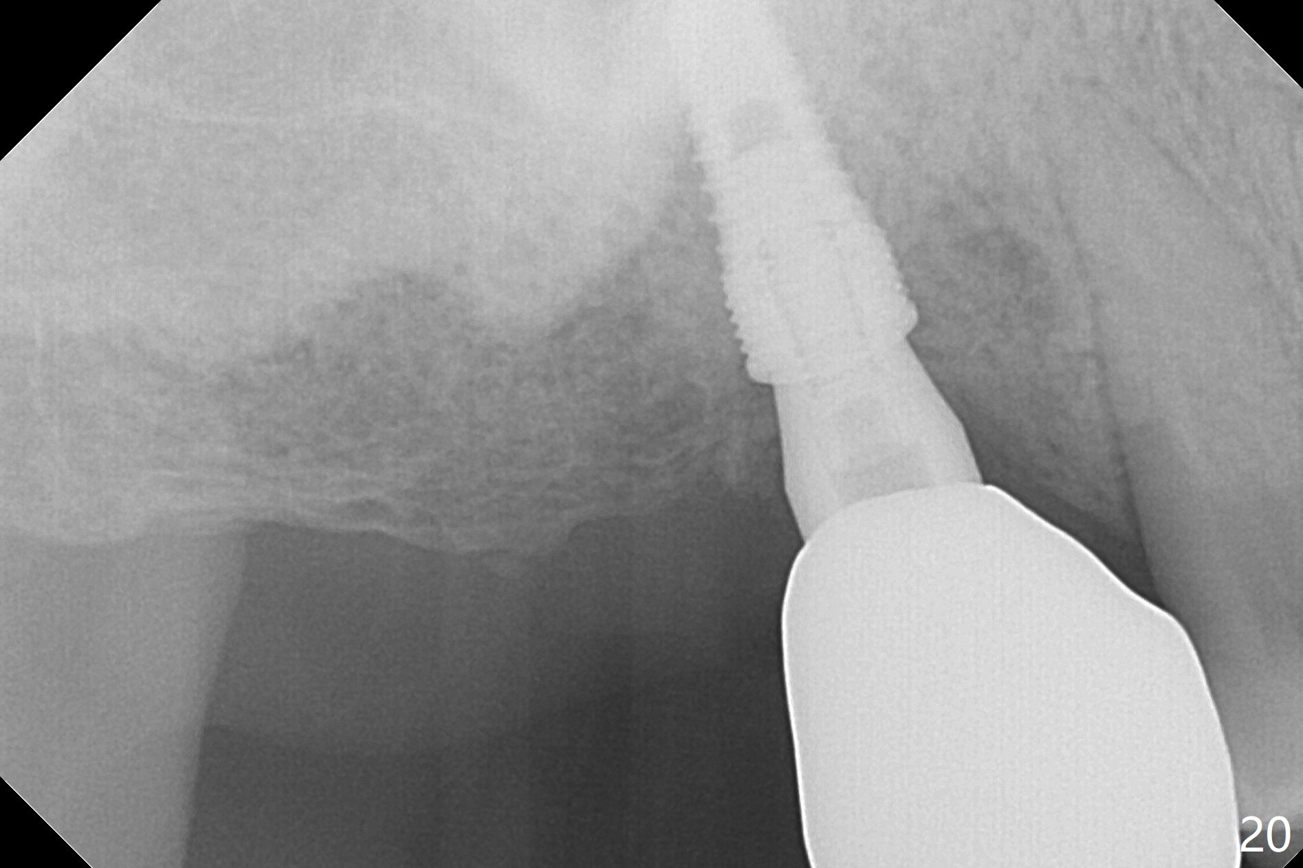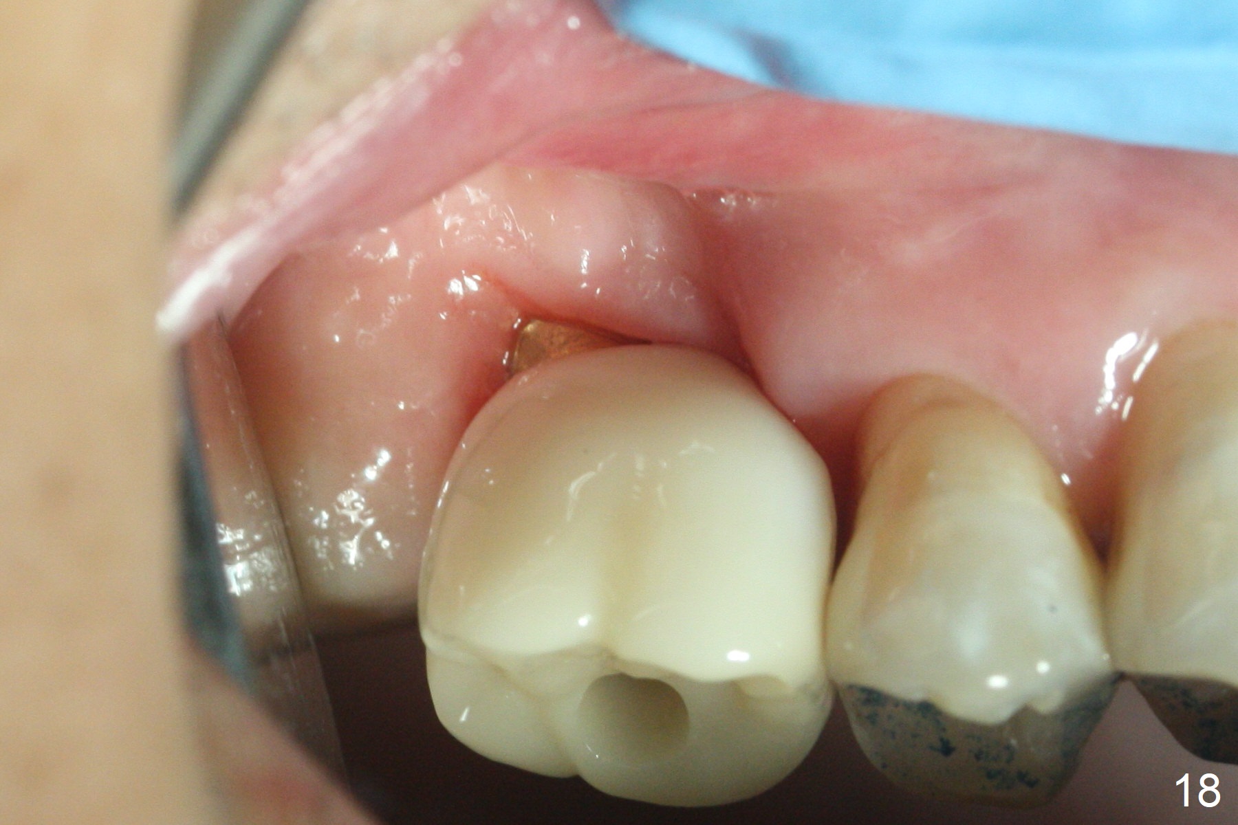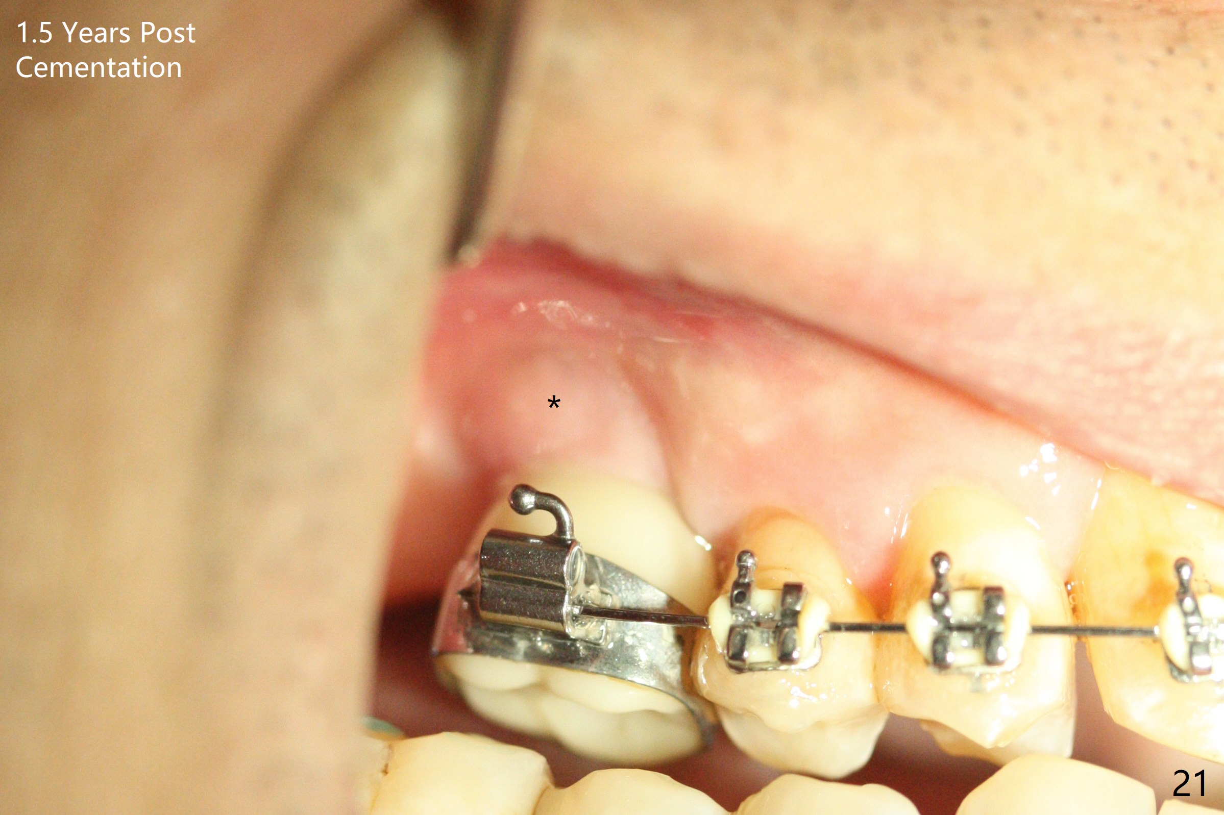 Two weeks later, the buccal gingiva appears to have grown downward (Fig.13). Fig.14 is taken when the provisional is removed. To facilitate this process, change abutment from 4.8x7(3) to (4.5) mm and a new provisional is fabricated (Fig.15): note the metal exposure distobuccally. When the patient returns in another two week, the gap should be able to disappear. There is no loss of bone graft 3 months postop (Fig.16). Two weeks later (3.5 months postop), the margin of the abutment is supragingival buccally and subgingival palatally (Fig.17,18). The gingiva seems to have migrated downward (Fig.19 arrow), while the bone density around the coronal implant appears to increase 5.5 months post cementation (Fig.20). There is buccal swelling with purulent discharge 1.5 years post cementation (Fig.21). Perimplantitis develops. Tuberosis bone graft will be performed when the limited ortho is finished.