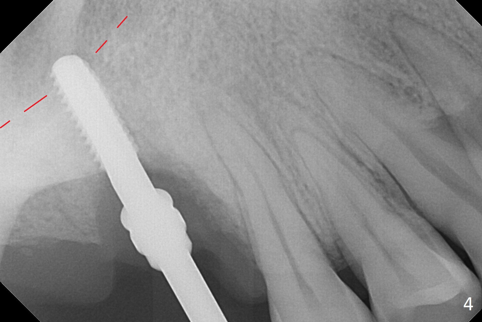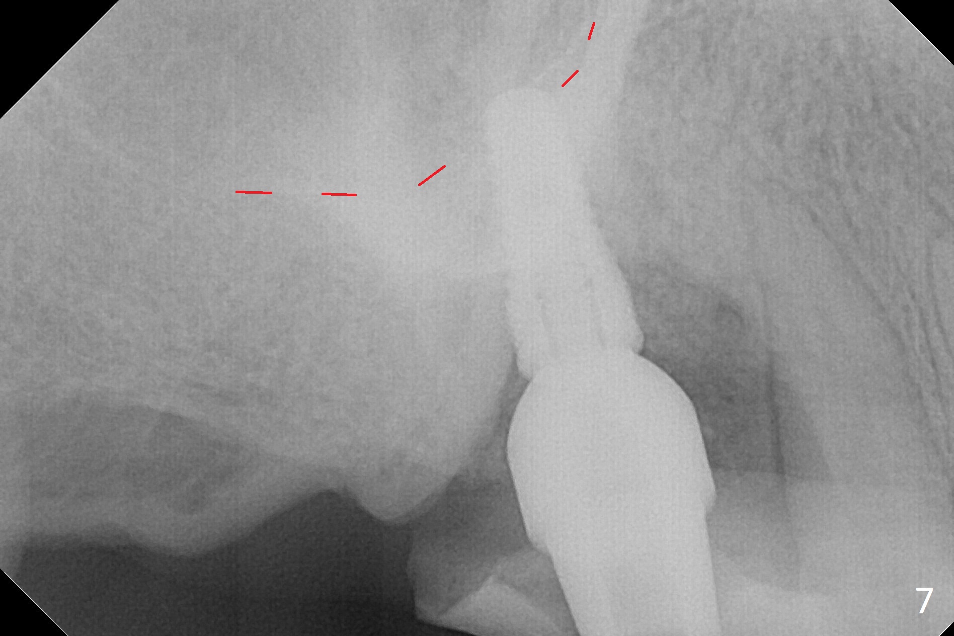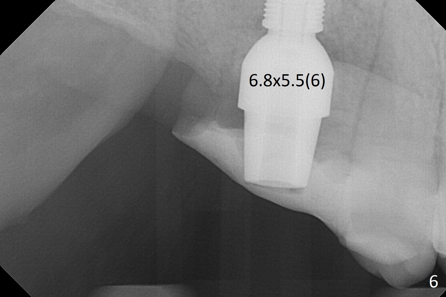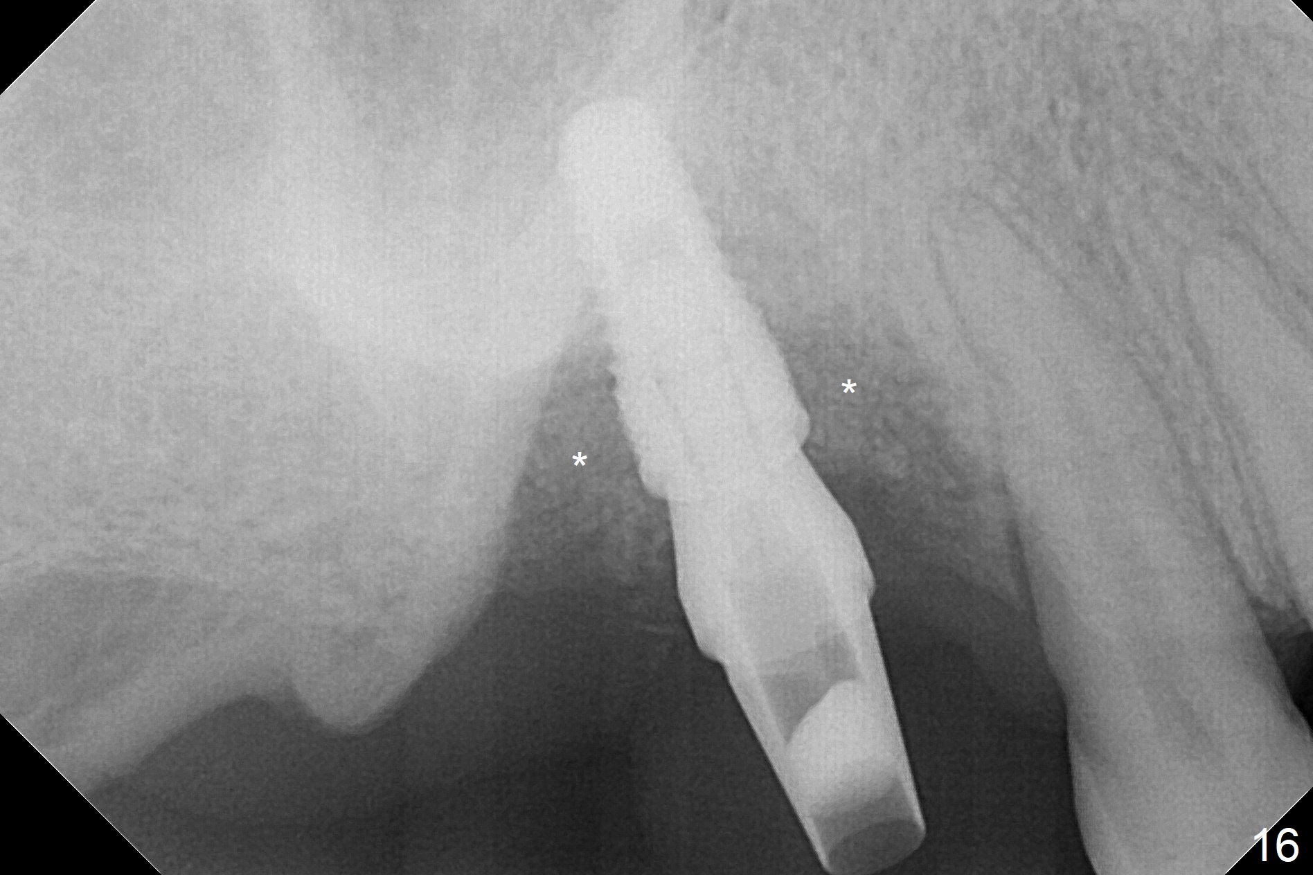 Two weeks later, the buccal gingiva appears to have grown downward (Fig.13). Fig.14 is taken when the provisional is removed. To facilitate this process, change abutment from 4.8x7(3) to (4.5) mm and a new provisional is fabricated (Fig.15): note the metal exposure distobuccally. When the patient returns in another two week, the gap should be able to disappear. There is no loss of bone graft 3 months postop (Fig.16). Two weeks later (3.5 months postop), the margin of the abutment is supragingival buccally and subgingival palatally (Fig.17,18). The gingiva seems to have migrated downward (Fig.19 arrow), while the bone density around the coronal implant appears to increase 5.5 months post cementation (Fig.20). There is buccal swelling with purulent discharge 1.5 years post cementation (Fig.21). Perimplantitis develops. Tuberosis bone graft will be performed when the limited ortho is finished.