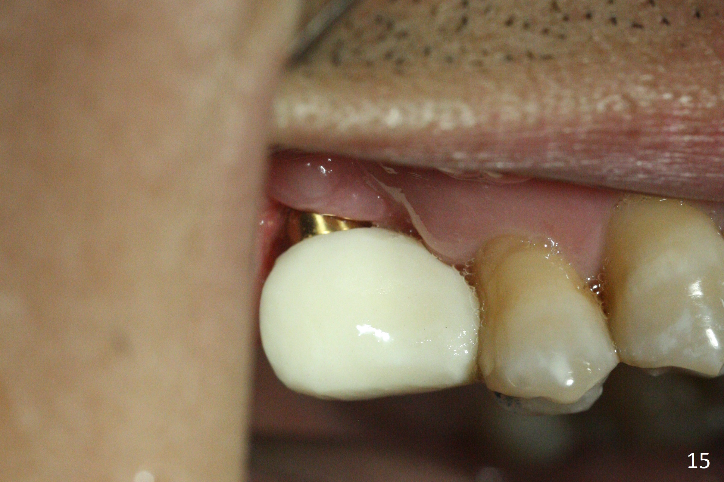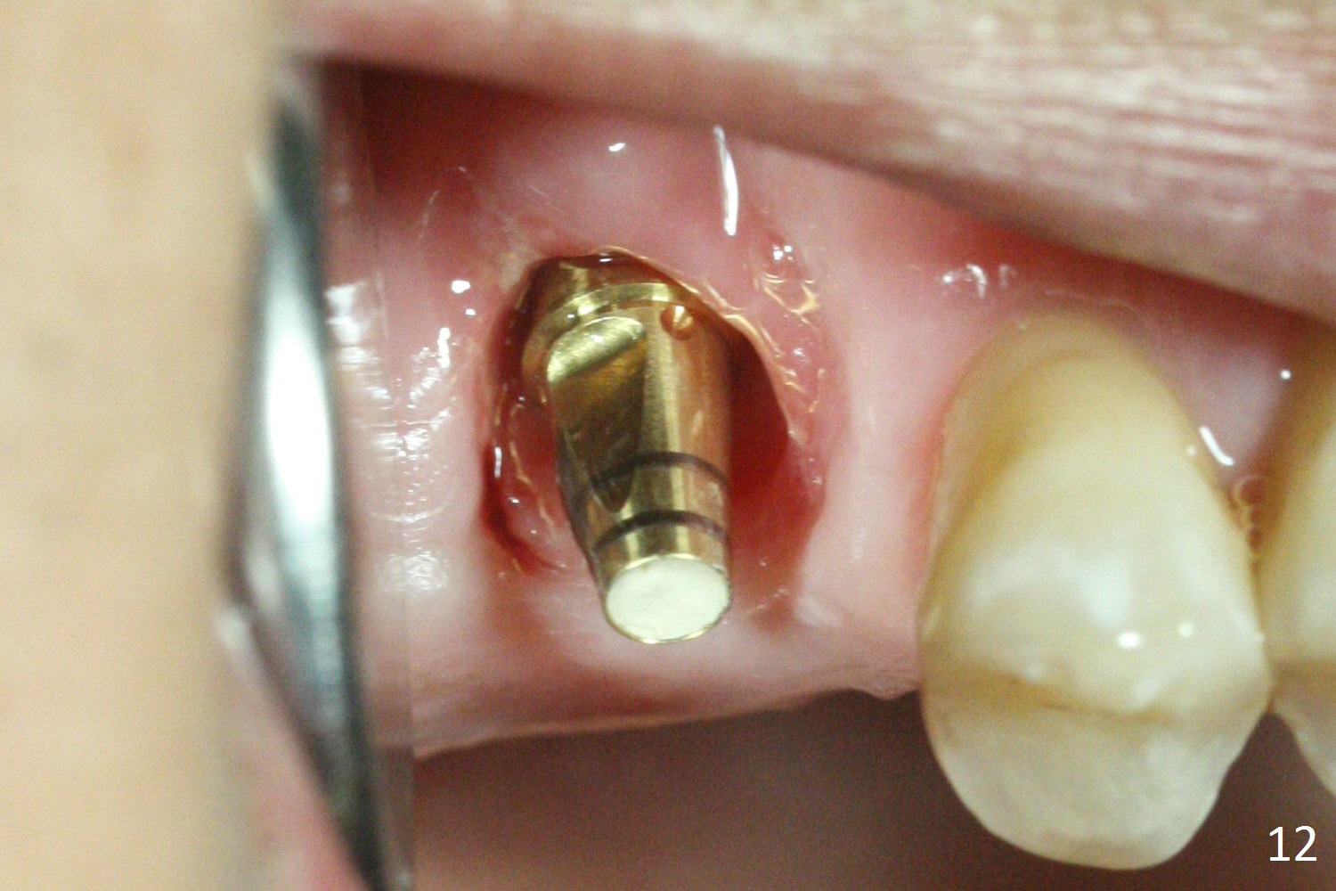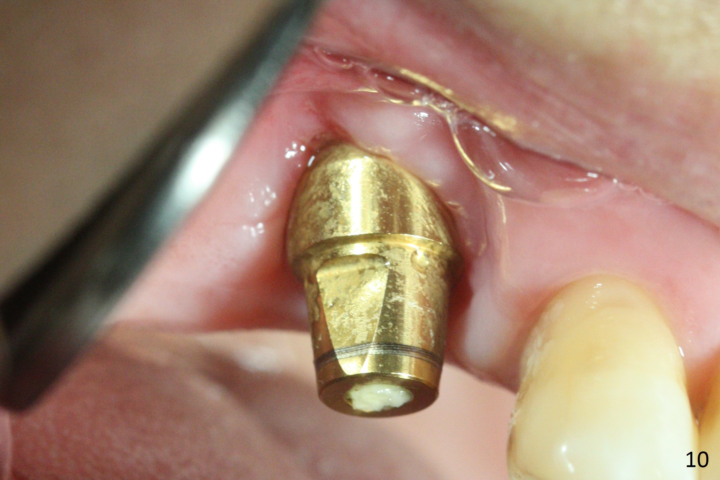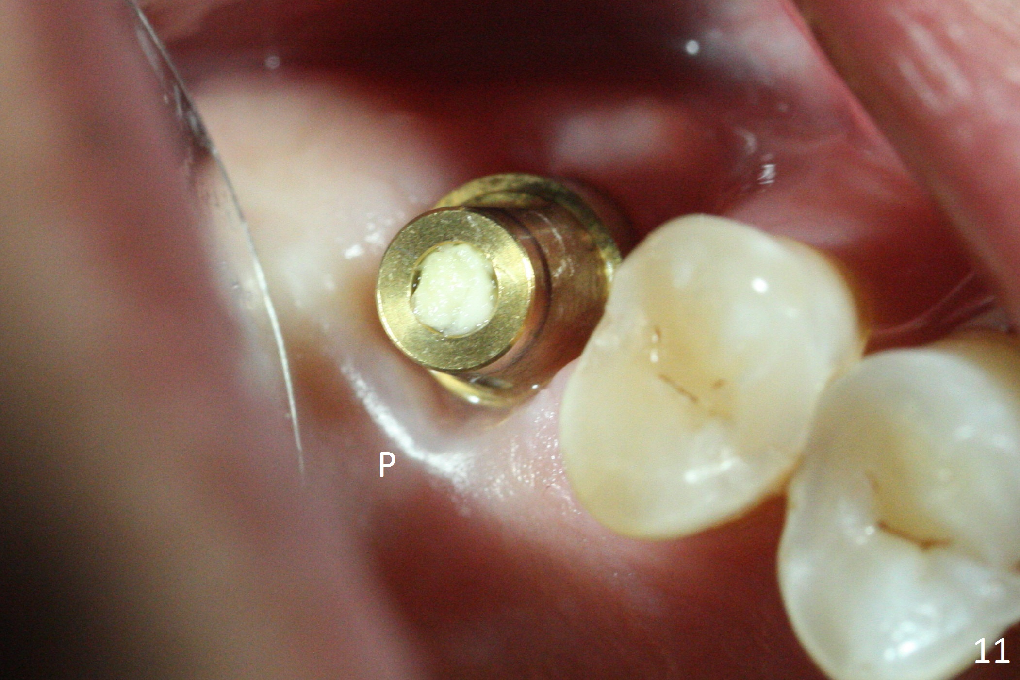 The buccal margin remains supragingival (Fig.10), while the palatal one subgingival 1.5 months postop (Fig.11 P). The abutment is changed to 4.8x7(3) mm (Fig.12). A provisional is fabricated to keep the palatal space for easy impression later on. With the smaller abutment and less tension, the buccal gingiva is expected to grow more coronal to reduce recession.