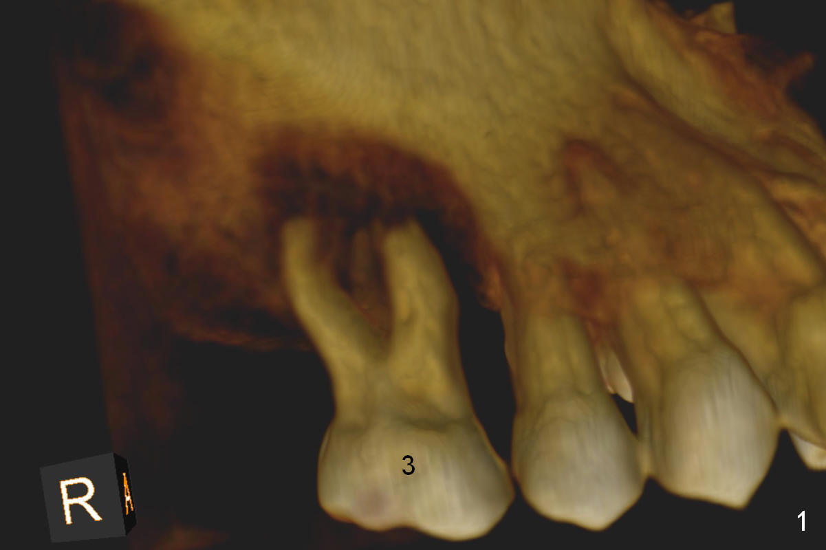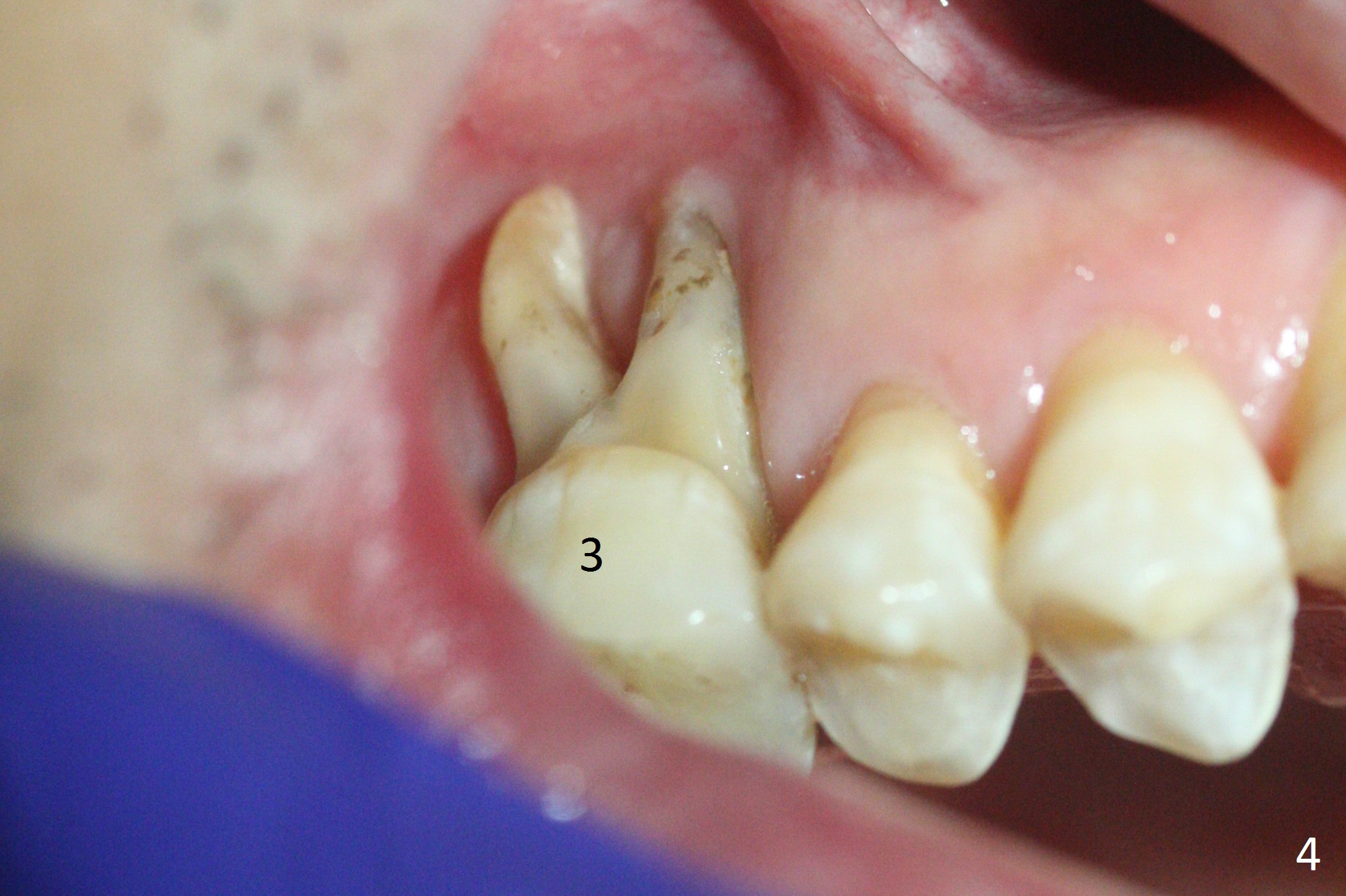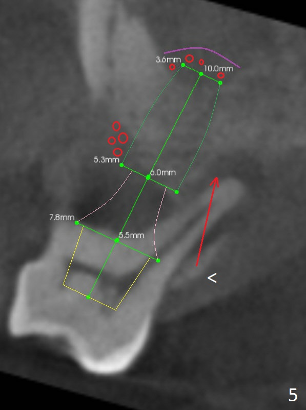 When the crown at #19 is cemented, the tooth #3 is found to have severe buccal recession (Fig.4). A 5.3x10 mm implant is not only placed deep, but also palatal (Fig.5, Clindamycin). An abutment will be selected with the longest cuff (6 mm (pink)). To make the palatal gingival margin recede, the coronal palatal bone (<) will be broken and pushed to the palatal socket.