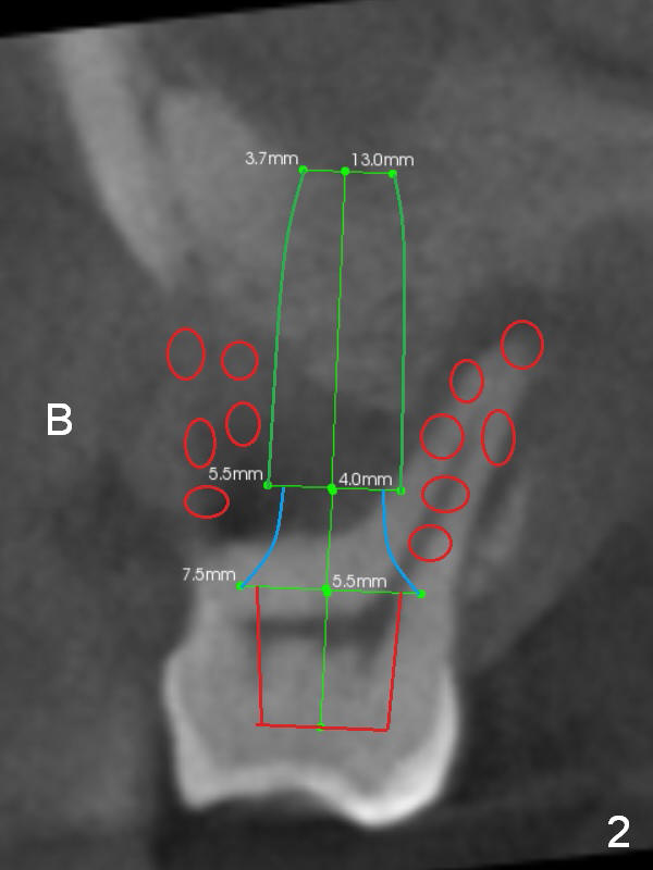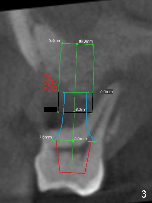 A safe method is to use a shorter implant and place it as deep as possible so that the majority of the threads are subcrestal (Fig.3 green). Pack bone graft tightly (smaller red circles) and also check whether there is a piece of gauze in the socket prior to grafting. The corresponding changes are to place a long abutment with long cuff (7.5x7(5) mm). Bone density is relatively low. Prepare bone expanders.