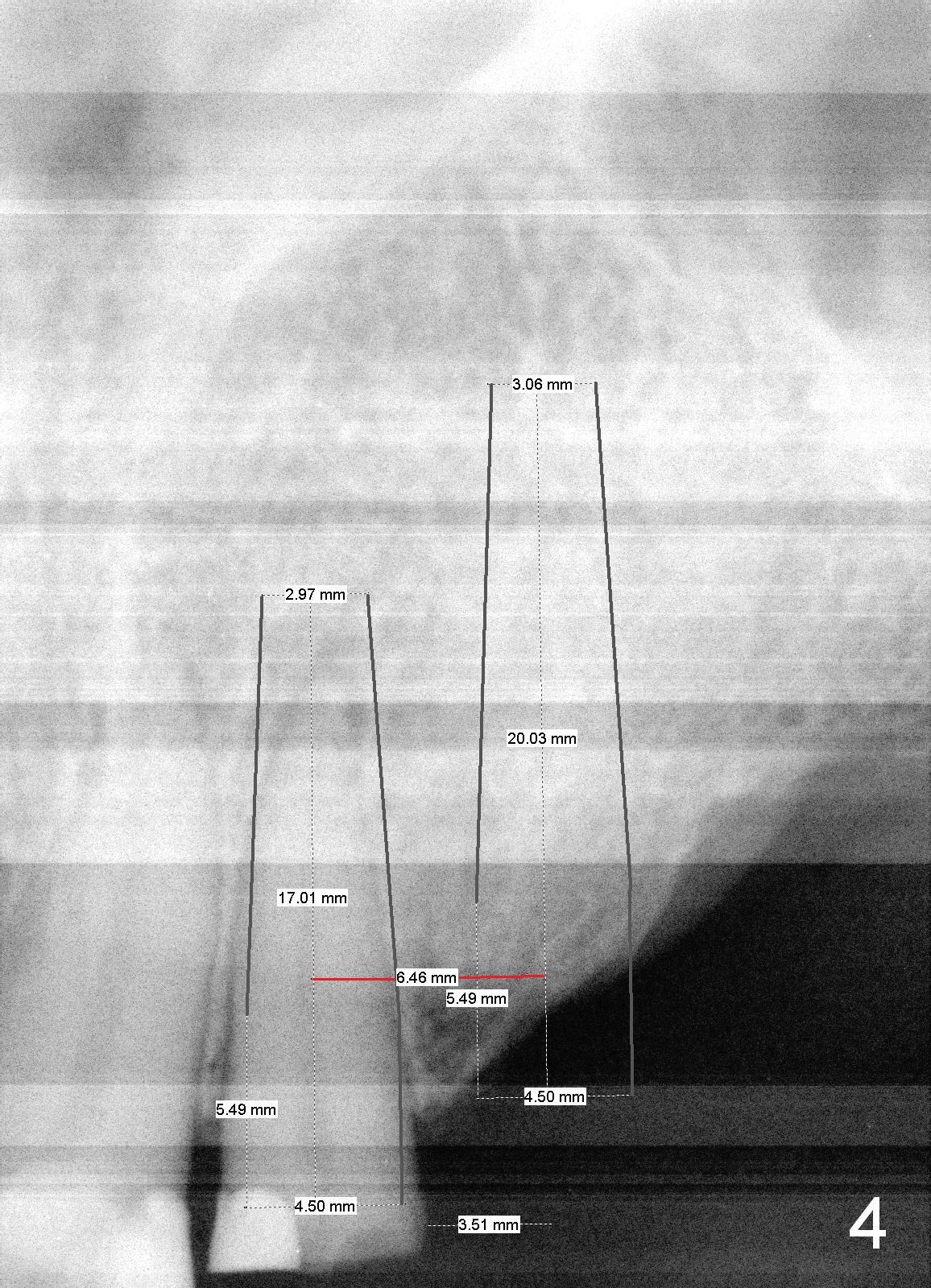 When initial osteotomy is established at #10 with insertion of a parallel pin, use 4.5 mm implant spacer to determine the initial point for #11 implant site (Fig.4: 6.49 (red line)-2=4.49 mm). 70岁男多个牙齿缺失,5.5年前就诊,同意在10-13位点植牙(图一)。