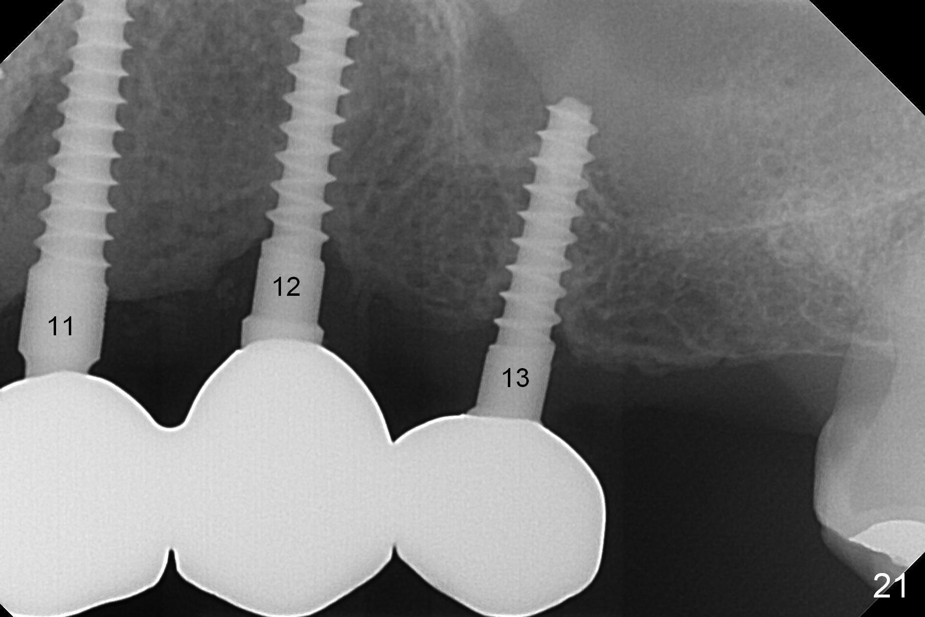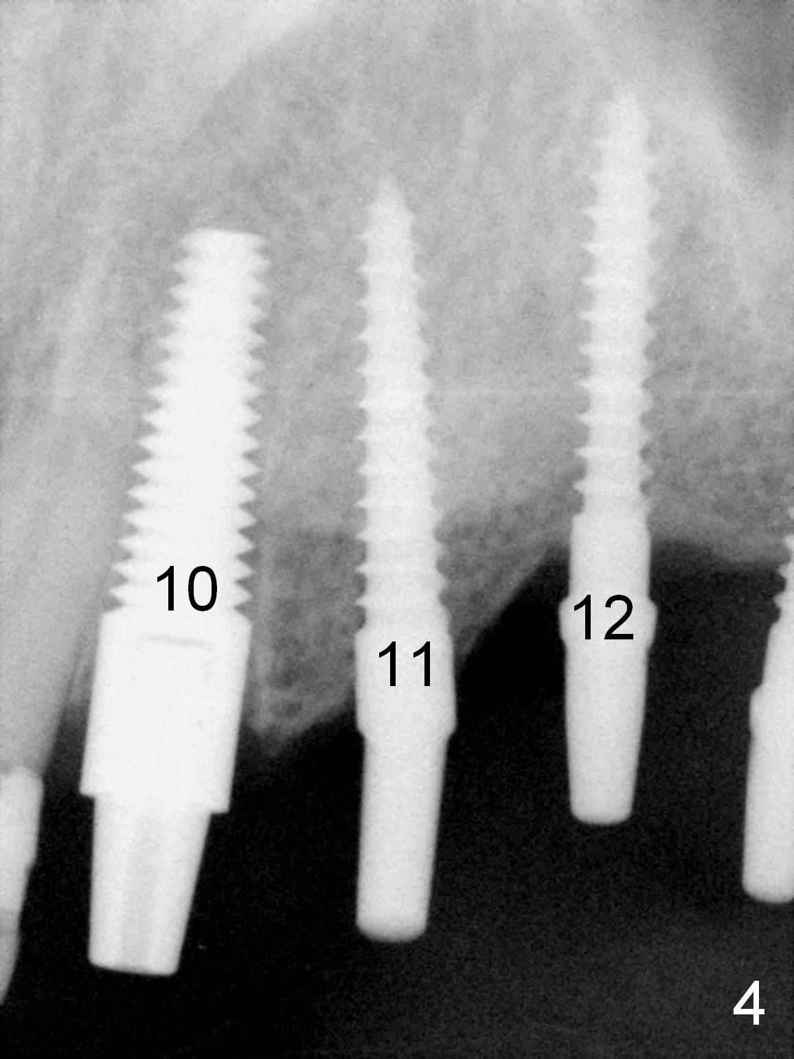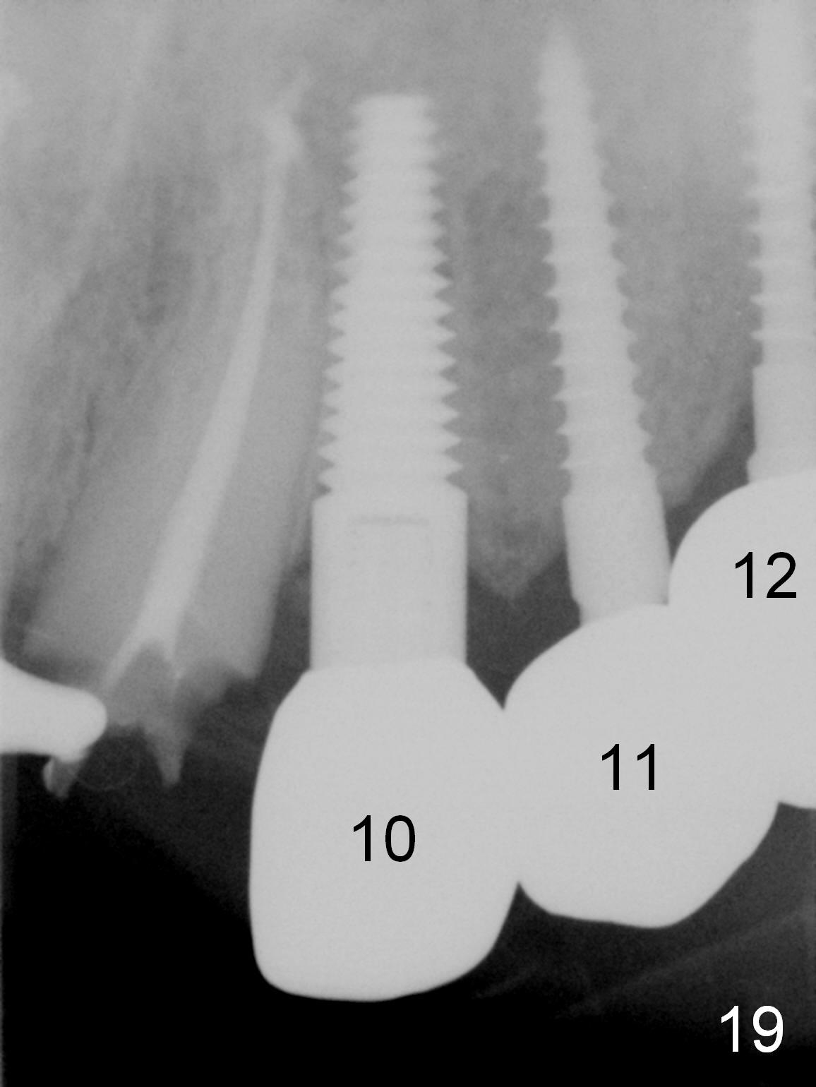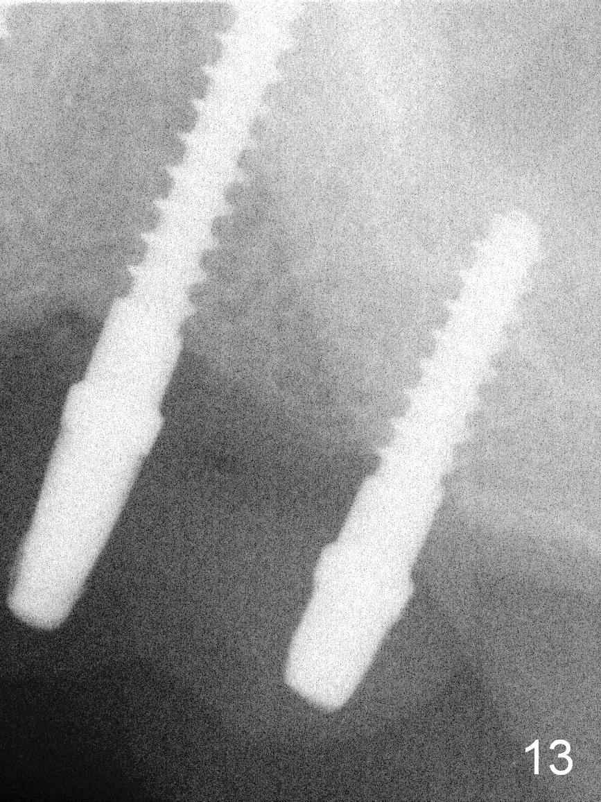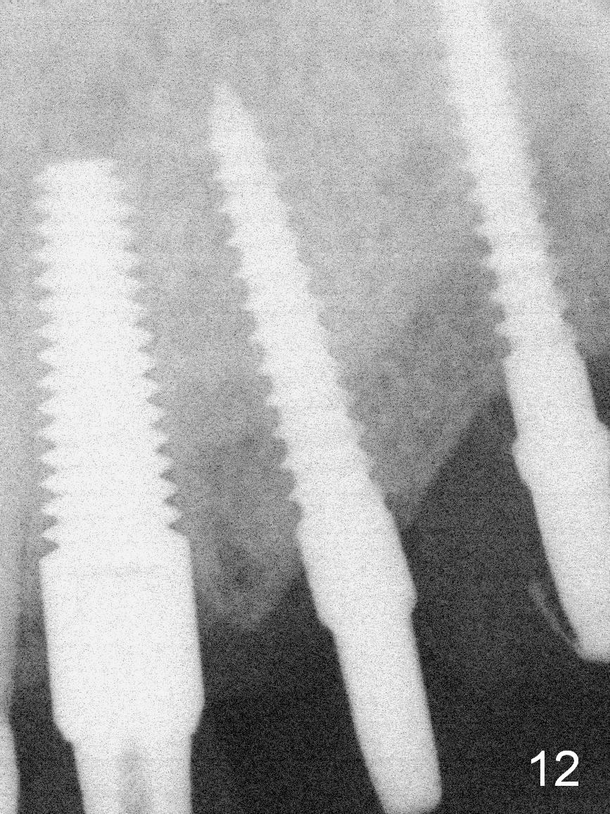 The patient returns for final restoration 3.5 months postop; it appears that the implants have osteointegrated (Fig.12,13). After reprep, there is no gross buccal plate atrophy at #10 (Fig.14).