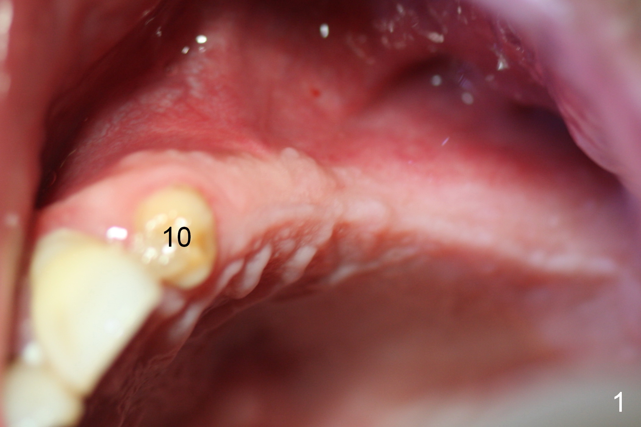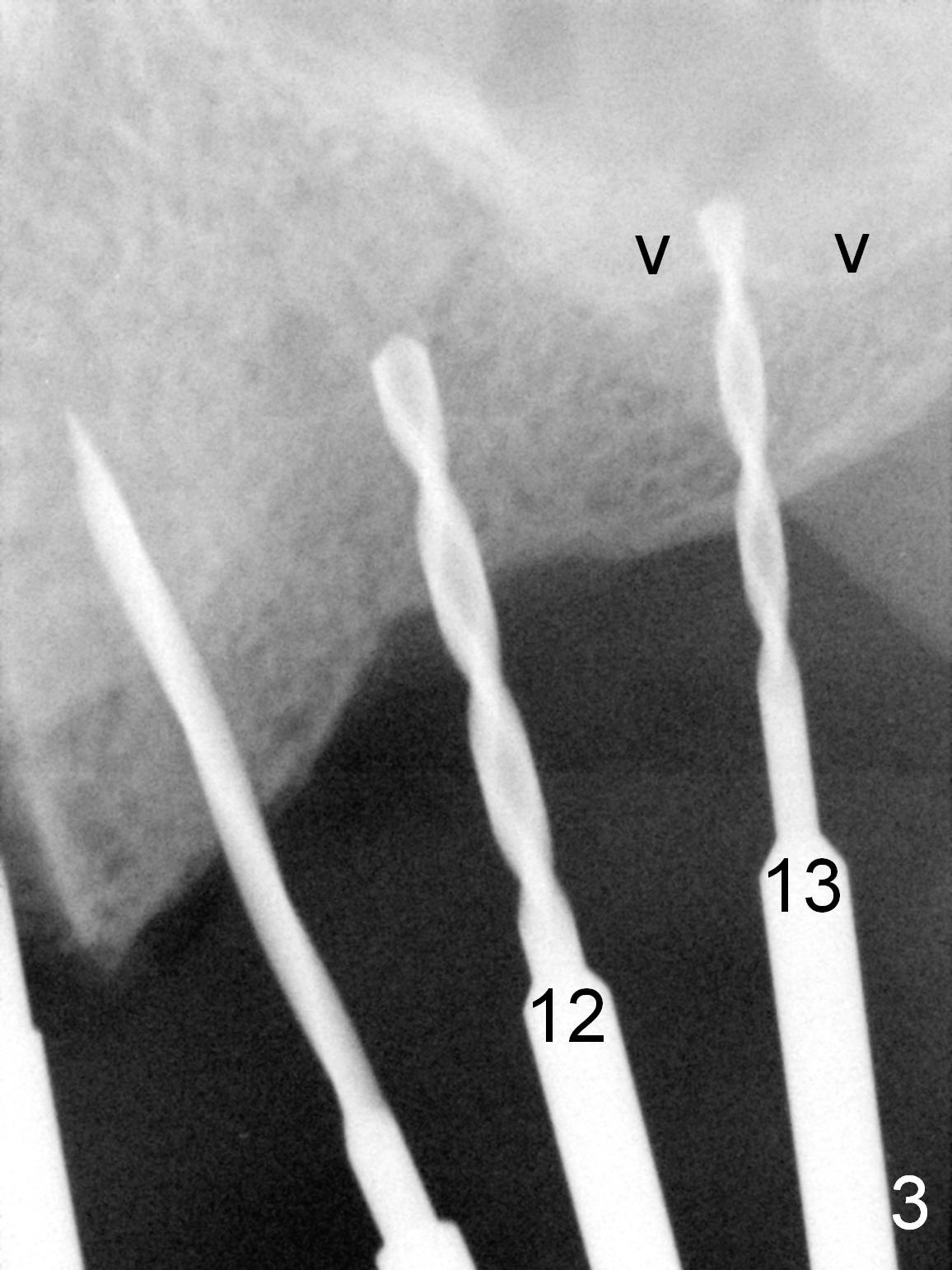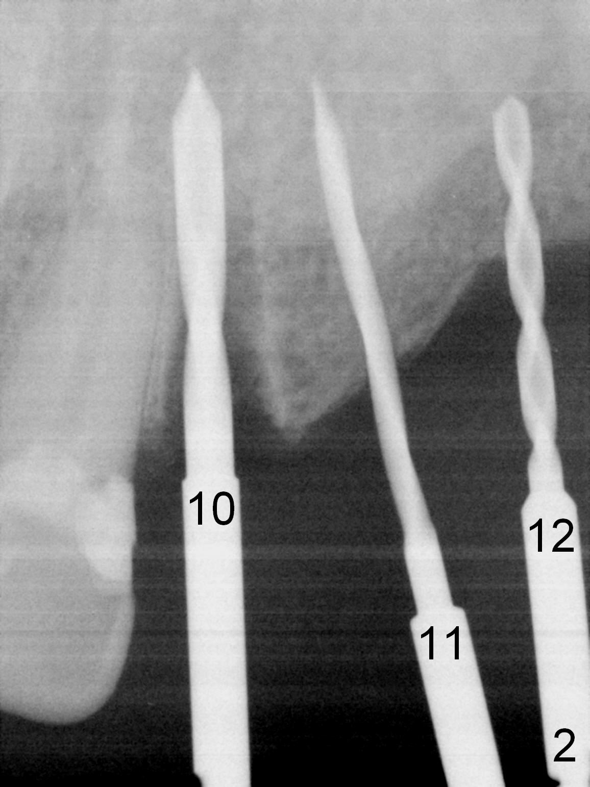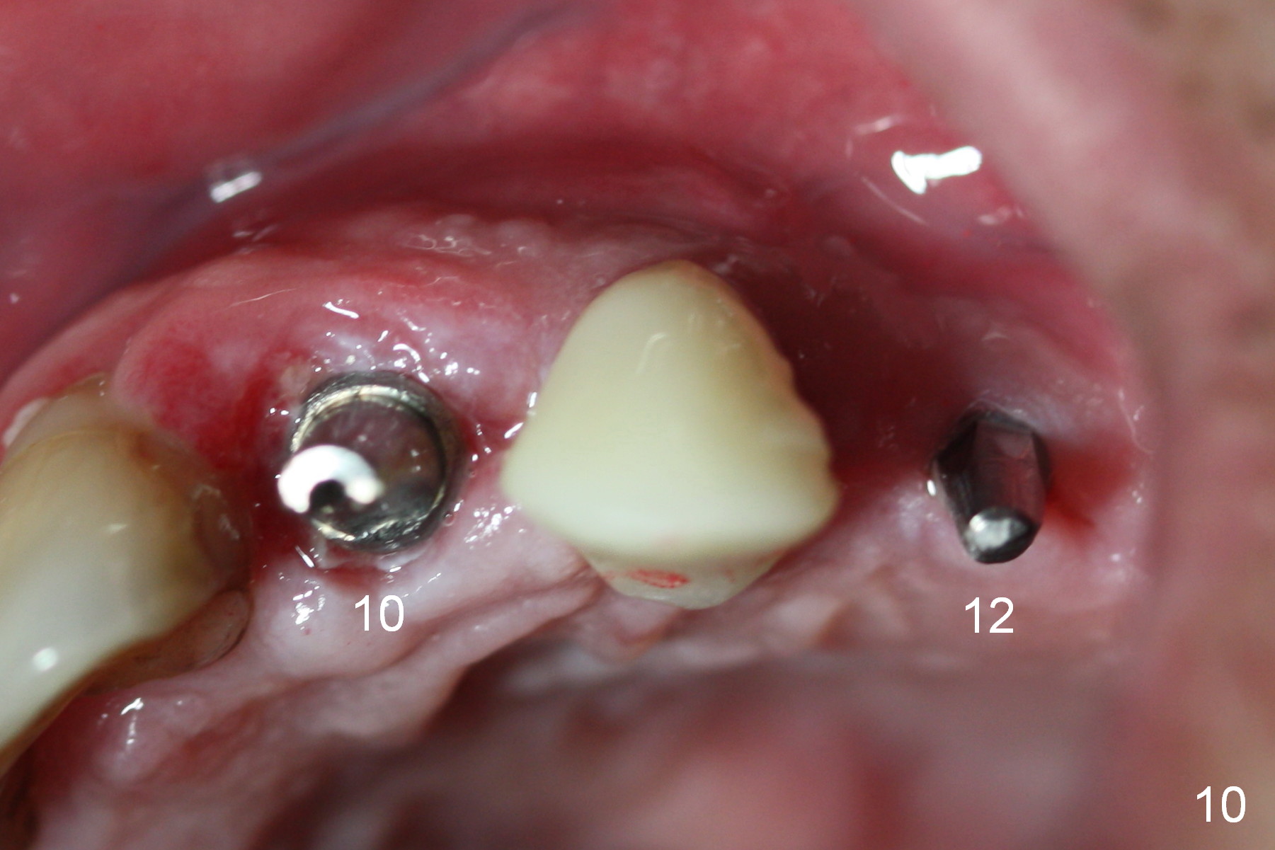 The patient returns for final restoration 3.5 months postop; it appears that the implants have osteointegrated (Fig.12,13). After reprep, there is no gross buccal plate atrophy at #10 (Fig.14).