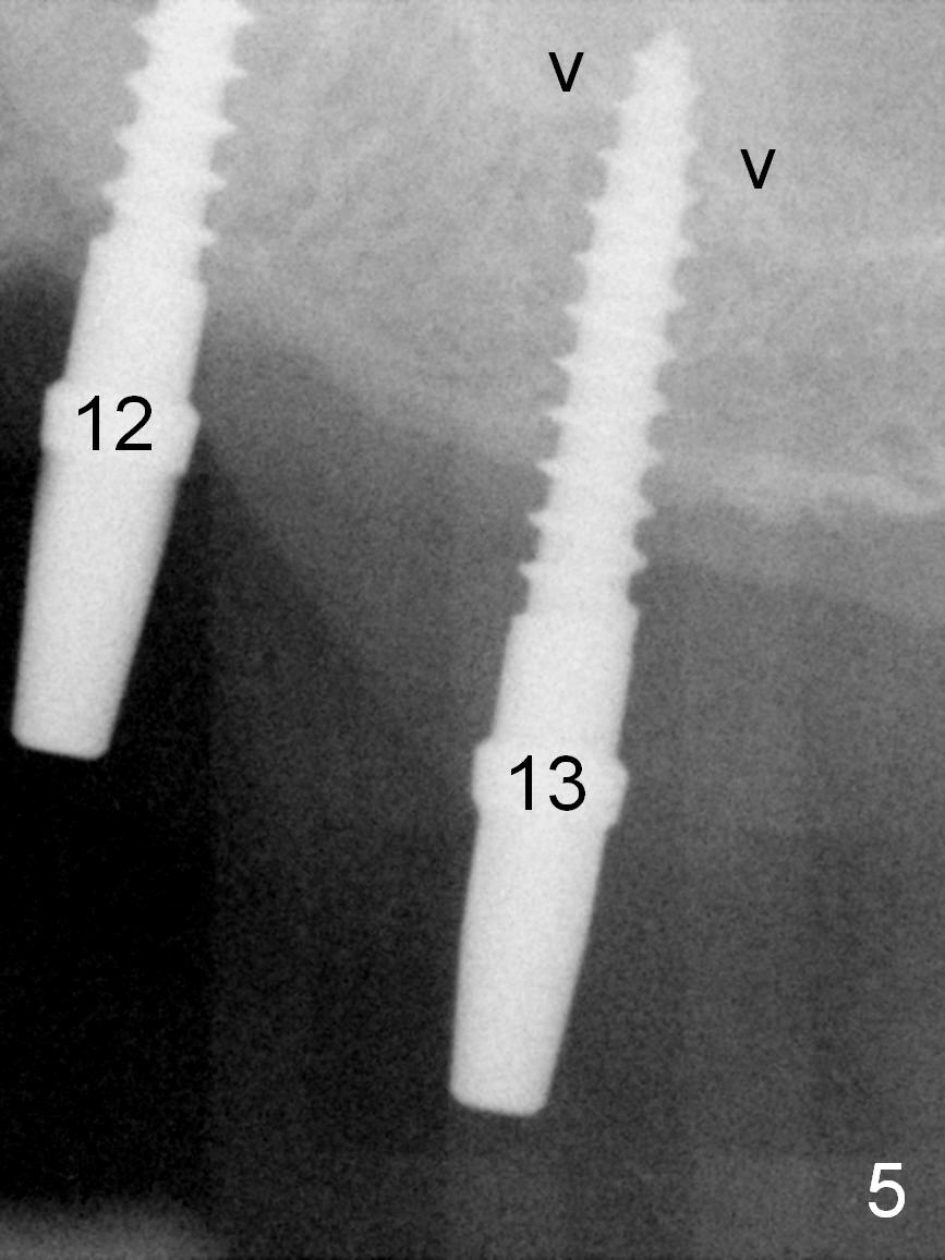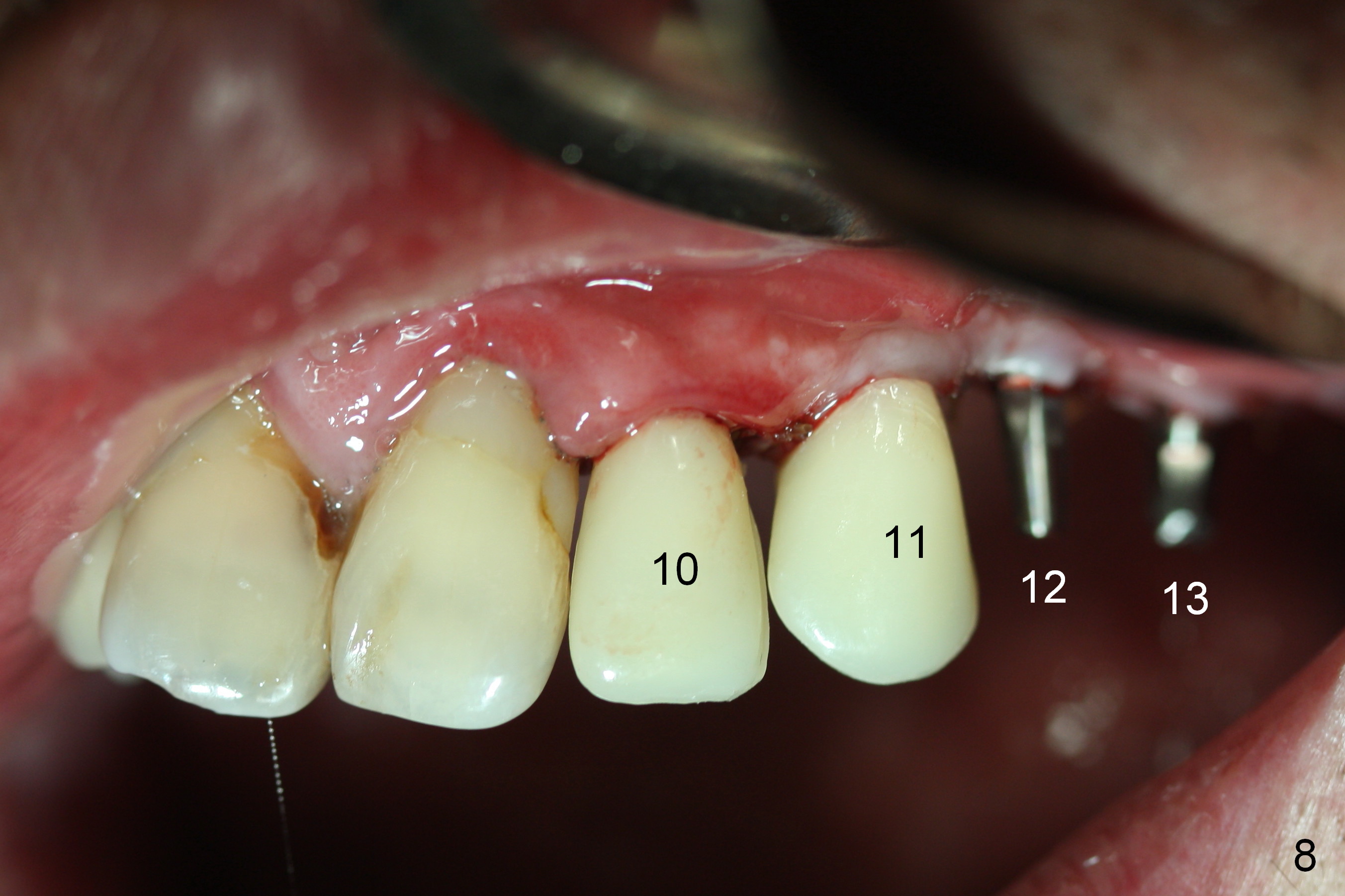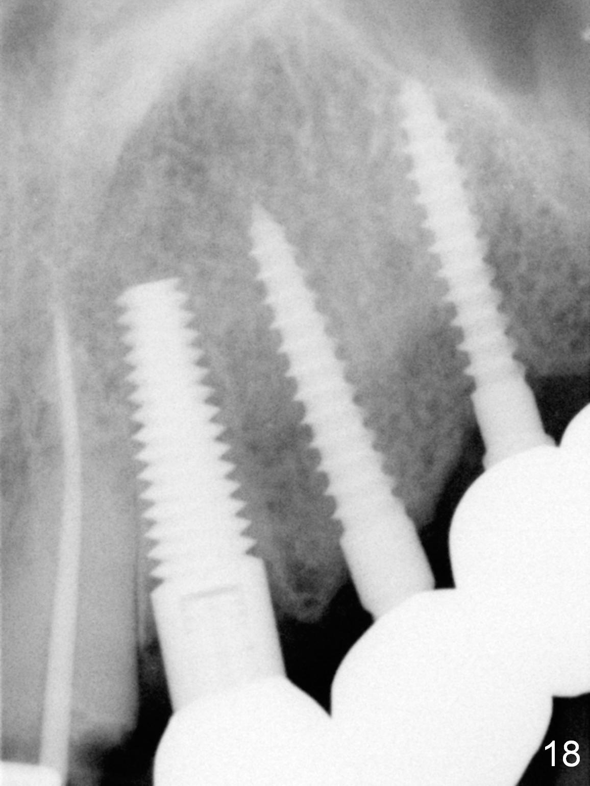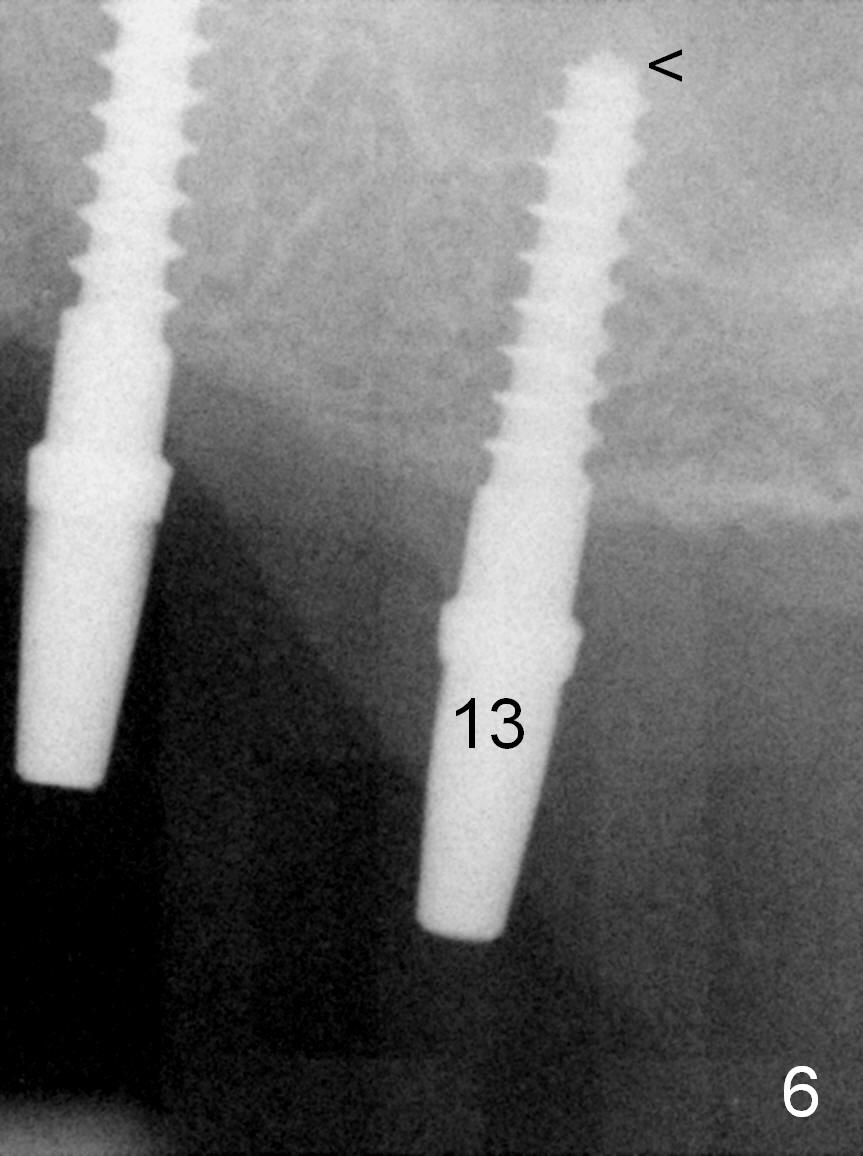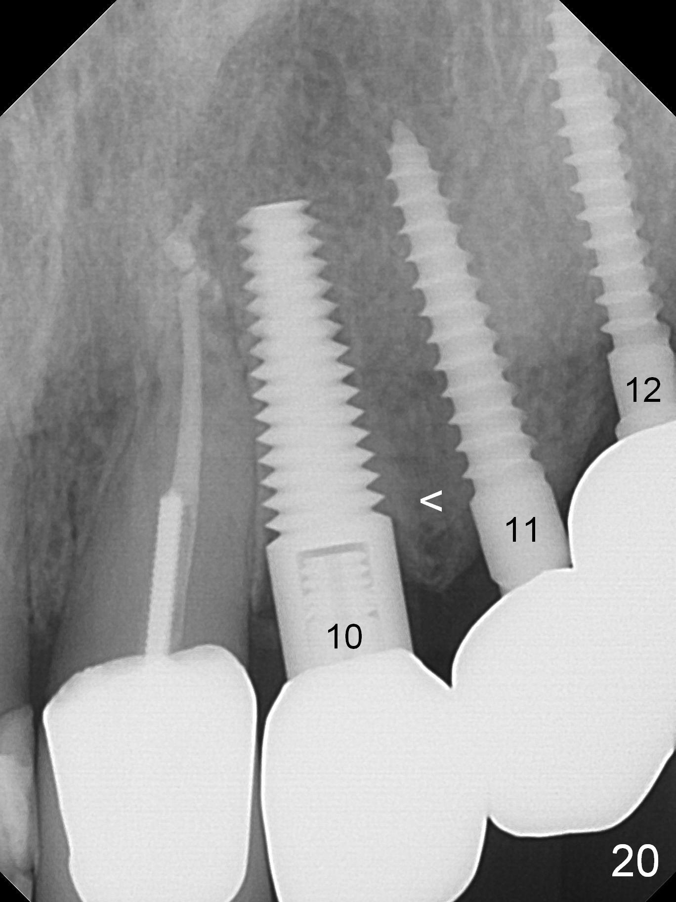When the patient returns for implant placement (2nd visit after initial exam), he reveals that he is a dental phobic. He requests placement of 4 implants in the upper left quadrant, instead of 2. Narrow ridge is unexpected in the canine and premolar area (Fig.1). Limited bone height at #13 (Fig.3 arrowheads: sinus floor) is found when initial drills are in place (Fig.2,3). A 2-piece implant (4.5x17 mm tissue-level) is placed at #10 after extraction, while 1-piece implants are placed at 11 (3x17 mm (tissue-level, 15 °) and 12 and 13 (bone-level, 2.5x14, 12 mm, respectively; Fig.4,5). In fact the 1 piece implant at #13 is not completely placed (Fig.5). It is removed, the apical 3 threads are cut off (Fig.6 <, since a shorter implant was unavailable in the office) and the remaining implant is re-inserted. The insertion torques of the 4 implants are ~ 60, ~ 35, < 35 and 15 Ncm, respectively. After adjustment (Fig.7), immediate provisionals are fabricated at #10 and 11 (Fig.8, later splinted with composite), while perio dressing is applied around the implants at #12 and 13 and the provisionals at #10 and 11. There is no nasal hemorrhage postop. Although the perio dressing is loose 1 week postop (Fig.9), it is not removed. When the upper lip fissure (Fig.9 <) heals, provisionals at #12 and 13 are planned to be splinted to the other two ones. Two weeks postop, the upper lip fissure heals, the perio dressing dislodges and the implants at #12 and 13 are stable (Fig.10). After abutment height adjustment, a splinted provisional is fabricated over these 2.5 mm 1-piece implants (Fig.11).