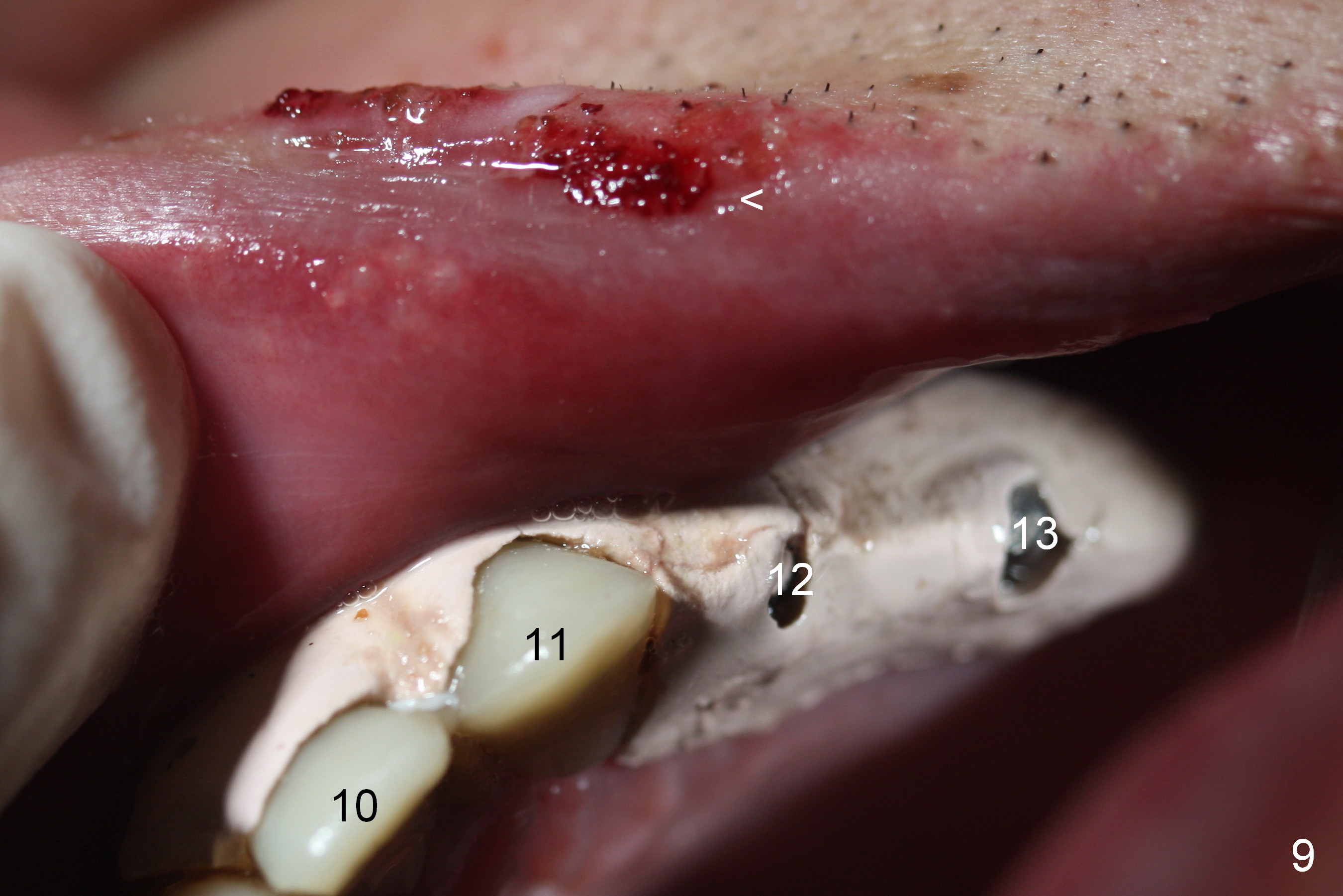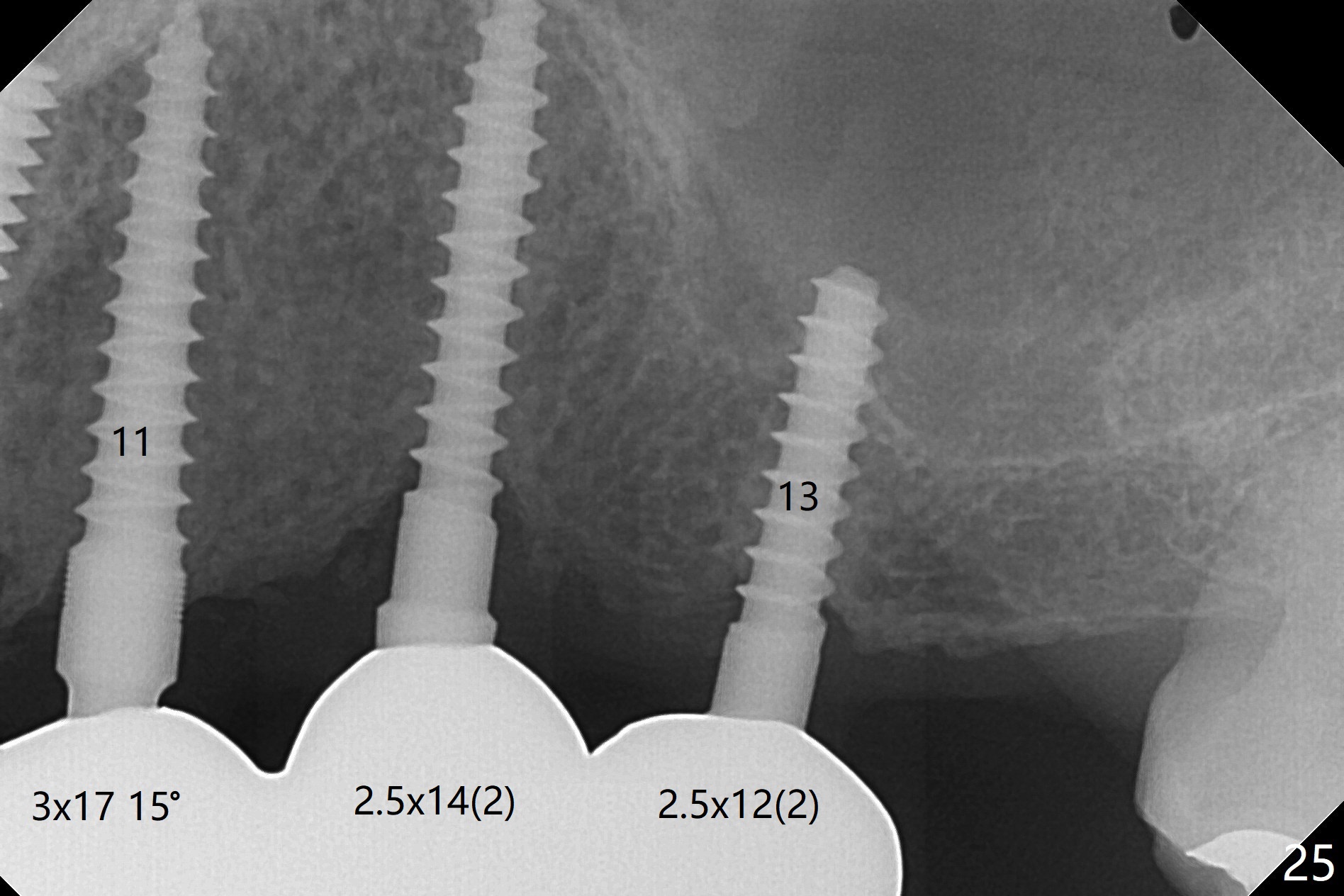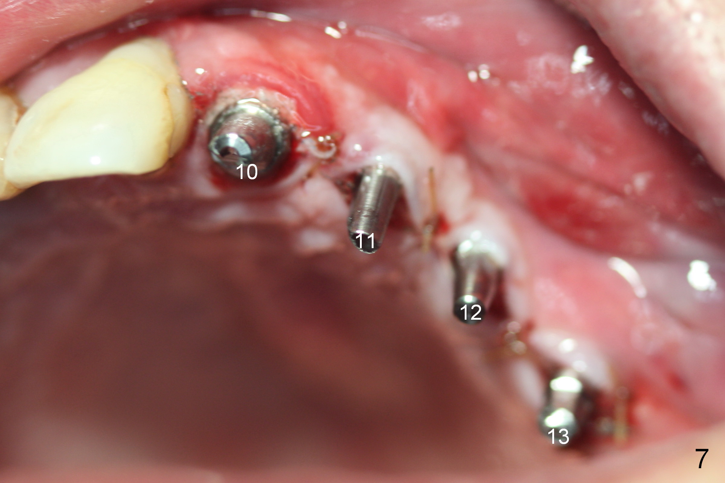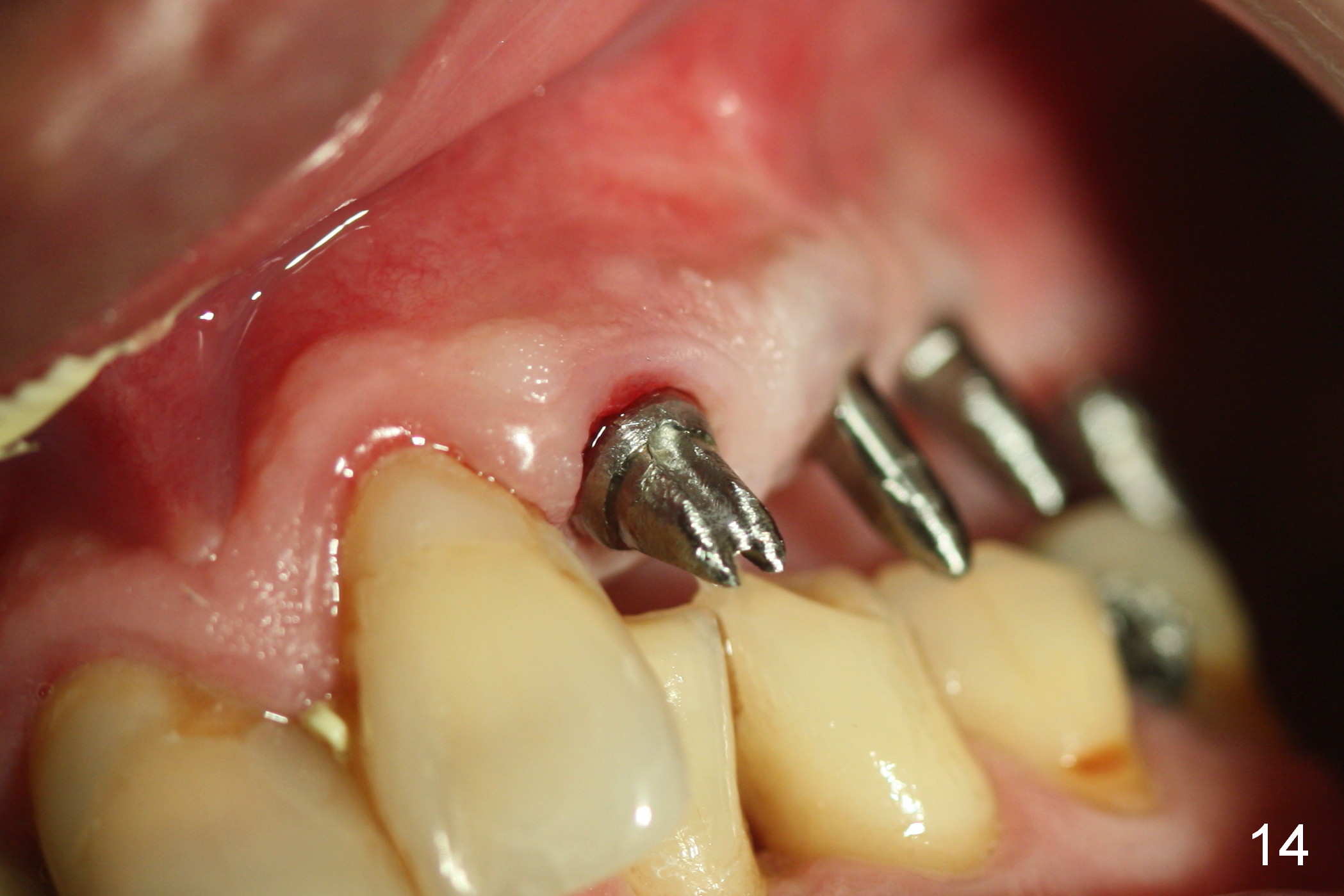 When the patient returns for implant placement (2nd visit after initial exam), he reveals that he is a dental phobic. He requests placement of 4 implants in the upper left quadrant, instead of 2. Narrow ridge is unexpected in the canine and premolar area (Fig.1). Limited bone height at #13 (Fig.3 arrowheads: sinus floor) is found when initial drills are in place (Fig.2,3). A 2-piece implant (4.5x17 mm tissue-level) is placed at #10 after extraction, while 1-piece implants are placed at 11 (3x17 mm (tissue-level, 15 °) and 12 and 13 (bone-level, 2.5x14, 12 mm, respectively; Fig.4,5). In fact the 1 piece implant at #13 is not completely placed (Fig.5). It is removed, the apical 3 threads are cut off (Fig.6 <, since a shorter implant was unavailable in the office) and the remaining implant is re-inserted. The insertion torques of the 4 implants are ~ 60, ~ 35, < 35 and 15 Ncm, respectively. After adjustment (Fig.7), immediate provisionals are fabricated at #10 and 11 (Fig.8, later splinted with composite), while perio dressing is applied around the implants at #12 and 13 and the provisionals at #10 and 11. There is no nasal hemorrhage postop. Although the perio dressing is loose 1 week postop (Fig.9), it is not removed. When the upper lip fissure (Fig.9 <) heals, provisionals at #12 and 13 are planned to be splinted to the other two ones. Two weeks postop, the upper lip fissure heals, the perio dressing dislodges and the implants at #12 and 13 are stable (Fig.10). After abutment height adjustment, a splinted provisional is fabricated over these 2.5 mm 1-piece implants (Fig.11).