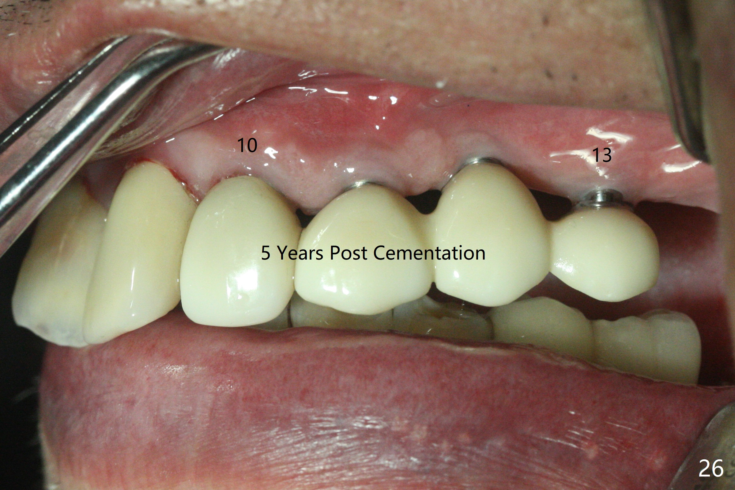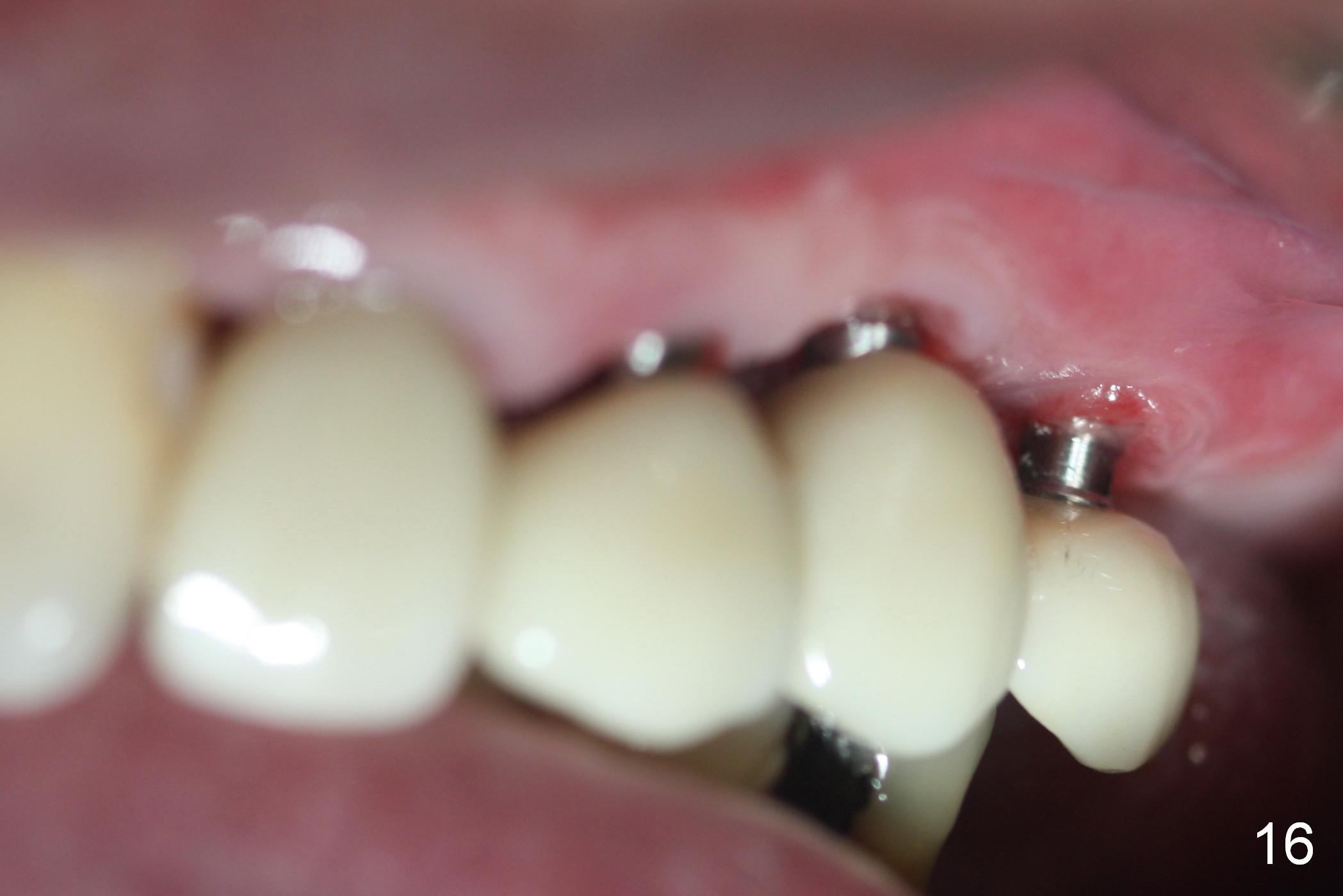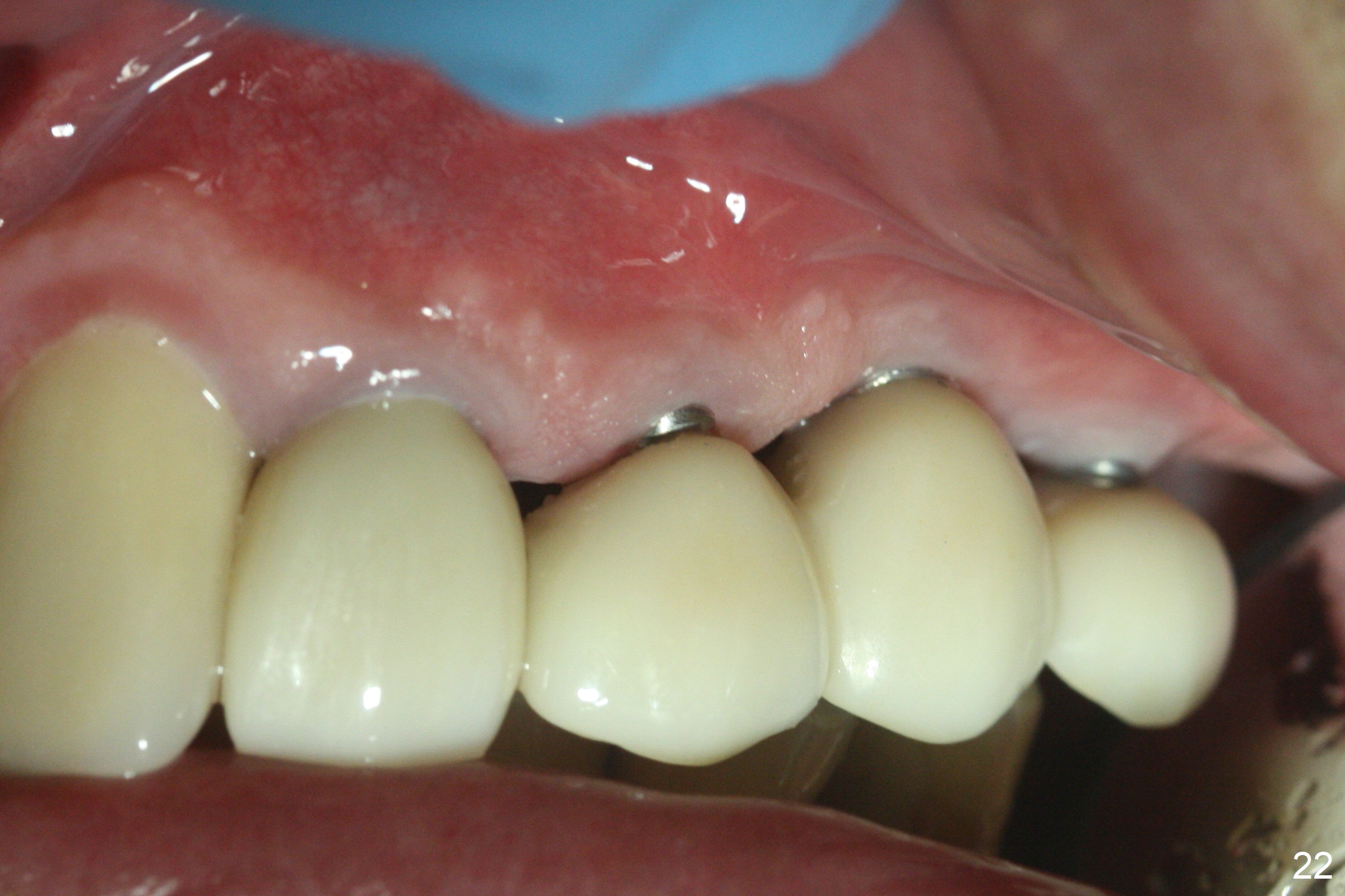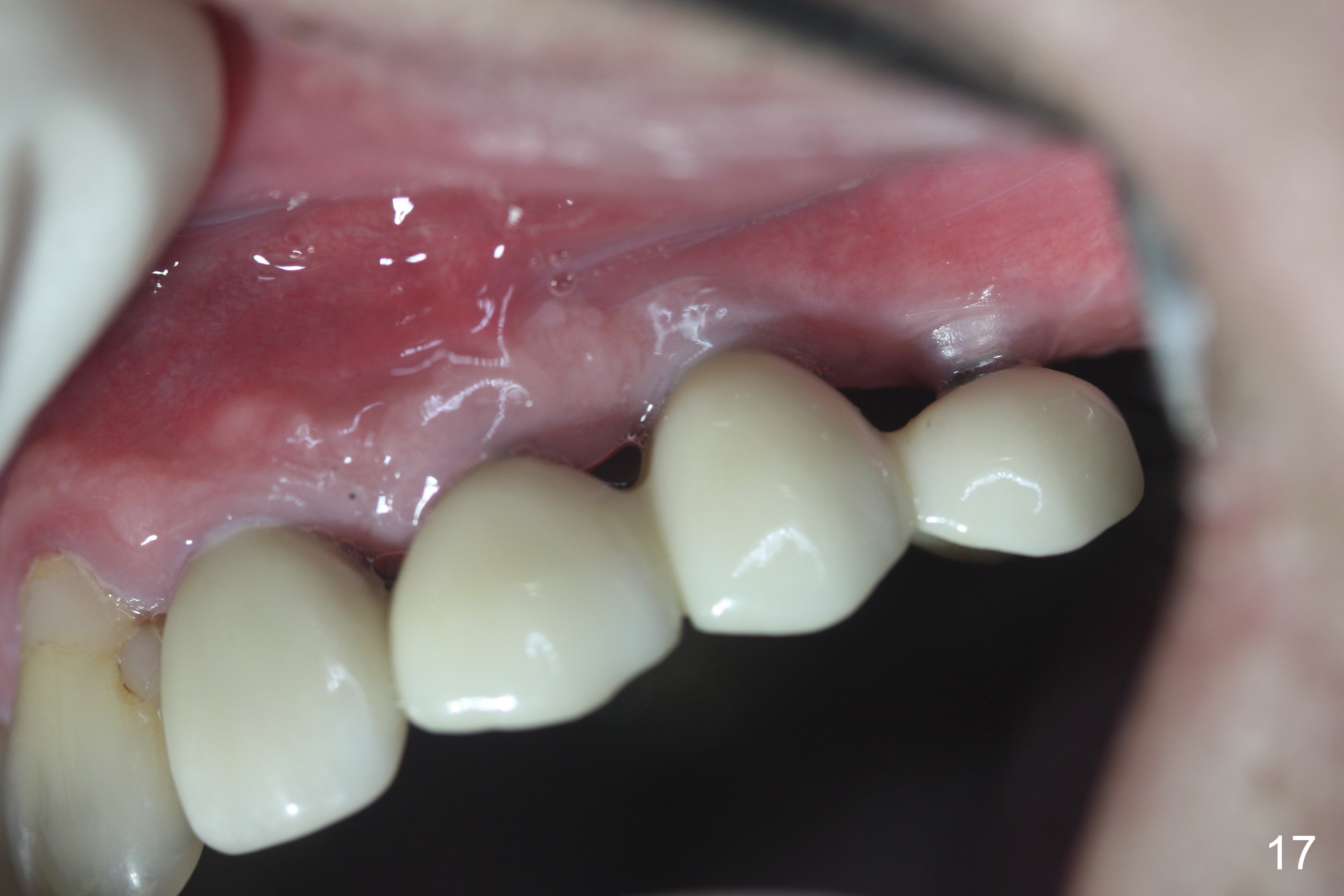 At the time of cementation, the crowns at #11-13 do not contact the gingiva (Fig.16). One month post cementation, the gingiva appears to have grown coronally (Fig.17).