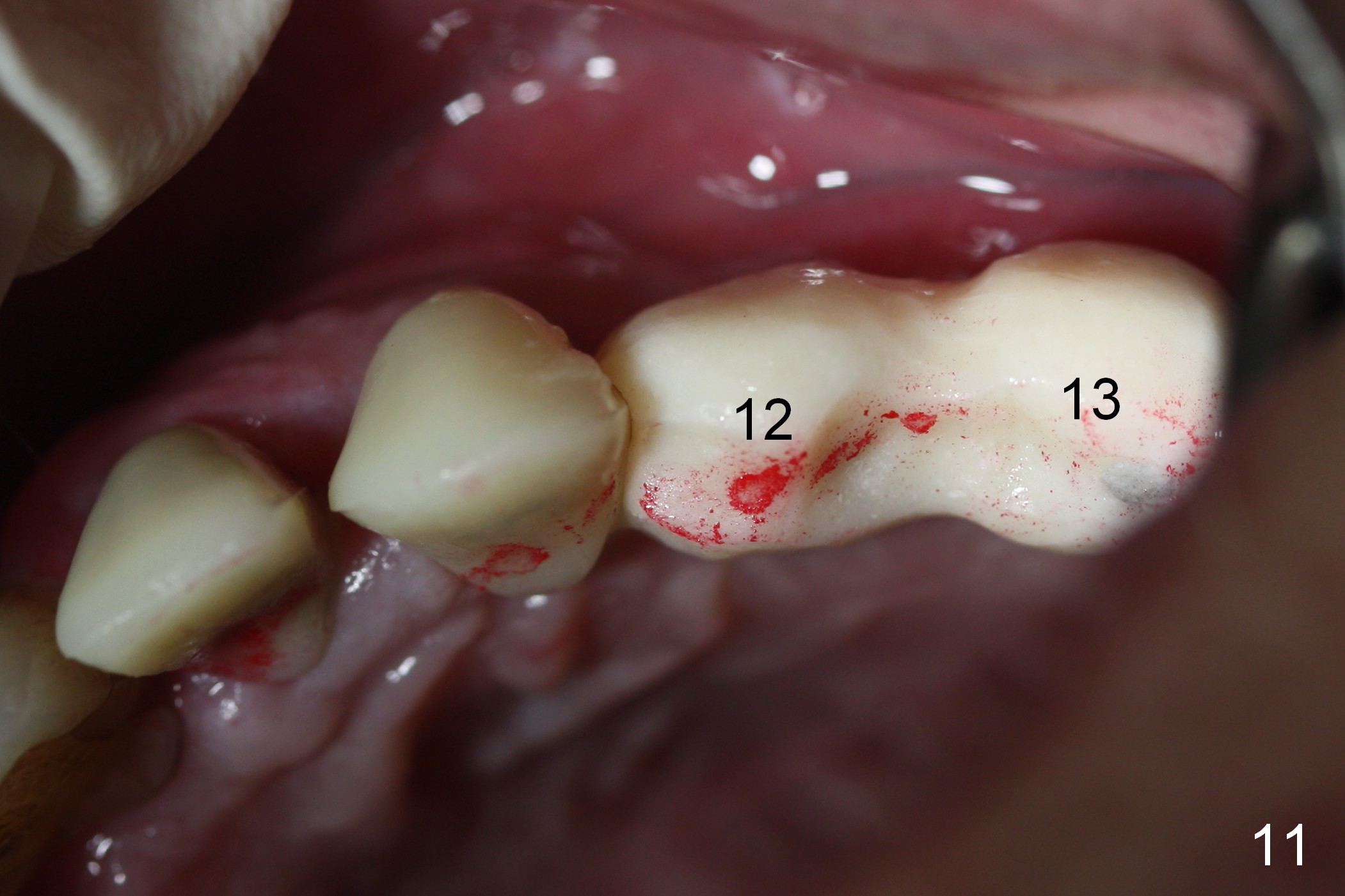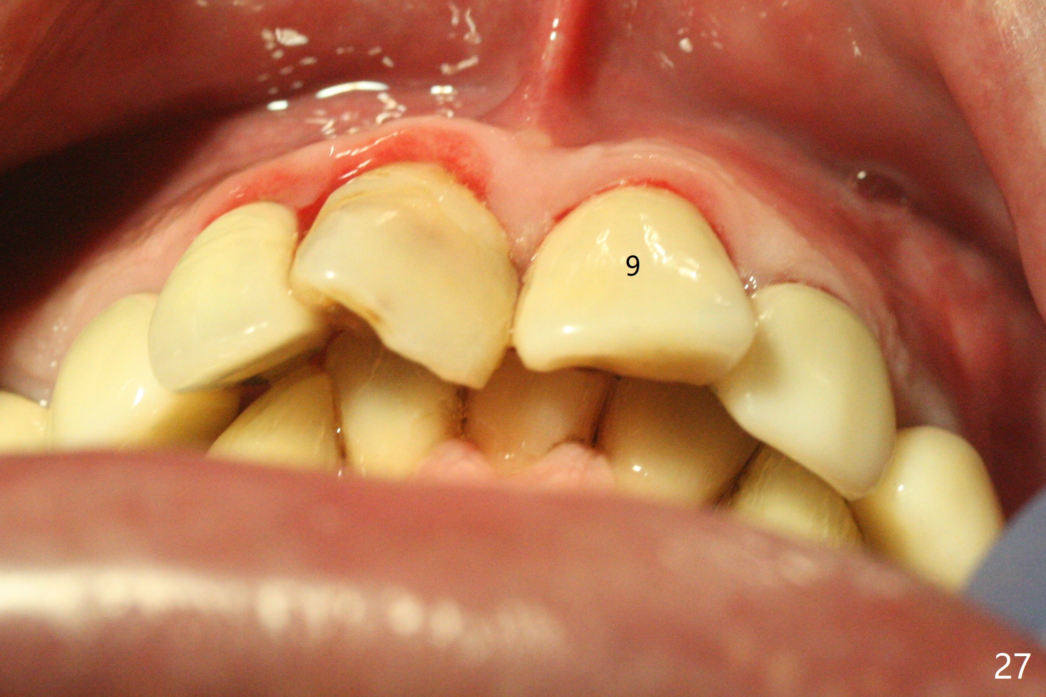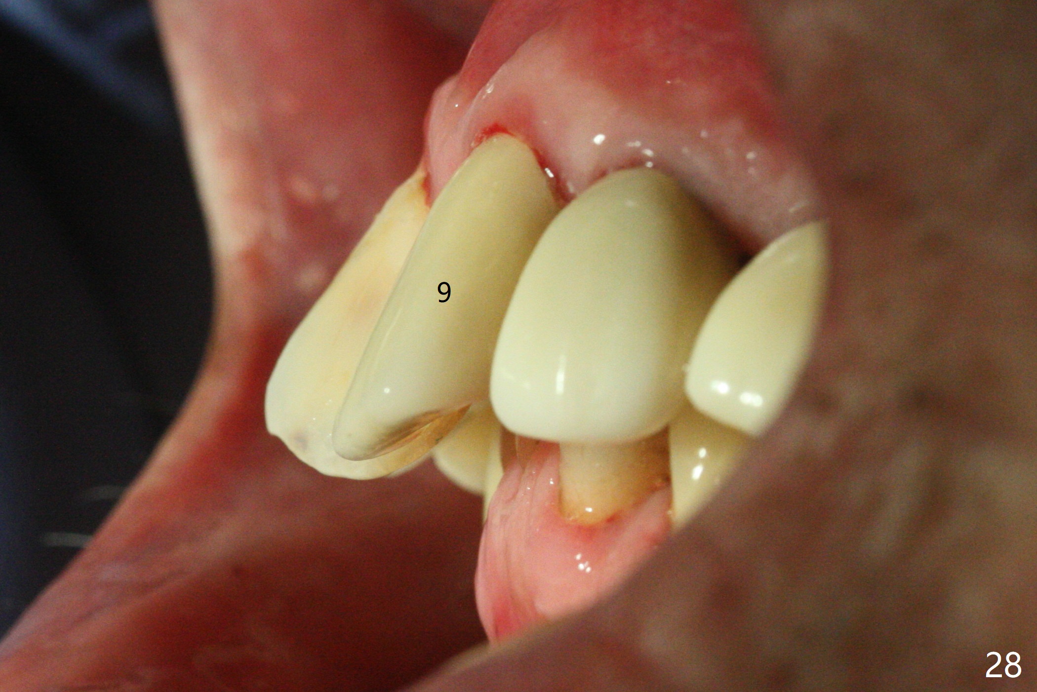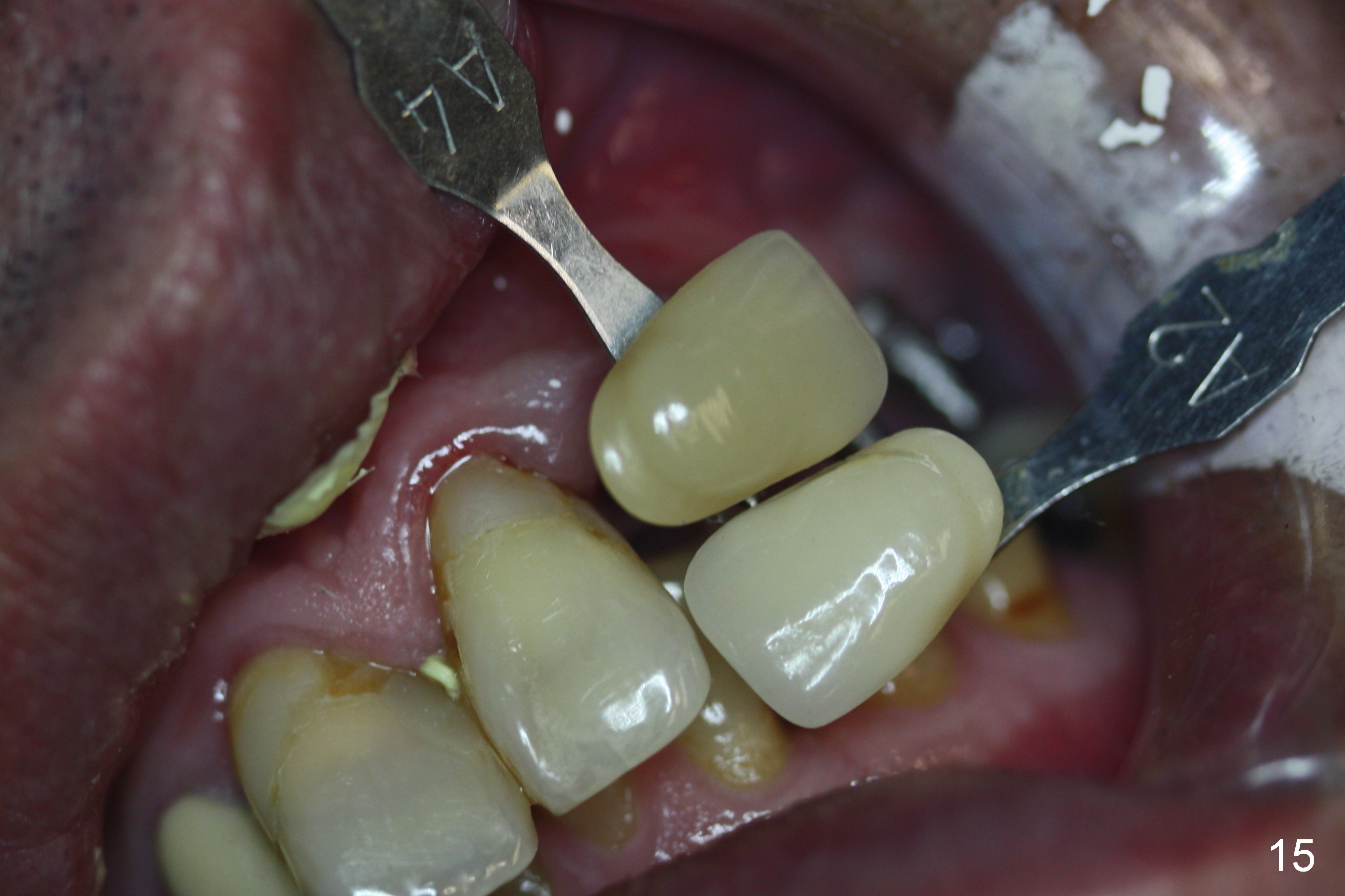 At the time of cementation, the crowns at #11-13 do not contact the gingiva (Fig.16). One month post cementation, the gingiva appears to have grown coronally (Fig.17).