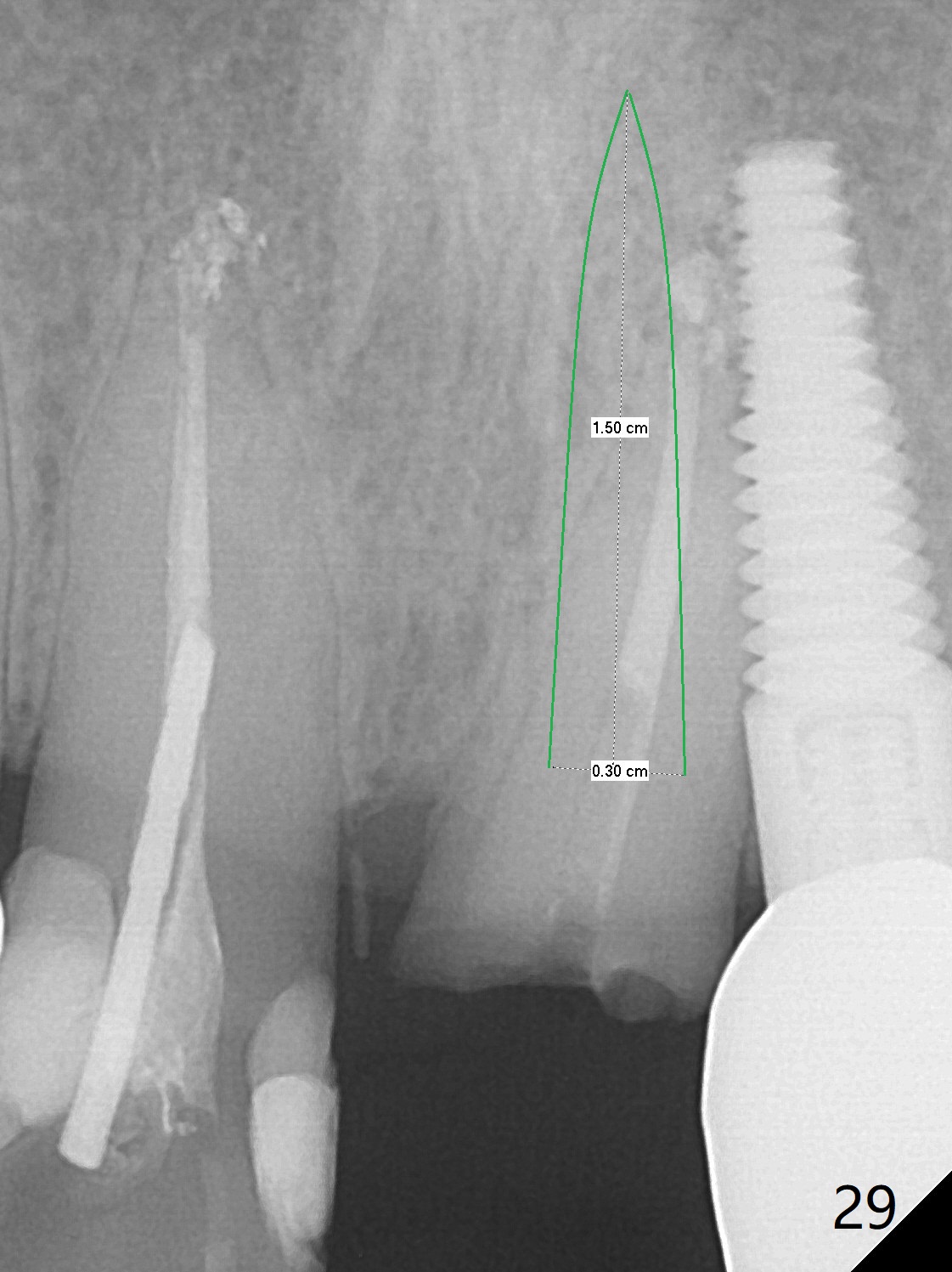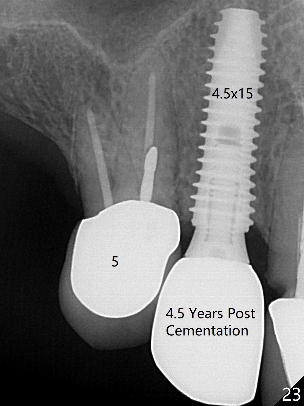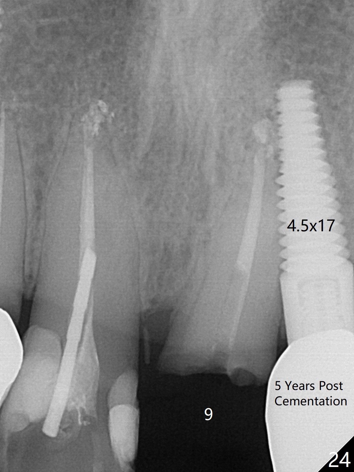 Six months post cementation, the tooth #9 becomes symptomatic. Is it possible that the implant at #10 is too close to the root of #9? It is asymptomatic after pulpotomy, but the tooth fractures equi/supragingivally. Two PAs taken while RCT show osteointegration at #10-12 (Fig.18,19). While the bone density increases at #10 regular implant, there is minimal bone loss around the 1-piece implants 13 months post cementation (18 months postop, Fig.20,21). The gingiva remains healthy 19 months post cementation (Fig.22). 76岁病人突然打电话说一个植牙牙冠松动,其实9号牙(自然牙)折裂,6,10-13号牙植牙好像没有骨质吸收(图二十三至二十五),10-13牙位牙龈健康(图二十六,行使功能五年)。9号牙牙冠重新粘固后,显示前牙深覆合,深覆盖(图二十七,二十八)。如果再次脱落需要植牙,选择一段式有助于植入和修复,因为植体和基台直径小。两段式植牙相对基台直径至少4,或者4.5毫米,前牙修复显得笨重。由于9,10牙根和植体接近,9号牙植体需要偏小而长,3x14或者15毫米(图二十九)。