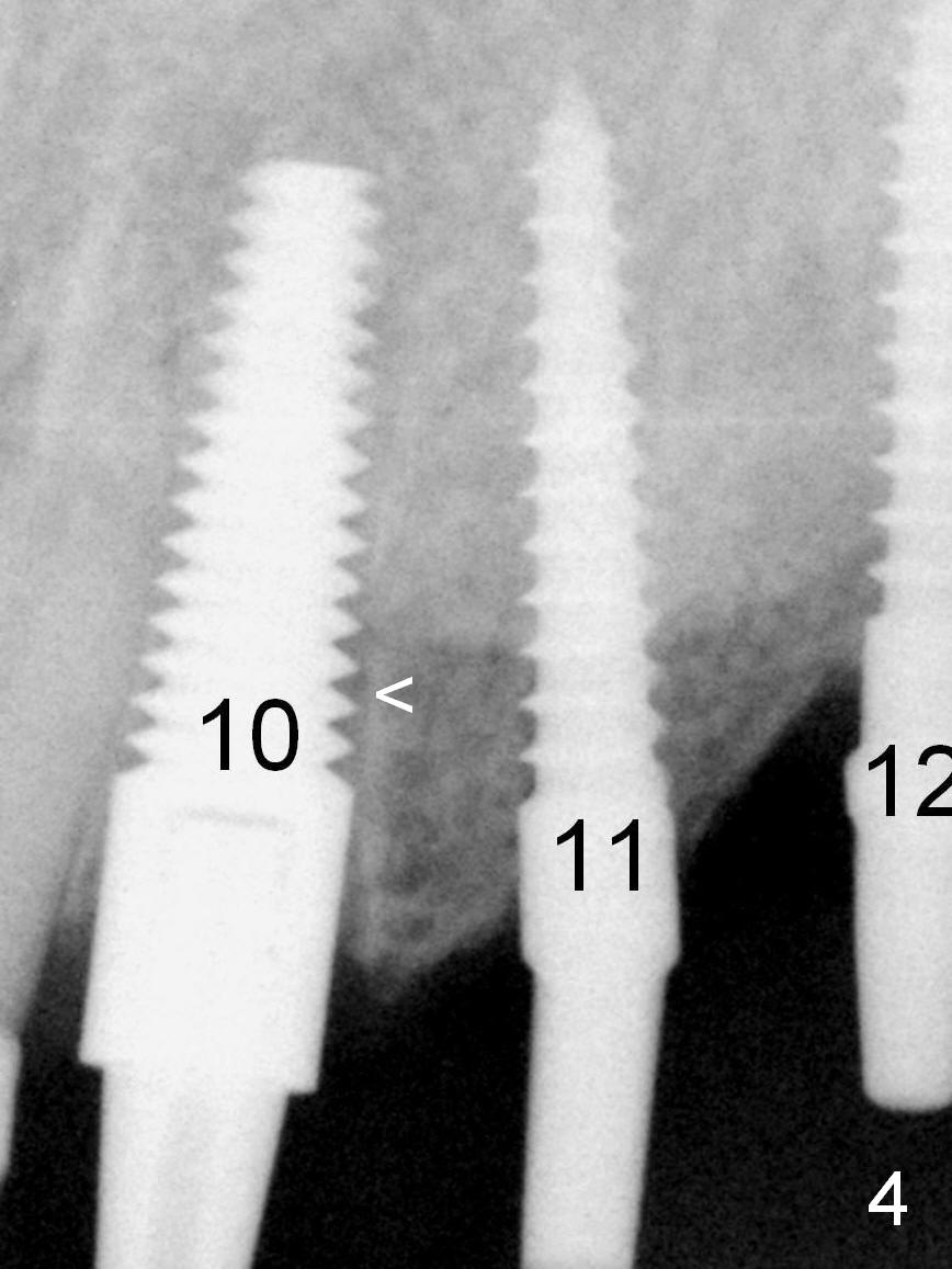 The patient returns for final restoration 3.5 months postop; it appears that the implants has osteointegrated (Fig.12). The bone has apparently grown into the threads of the implant, as compared to Fig.4 <). There is no crestal bone loss associated with these 3 implants.