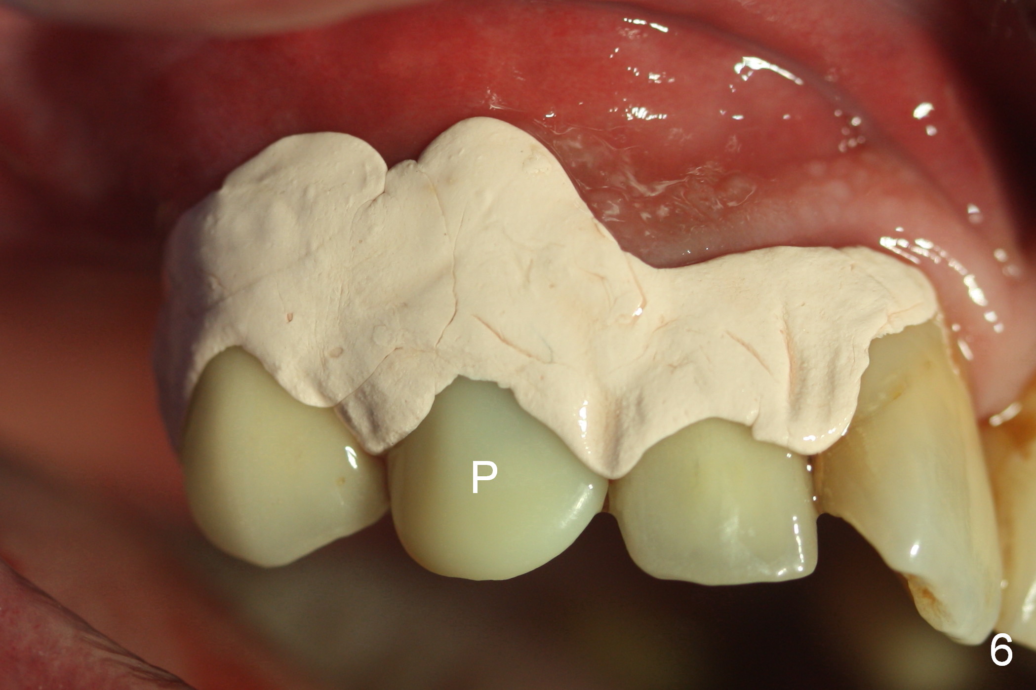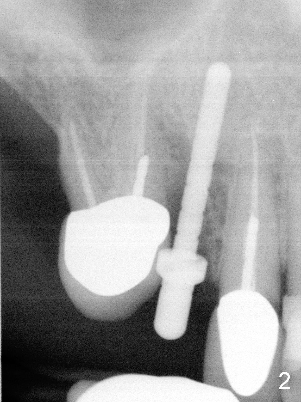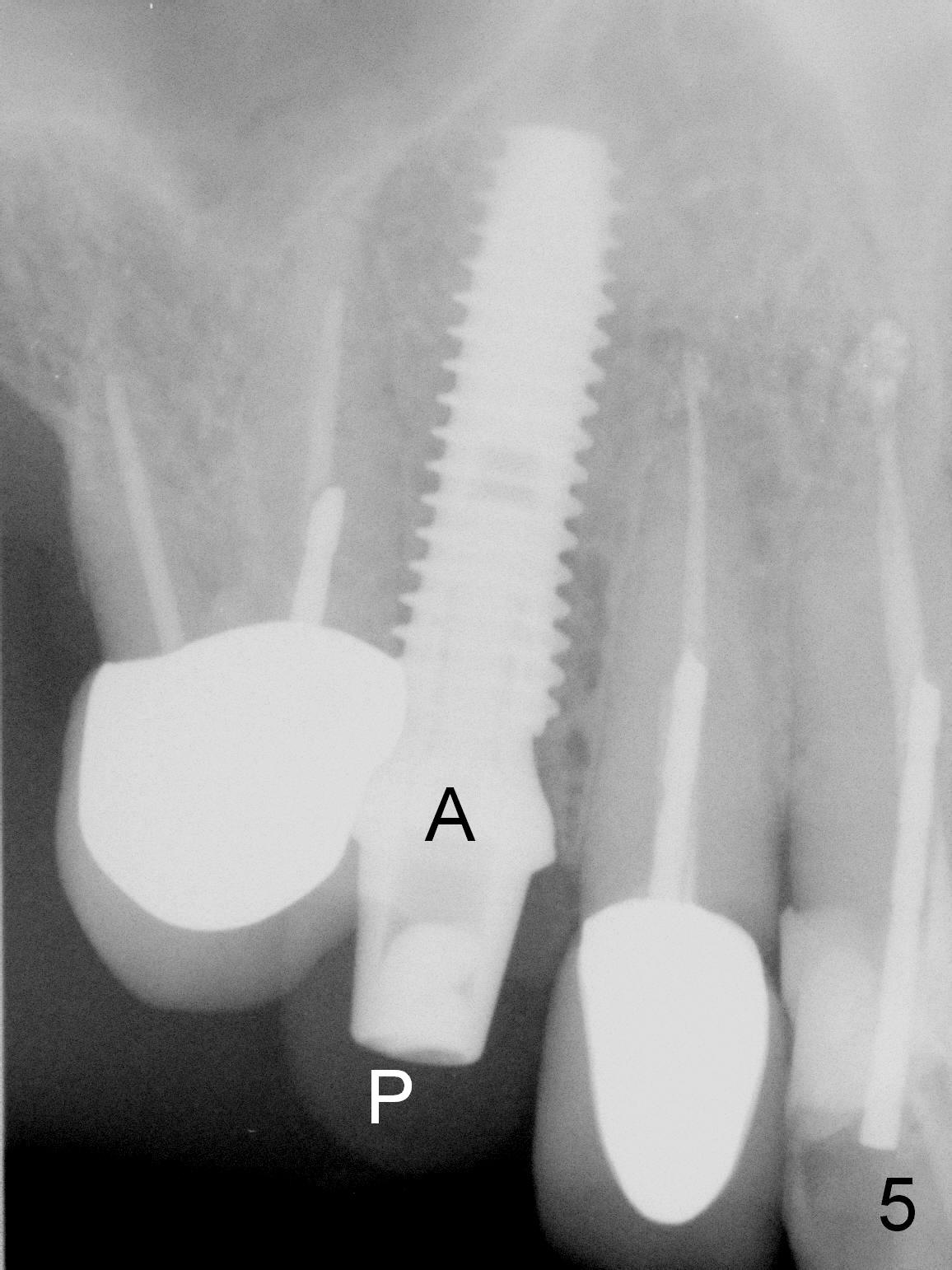 After extraction of the subgingival fractured upper right canine (Fig.1), the buccal plate is found to have been perforated at the apex. the root is measured 5x12 mm. Initial osteotomy with a 2 mm pilot drill shows that the bone is soft (Fig.2). After use of a 3.2 mm drill (underprep, normal drill size (3.7 mm)), a 4.5x15 mm implant is placed with insertion torque > 50 Ncm (Fig.3). The implant is further torqued until the implant plateau is 3 mm apical to the buccal gingival margin; a 5.5x5(3) mm abutment is placed (Fig.4,5 A). Osteogen plug is inserted into the apex of the socket, while the rest of gap is filled with mineralized cortical allograft and Osteogen. An immediate provisional (Fig.5,6 P) is fabricated to keep the graft in place, followed by periodontal dressing (Fig.6).