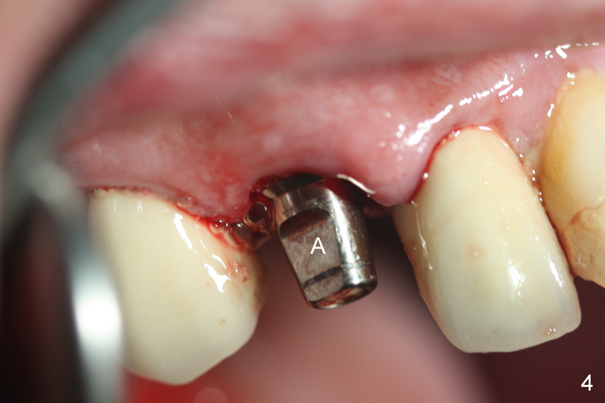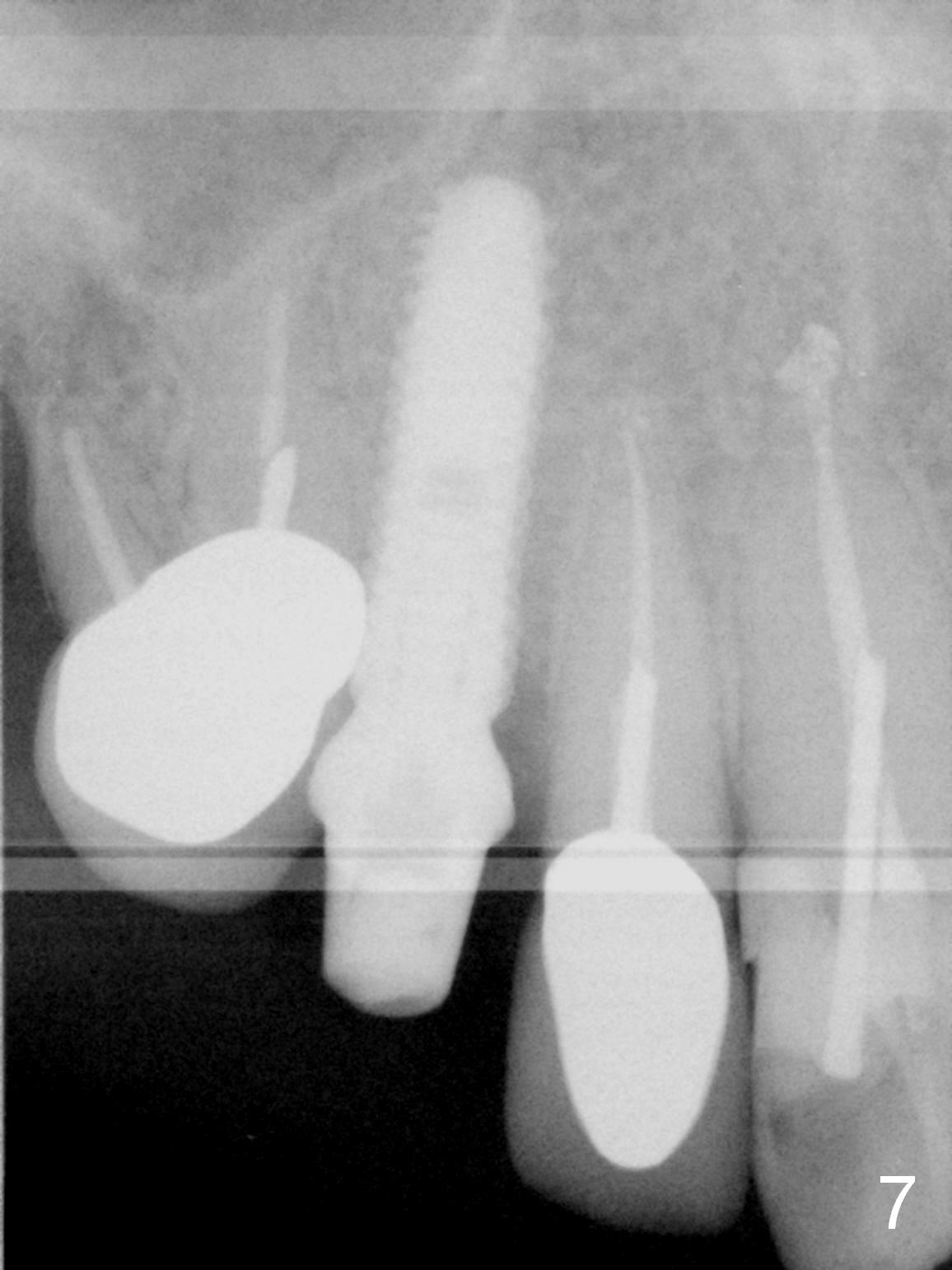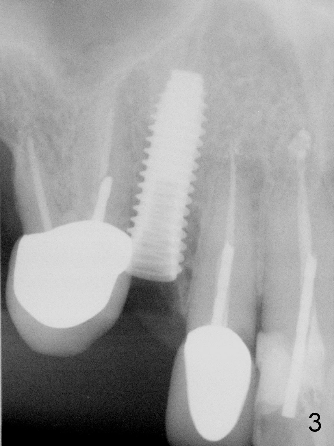 After extraction of the subgingival fractured upper right canine (Fig.1), the buccal plate is found to have been perforated at the apex. the root is measured 5x12 mm. Initial osteotomy with a 2 mm pilot drill shows that the bone is soft (Fig.2). After use of a 3.2 mm drill (underprep, normal drill size (3.7 mm)), a 4.5x15 mm implant is placed with insertion torque > 50 Ncm (Fig.3). The implant is further torqued until the implant plateau is 3 mm apical to the buccal gingival margin; a 5.5x5(3) mm abutment is placed (Fig.4,5 A). Osteogen plug is inserted into the apex of the socket, while the rest of gap is filled with mineralized cortical allograft and Osteogen. An immediate provisional (Fig.5,6 P) is fabricated to keep the graft in place, followed by periodontal dressing (Fig.6).