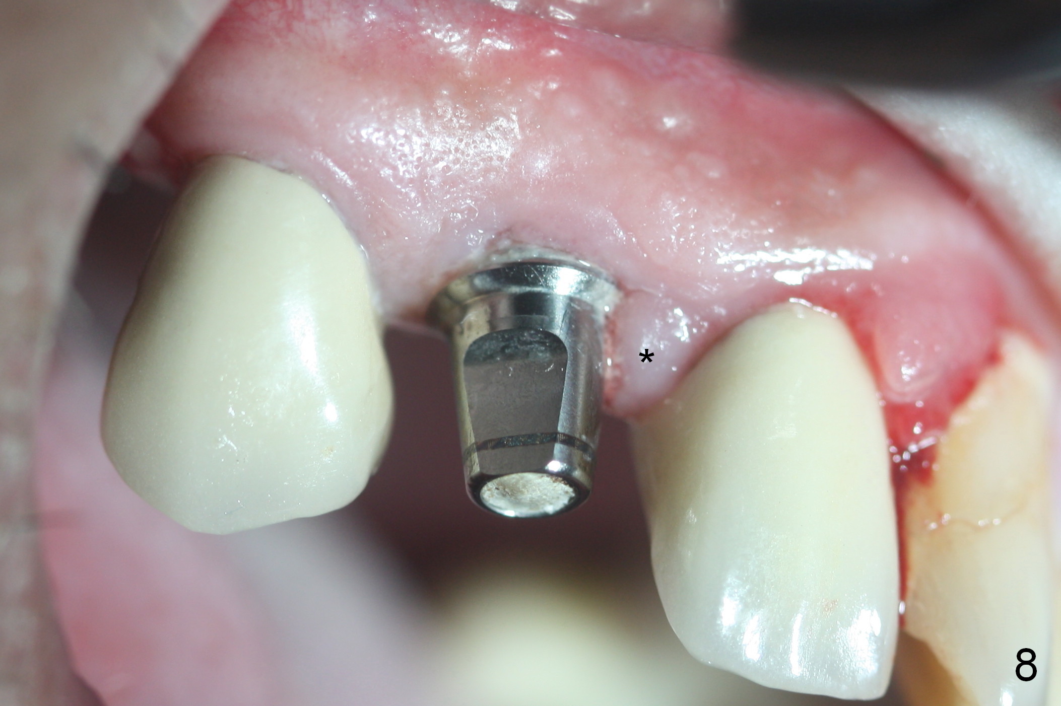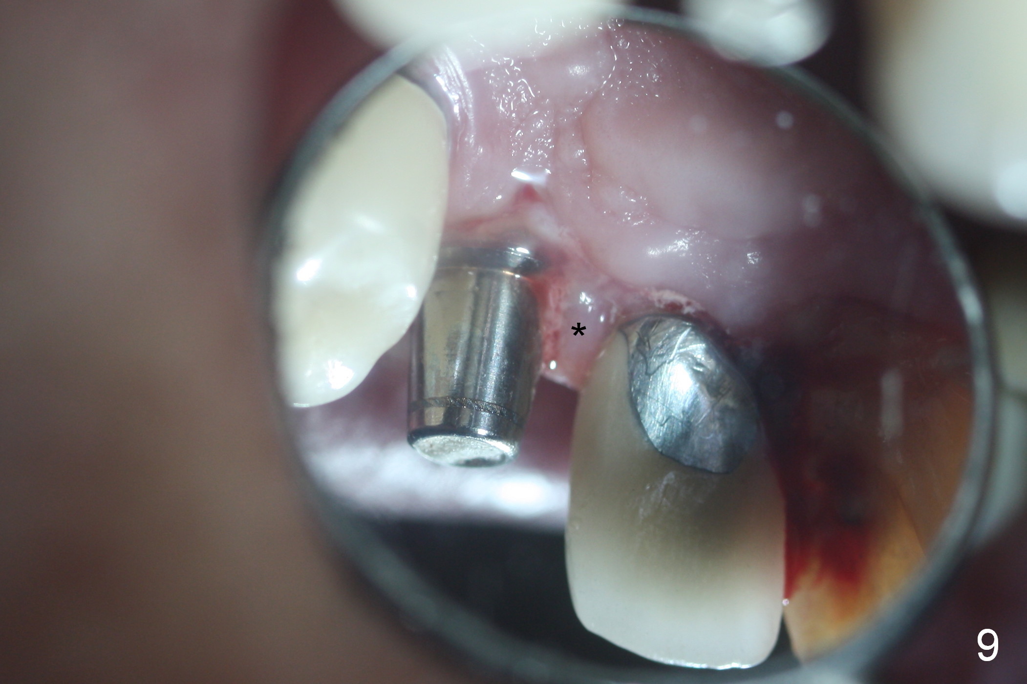 Three months postop, the provisional is dislodged (Fig.7-9). The mesial gingiva is hypertrophic buccally (Fig.8 *) and lingually (Fig.9 *). There appears to biologic width violation (Fig.5). The abutment should be changed to the one with smaller in diameter and longer in cuff (4.5x5(4) mm) with the buccal margin reduction.