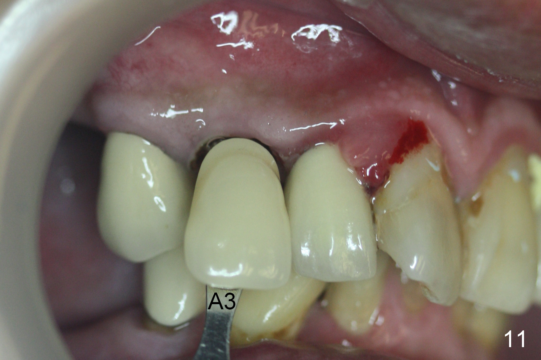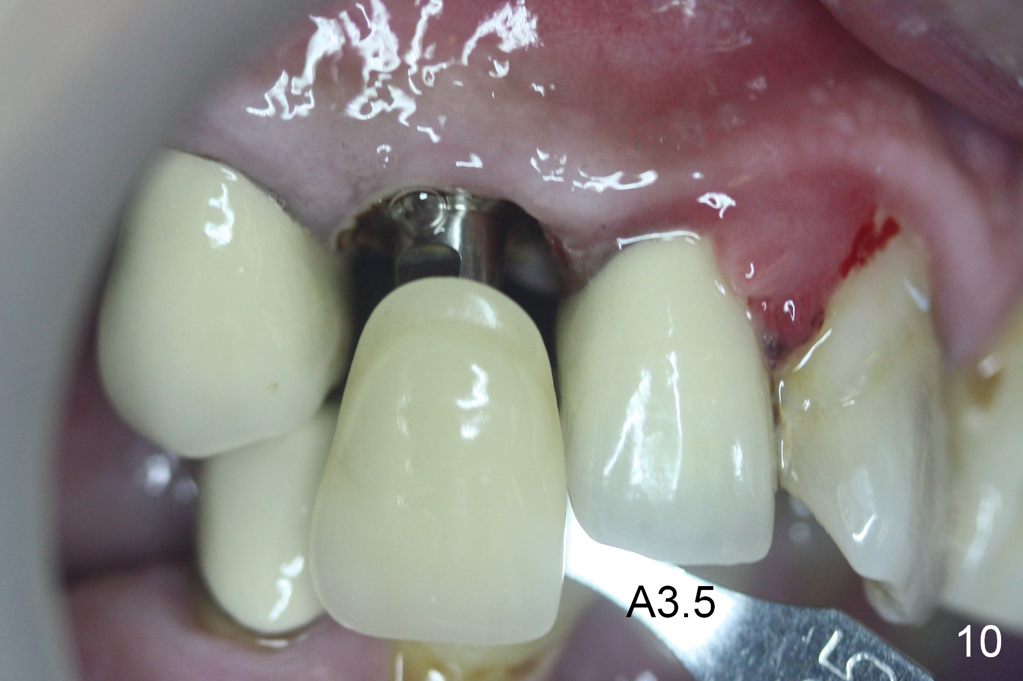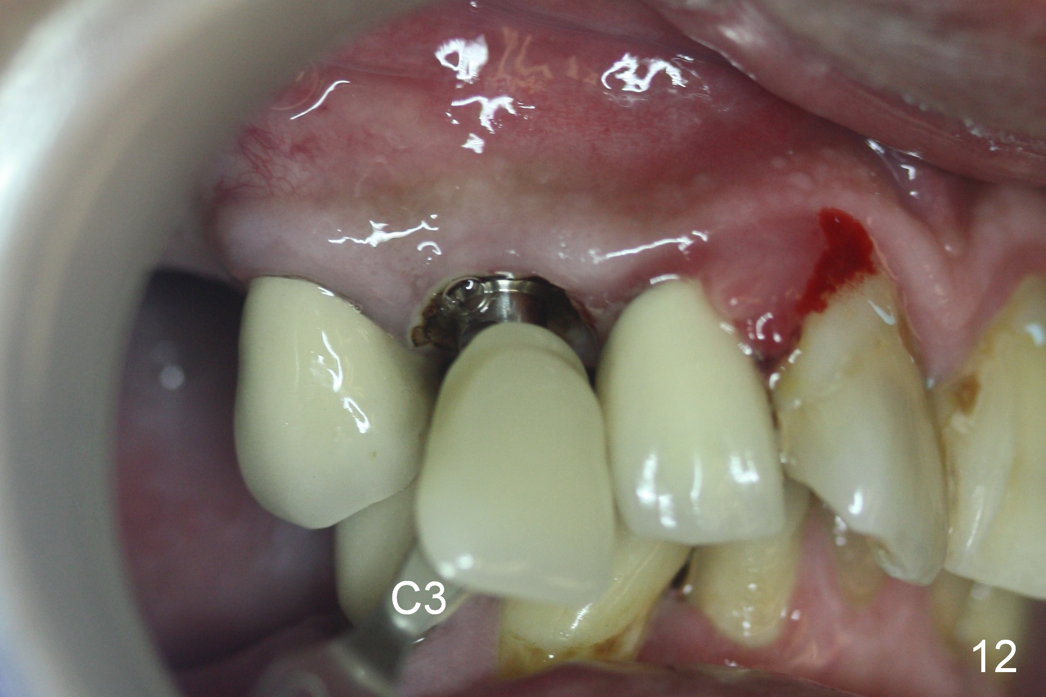 Six days post provisional reline, the mesial papilla erythema has subsided substantially; the abutment is changed to 4.5x5(2) with Diode gingivectomy (Fig.10-12).