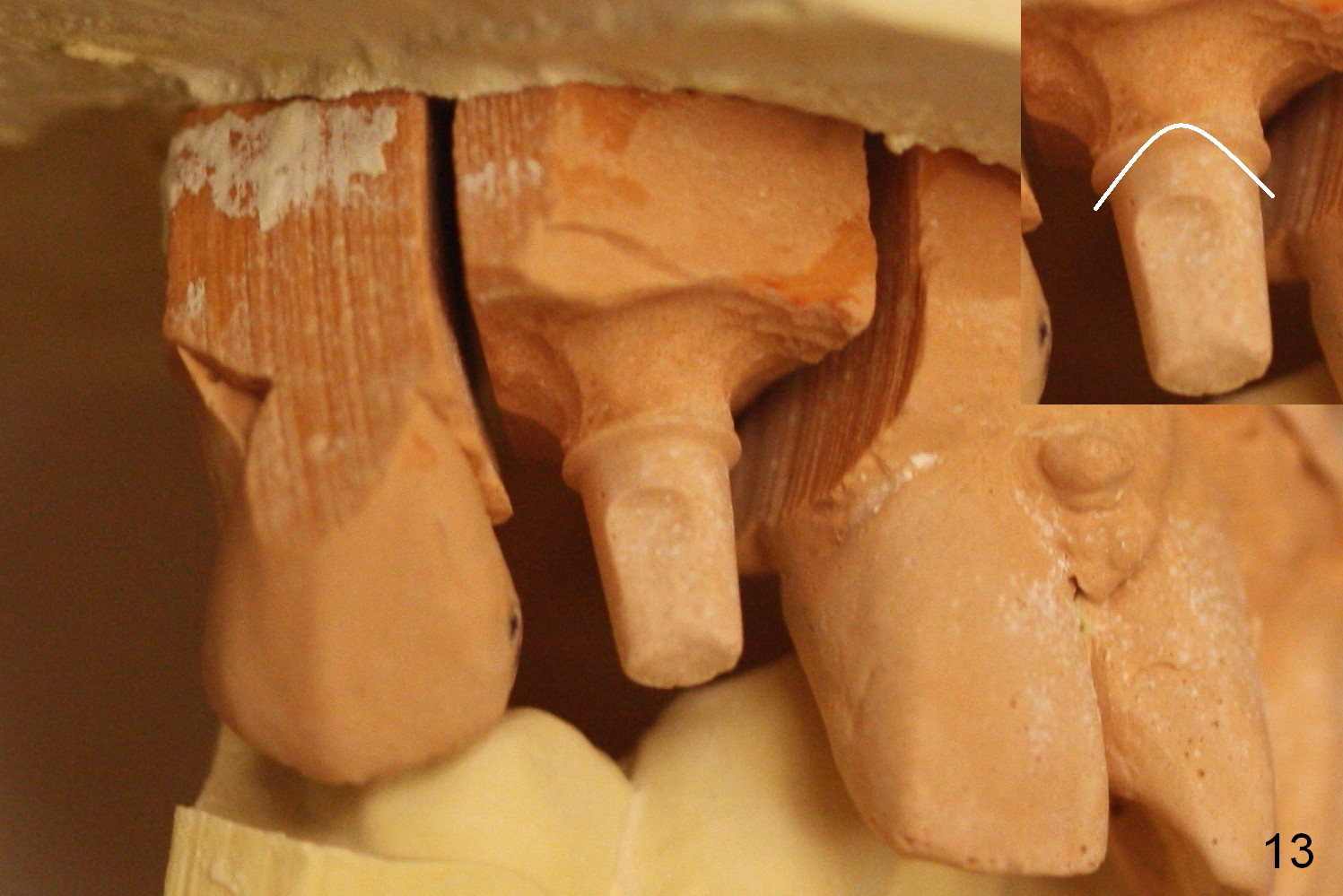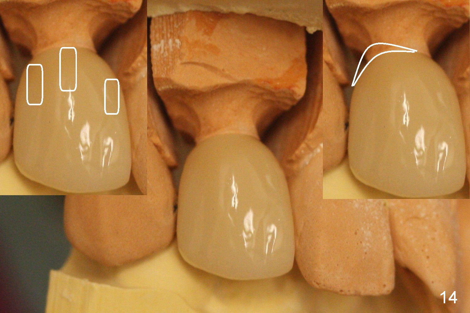 In fact the abutment margin is flat (Fig.13, not trimmed as shown in the inset). To avoid excess cement, cement is applied short of the mesial margin inside the crown (Fig.14 left inset (white area)). Once the crown is seated with cement, the excess one is present anywhere other than the mesial (Fig.14 right inset (white area)).