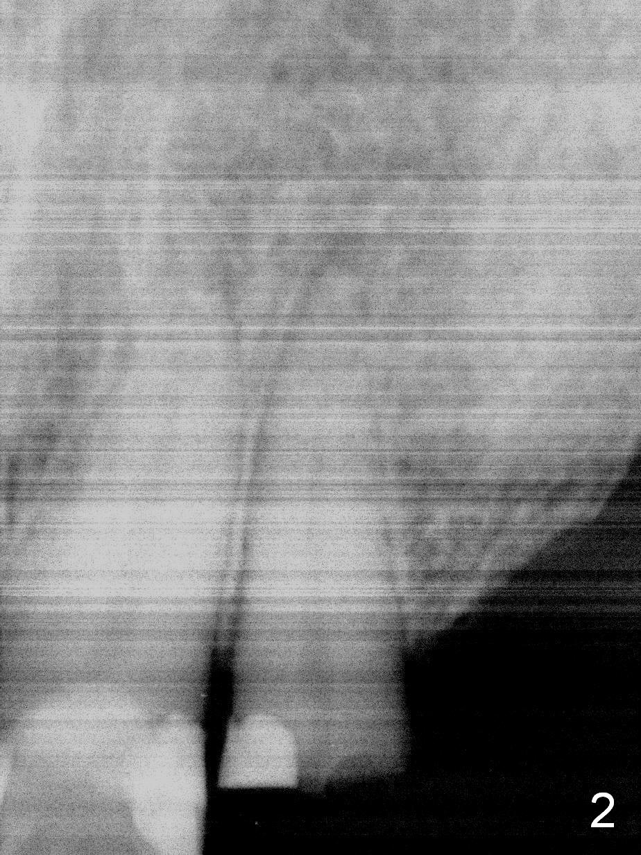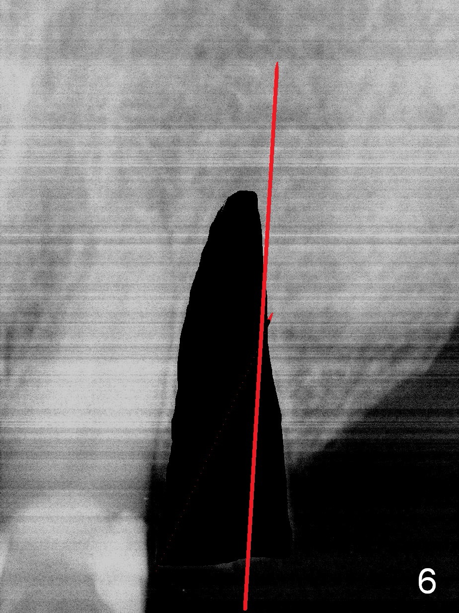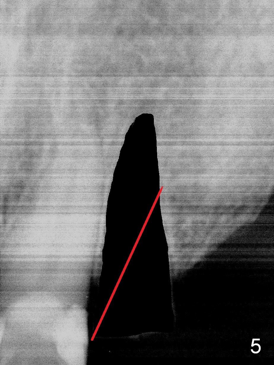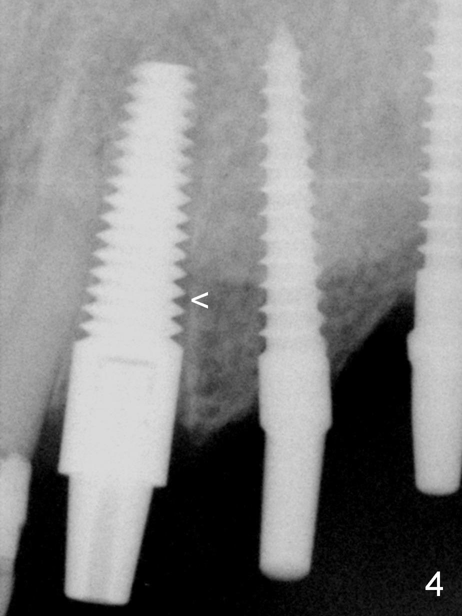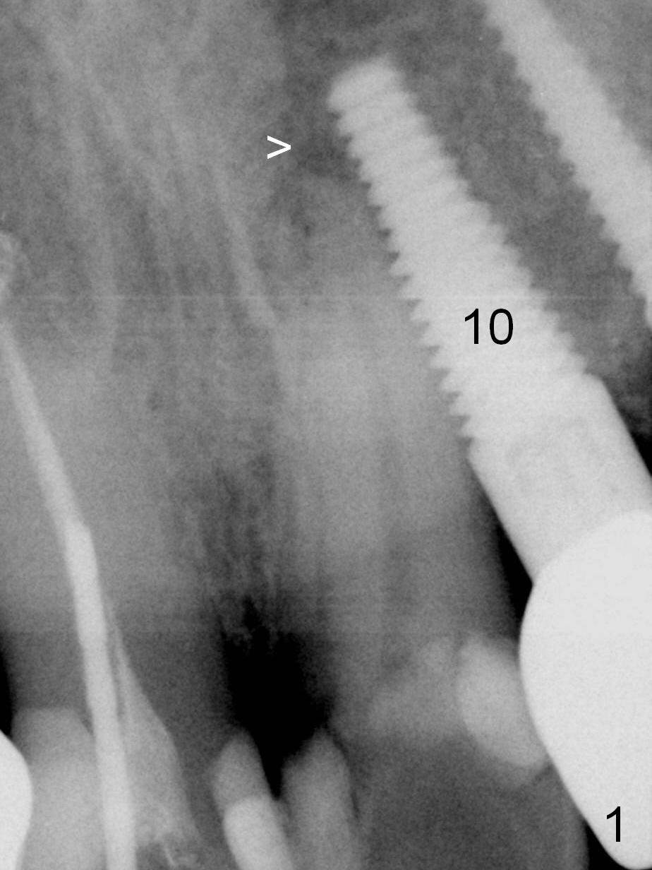 How to avoid apparent iatrogenic damage to the neighboring root? Preop PA shows approximation of these roots (Fig.2). Unfortunately the initial osteotomy is too mesial (Fig.3), which is unnoticed. When a 4.5x17 mm implant is placed, there is distal gap (Fig.4 <), while the mesial one is closed.