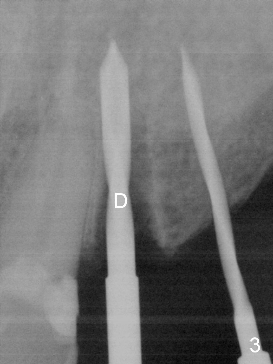 Six months post cementation of implant crown at #10, the tooth #9 becomes symptomatic with buccal apical swelling and tenderness (Fig.1). The implant and the neighboring root are close to each other. Due to extensive restoration and periapical radiolucency at #9 with percussion, root canal therapy begins with placement of calcium hydroxide. The pain reduces by the evening.