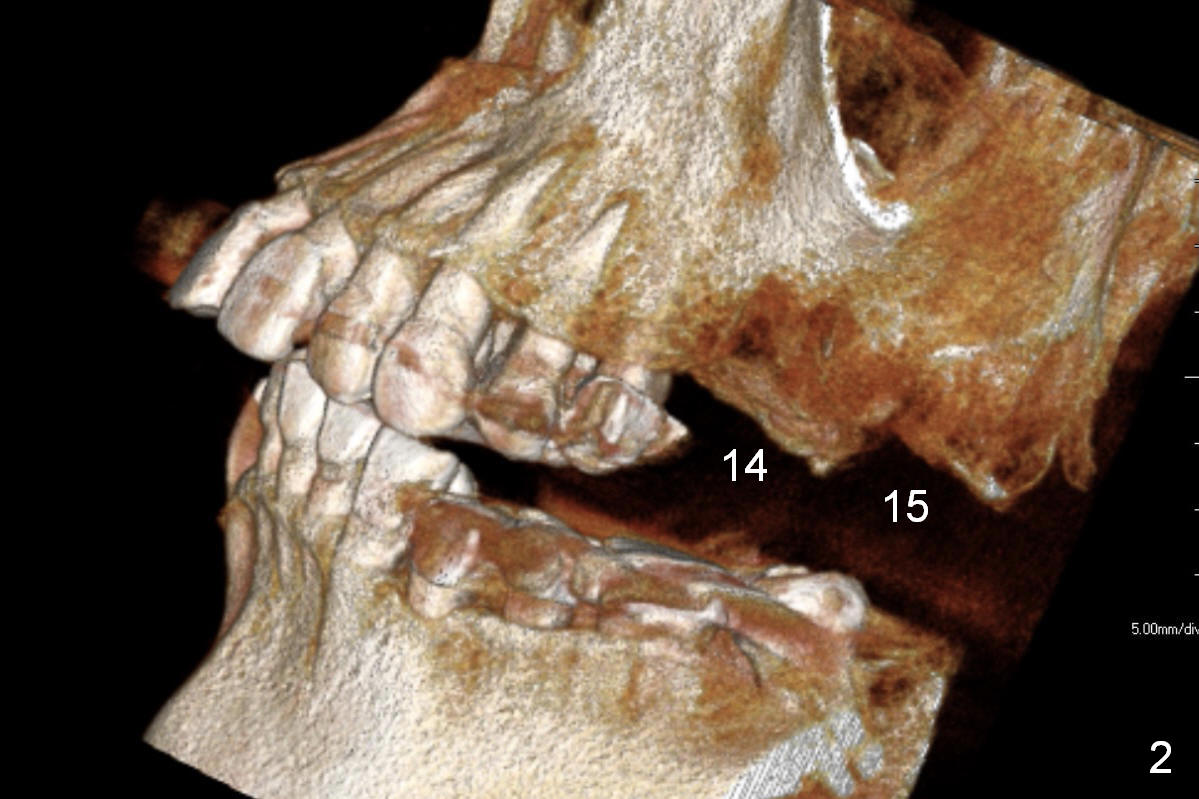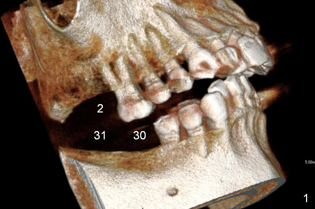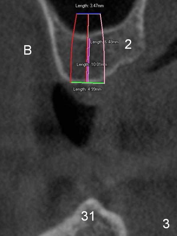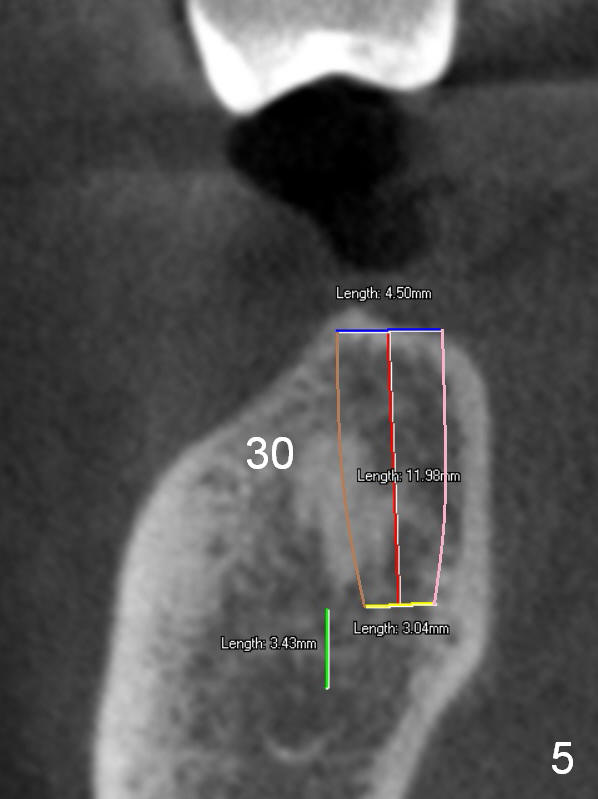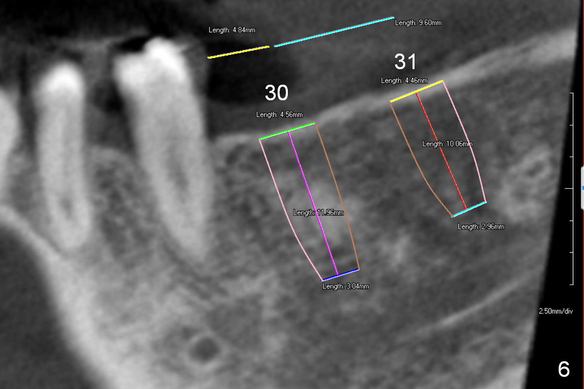 On the other hand, her occlusion is out of order. The teeth #2,14,15,30 and 31 are missing with #3 supraeruption and deep anterior overbite and overjet (Fig.1,2). This may lead to TMD. Alginate impression will be taken for fabrication of night guard or occlusal guard to raise vertical height. If this helps, implants are placed (Fig.3-6), followed by limited or comprehensive ortho to intrude #3, to permanently change her occlusion.