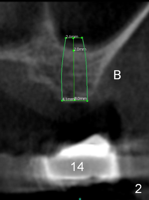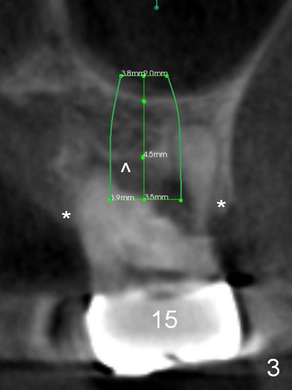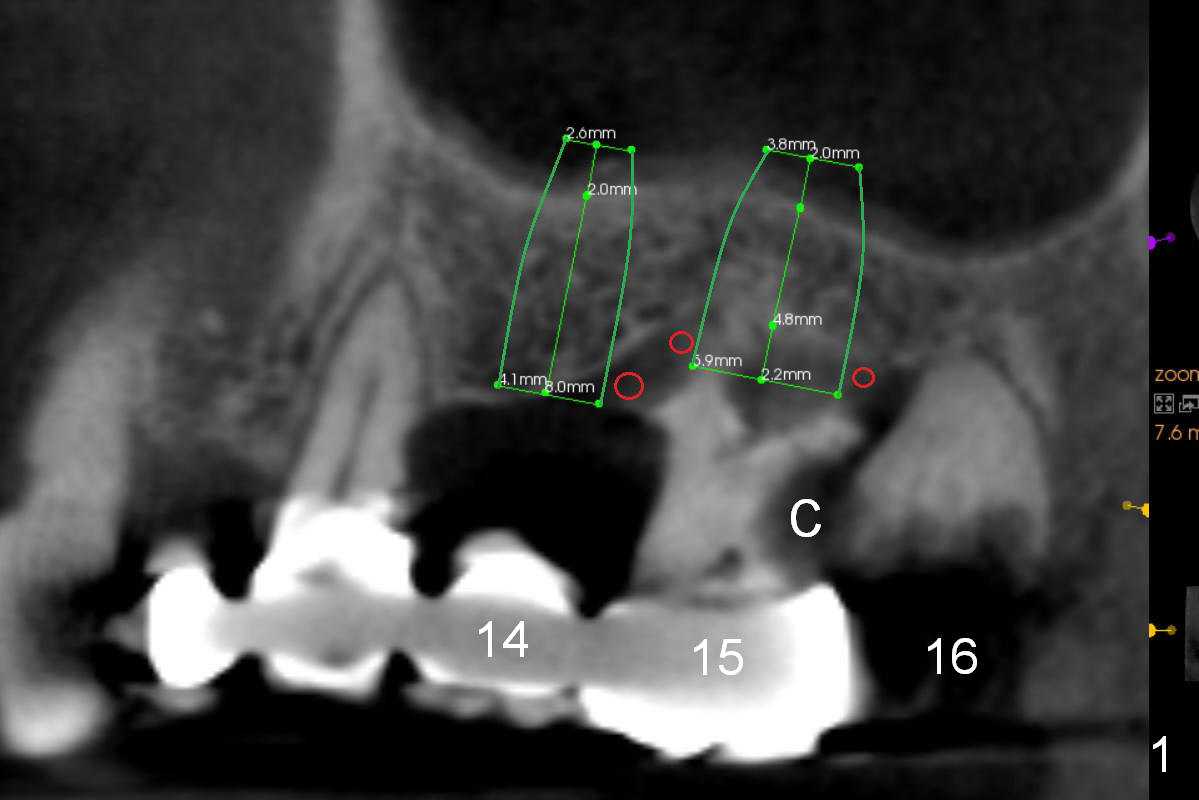 The tooth #15 of a 56-year-old man appears to be non-salvageable due to the large distal cervical caries (Fig.1 (CBCT) C). Immediately after extraction and socket debridement and antibiotic soaking, a 2 mm pilot drill is used for 4 mm, followed by 2.8 and 3.6 mm round burs for 4-6 mm (Fig.1,2 (coronal section)). At #14, the initial depth for 2 mm and 2.8 mm drills is 7 mm. The depth may increase until 9 mm (Fig.1,3). Insert parallel pins after initial osteotomies; check with surgical stent and/or take PA. After placement of allograft/Osteogen, place 4x10 and 6x8 or 10 mm implants at #14 and 15, respectively.