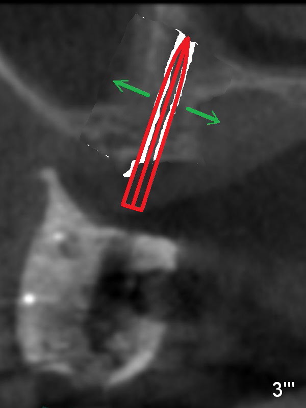 When a large bone expander (Fig.3''' red arrow) is placed, the bone on either sinus or palatal side is displaced (green arrow)