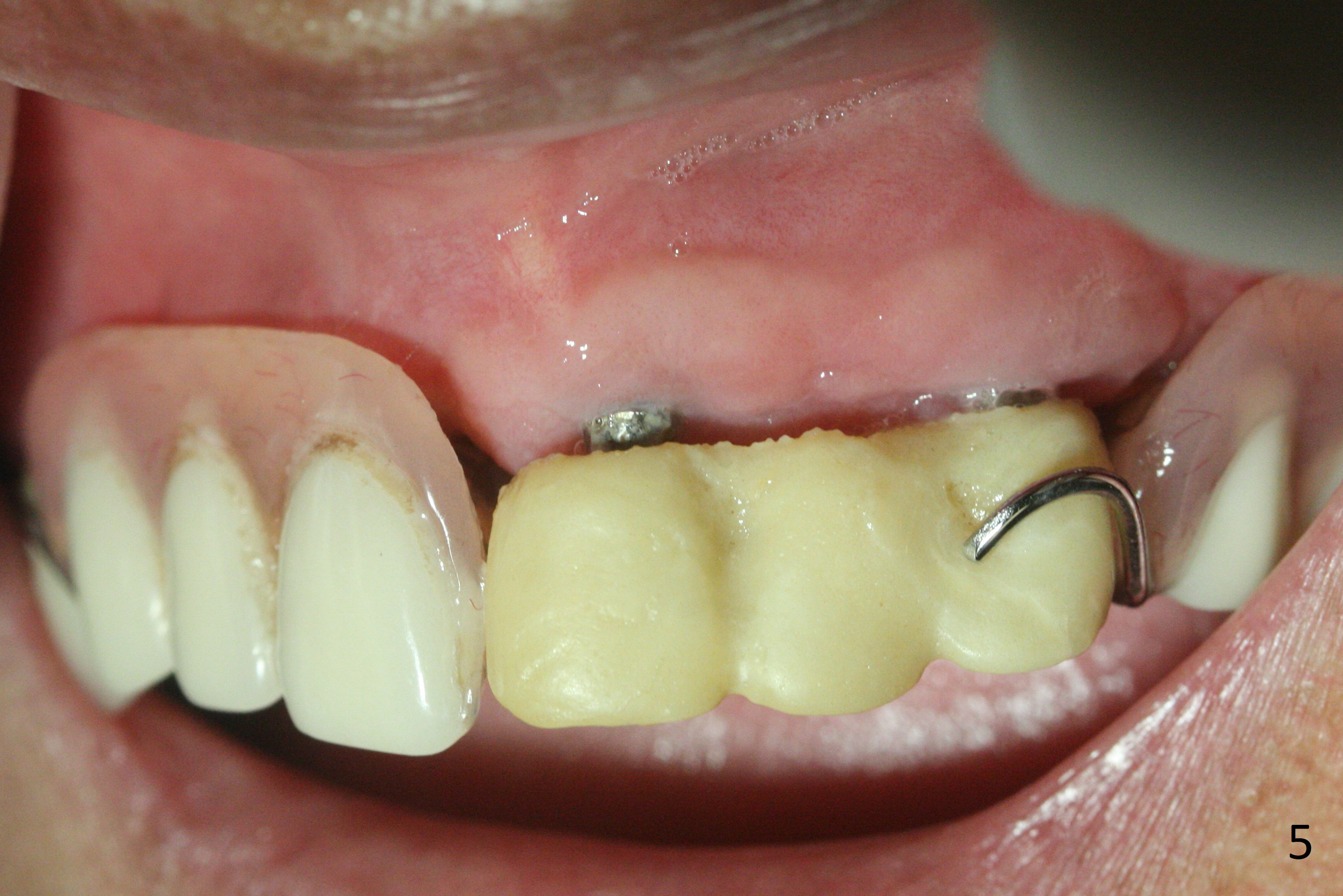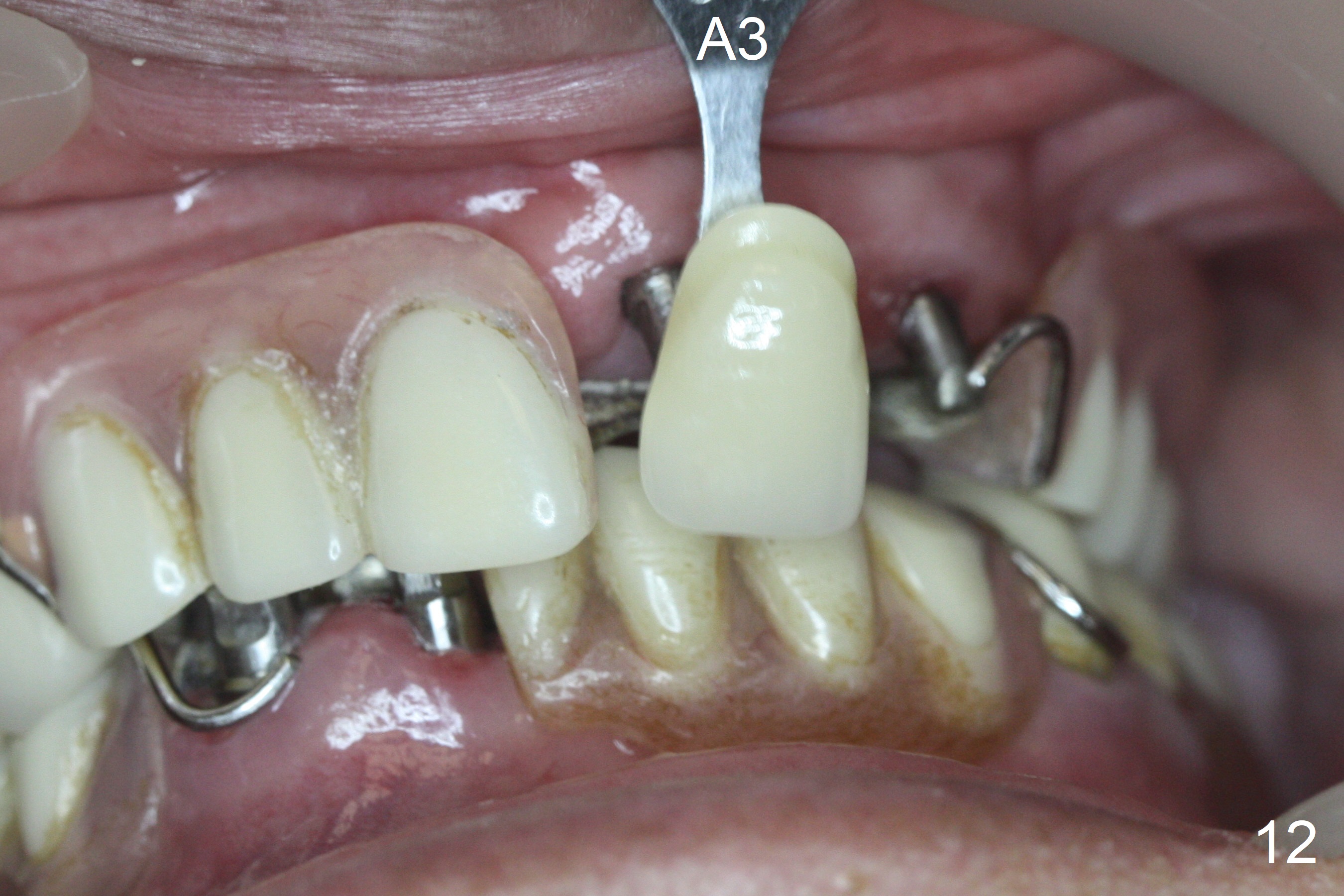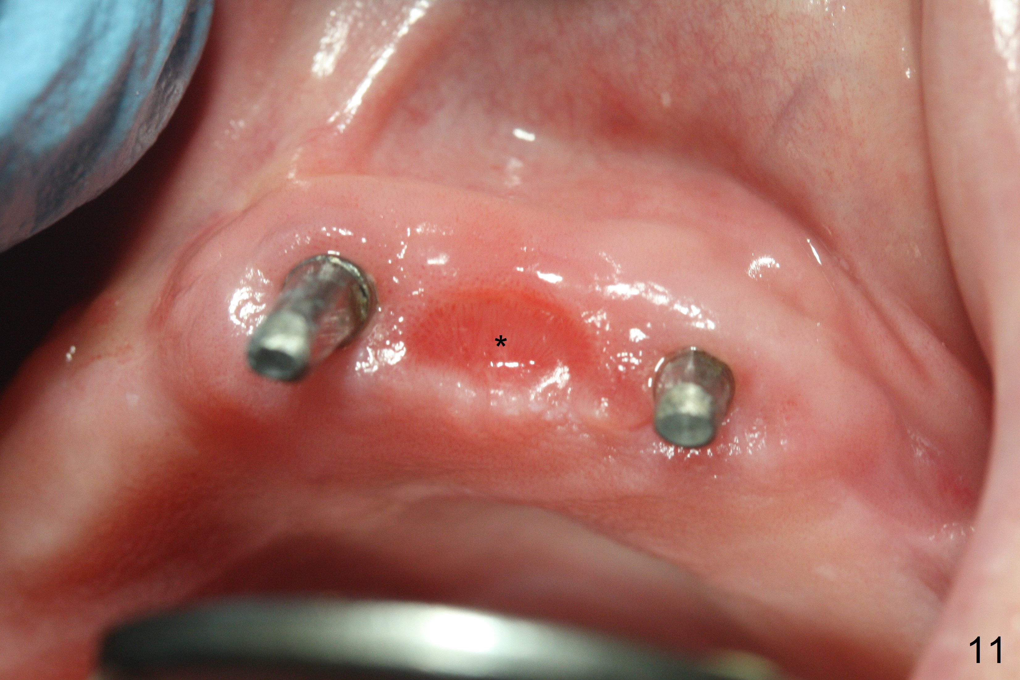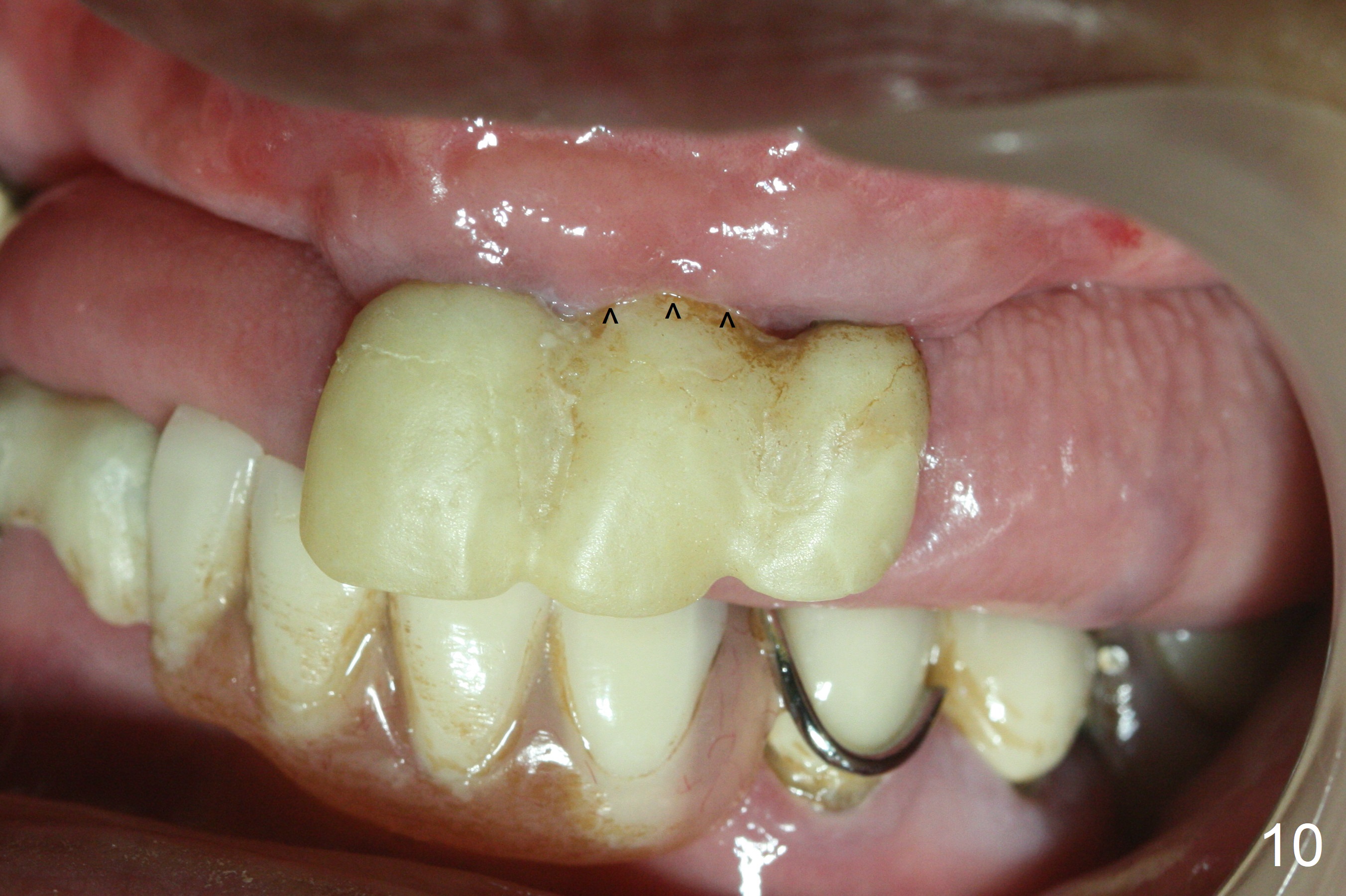 Incision reveals that the ridge at #9 and 11 is narrower than expected. A 3x14 mm 15º 1 piece implant is placed at the site of #9, while a 3x17 mm straight 1-piece one is placed at #11 (Fig.1,4). Insertion torques at #9 and 11 are 20 and 30 Ncm, respectively. The relatively low insertion torque is partially due to osteoporosis. The 65-year-old lady also has dry mouth. Osteotomy should be underprep. The position and trajectory of the implants are dictated by the partial denture (Fig.2). After minor abutment adjustment (Fig.3), an immediate provisional bridge is fabricated. There is no interference when the partial is removed and inserted. After bone graft (Fig.4 ^) and Osteogen Membrane, the ridge (Fig.3) is wider than before. The patient returns for reline 2 months postop (Fig.5-7). In spite of insufficient oral hygiene, the gingiva remains healthy around the implants. To form distinct papillae, acrylic should be added to (Fig.8 yellow line) and removed from (hushed area) the individual provisional crowns. One month after provisional modification (Fig.10, as compared to Fig.5), the pontic recipient site is concave (Fig.11) and becomes less concave after cord packing and abutment trimming. When the provisional bridge is reseated after impression (Fig.12), the pontic recipient site must be blanched again. Please trim the pontic recipient site of the model ~ .5 mm to enhance cosmetics. Water Pik has been used since surgery, but it may be related to loss of bone graft 3.5 months postop (Fig.9 *). One month post cementation, the patient has complained of pain when water pik is irrigating the gingiva palatal to the FPD, apparently in association with denture-related Candidiasis. Two weeks of use of Mycostatin Oral Suspension, peri-implantitis or peri-implant mucositis-like signs and symptoms disappear (Fig.13). CBCT taken 6 months postop confirms that the implants appear to be have been placed in the bone (14,15). The FPD appears to be loose 2.5 years post cementation.