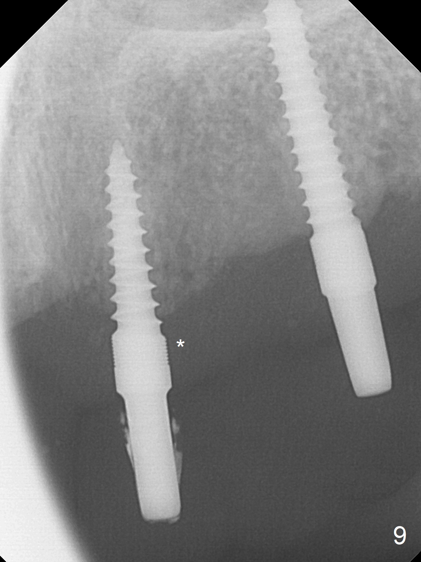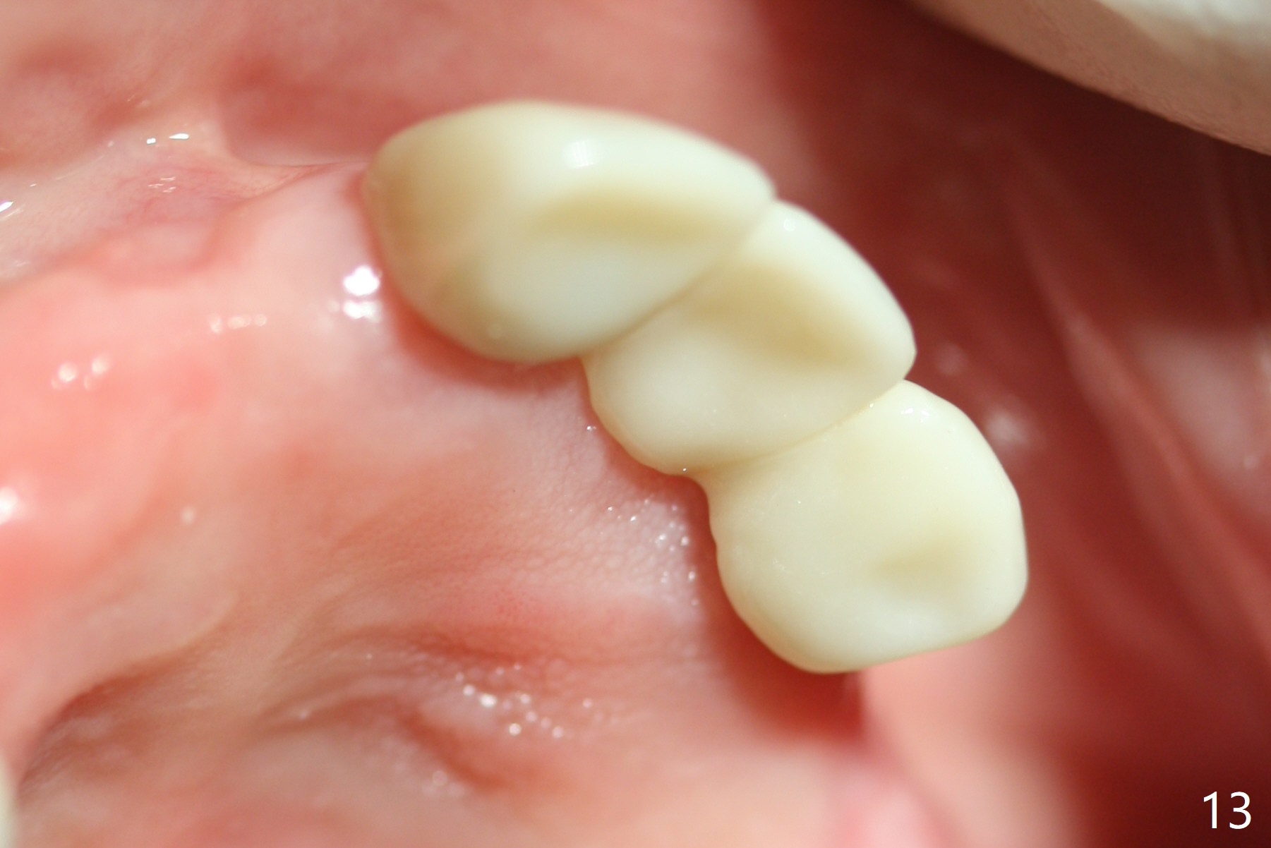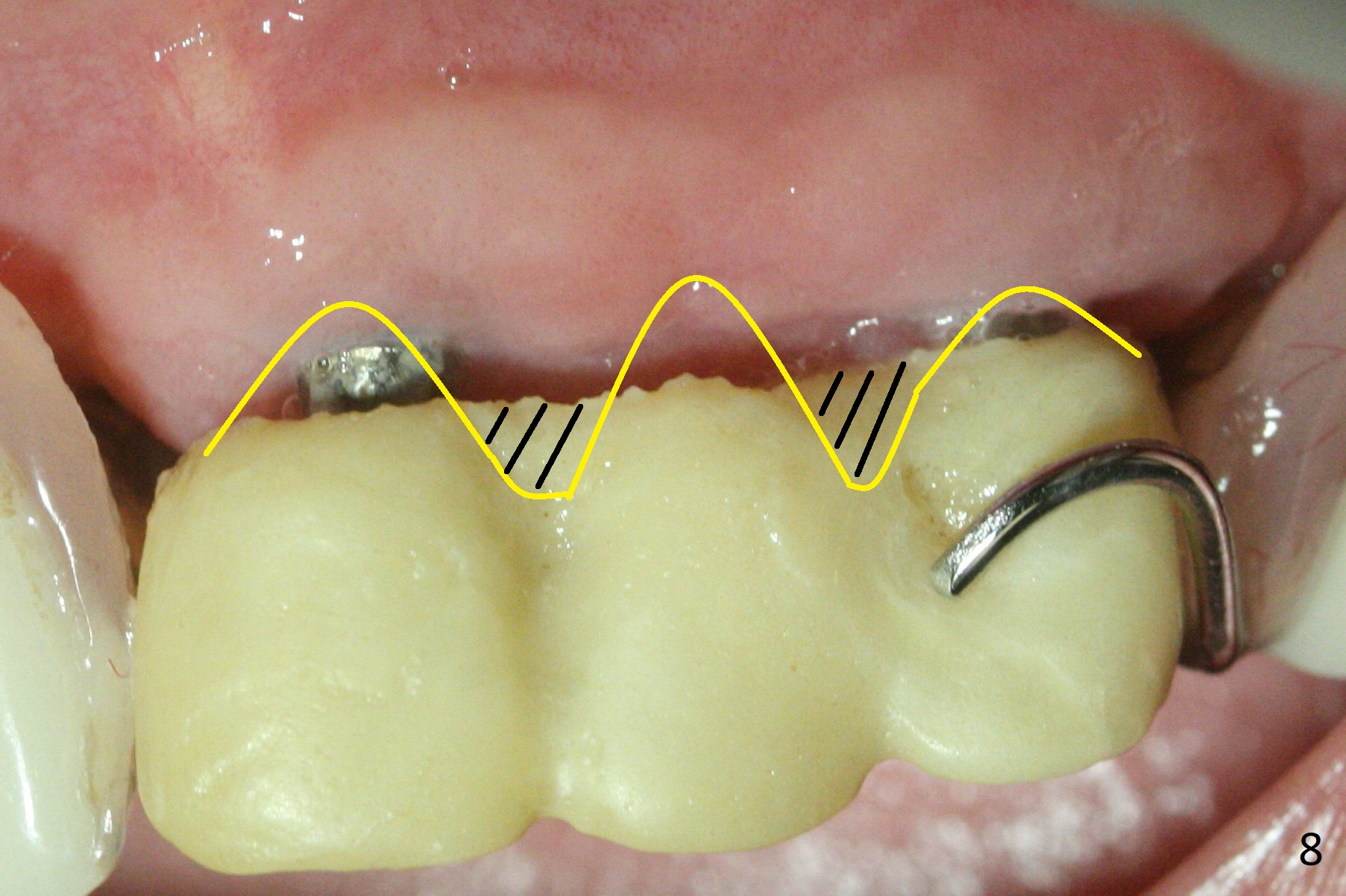 Incision reveals that the ridge at #9 and 11 is narrower than expected. A 3x14 mm 15º 1 piece implant is placed at the site of #9, while a 3x17 mm straight 1-piece one is placed at #11 (Fig.1,4). Insertion torques at #9 and 11 are 20 and 30 Ncm, respectively. The relatively low insertion torque is partially due to osteoporosis. The 65-year-old lady also has dry mouth. Osteotomy should be underprep. The position and trajectory of the implants are dictated by the partial denture (Fig.2). After minor abutment adjustment (Fig.3), an immediate provisional bridge is fabricated. There is no interference when the partial is removed and inserted. After bone graft (Fig.4 ^) and Osteogen Membrane, the ridge (Fig.3) is wider than before. The patient returns for reline 2 months postop (Fig.5-7). In spite of insufficient oral hygiene, the gingiva remains healthy around the implants. To form distinct papillae, acrylic should be added to (Fig.8 yellow line) and removed from (hushed area) the individual provisional crowns. One month after provisional modification (Fig.10, as compared to Fig.5), the pontic recipient site is concave (Fig.11) and becomes less concave after cord packing and abutment trimming. When the provisional bridge is reseated after impression (Fig.12), the pontic recipient site must be blanched again. Please trim the pontic recipient site of the model ~ .5 mm to enhance cosmetics. Water Pik has been used since surgery, but it may be related to loss of bone graft 3.5 months postop (Fig.9 *). One month post cementation, the patient has complained of pain when water pik is irrigating the gingiva palatal to the FPD, apparently in association with denture-related Candidiasis. Two weeks of use of Mycostatin Oral Suspension, peri-implantitis or peri-implant mucositis-like signs and symptoms disappear (Fig.13). CBCT taken 6 months postop confirms that the implants appear to be have been placed in the bone (14,15). The FPD appears to be loose 2.5 years post cementation.