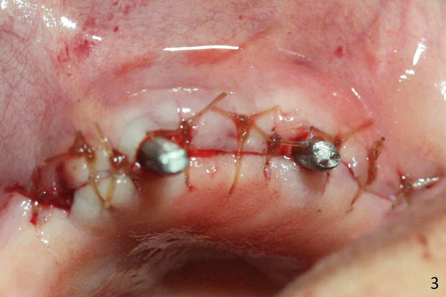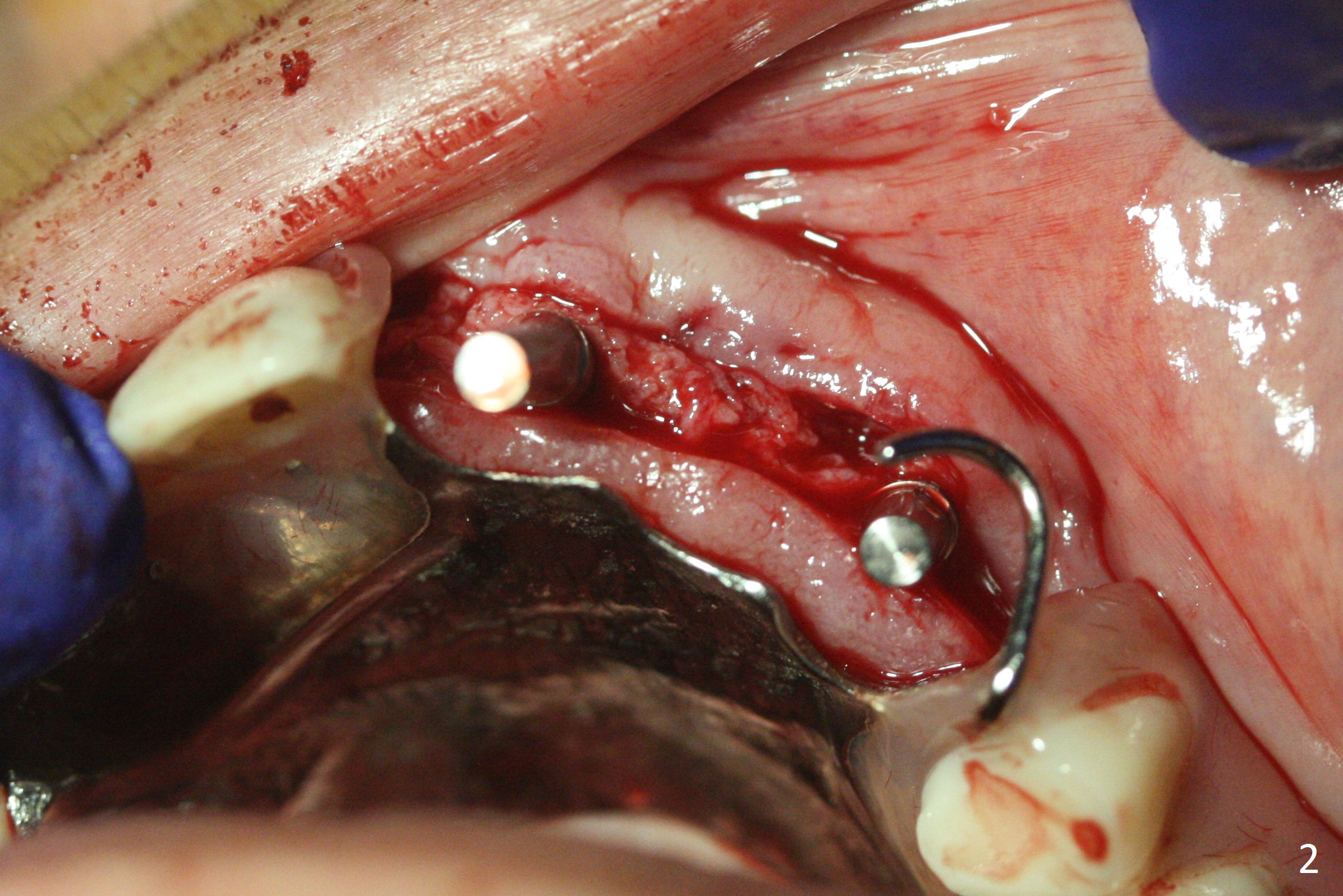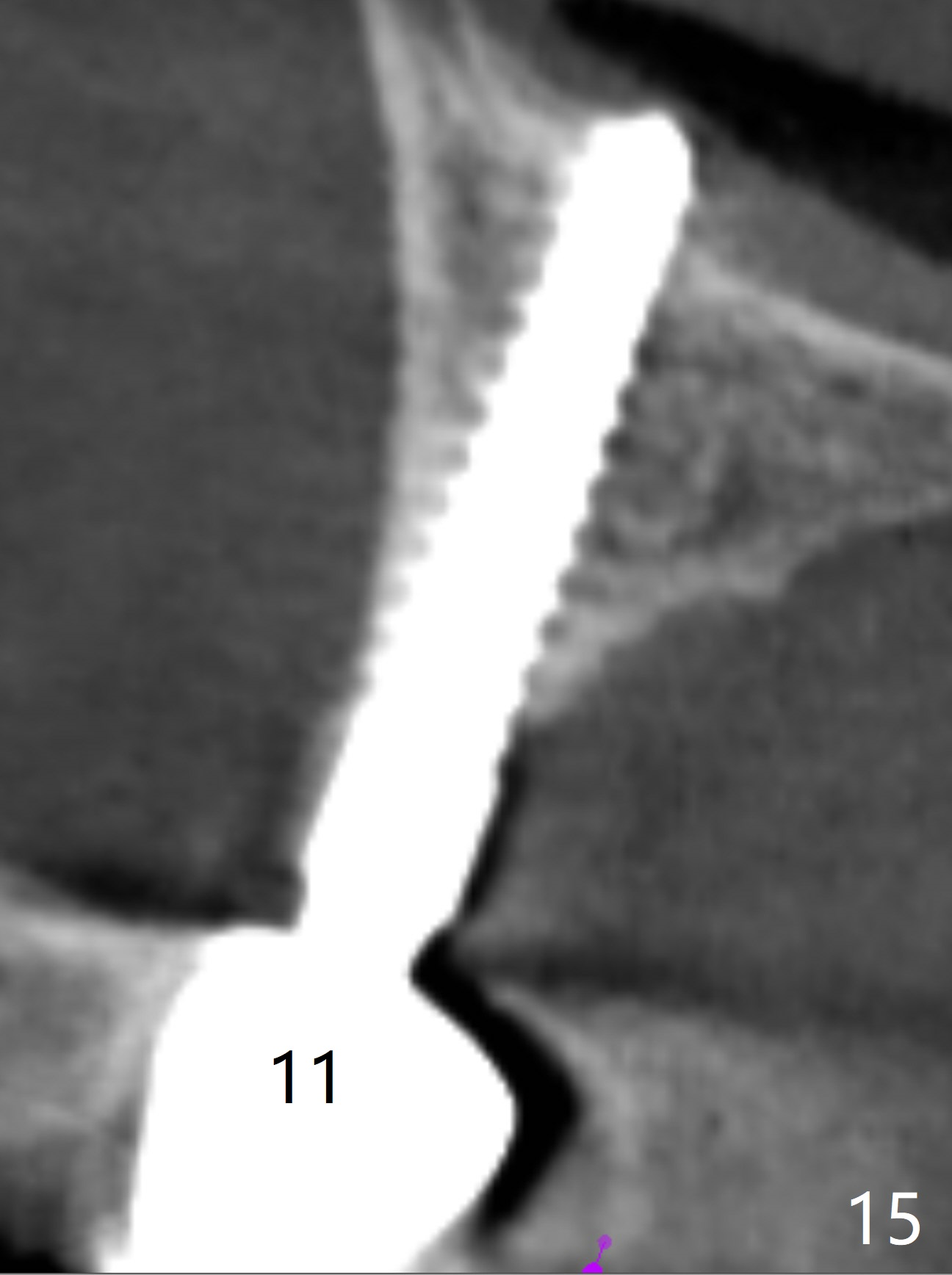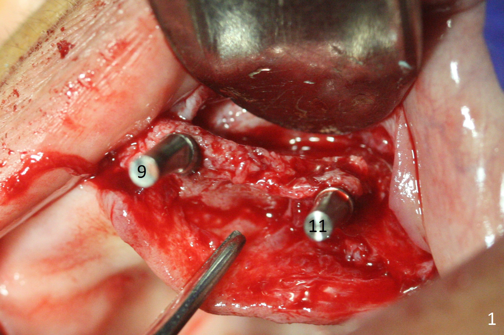 Incision reveals that the ridge at #9 and 11 is narrower than expected. A 3x14 mm 15º 1 piece implant is placed at the site of #9, while a 3x17 mm straight 1-piece one is placed at #11 (Fig.1,4). Insertion torques at #9 and 11 are 20 and 30 Ncm, respectively. The relatively low insertion torque is partially due to osteoporosis. The 65-year-old lady also has dry mouth. Osteotomy should be underprep. The position and trajectory of the implants are dictated by the partial denture (Fig.2). After minor abutment adjustment (Fig.3), an immediate provisional bridge is fabricated. There is no interference when the partial is removed and inserted. After bone graft (Fig.4 ^) and Osteogen Membrane, the ridge (Fig.3) is wider than before. The patient returns for reline 2 months postop (Fig.5-7). In spite of insufficient oral hygiene, the gingiva remains healthy around the implants. To form distinct papillae, acrylic should be added to (Fig.8 yellow line) and removed from (hushed area) the individual provisional crowns. One month after provisional modification (Fig.10, as compared to Fig.5), the pontic recipient site is concave (Fig.11) and becomes less concave after cord packing and abutment trimming. When the provisional bridge is reseated after impression (Fig.12), the pontic recipient site must be blanched again. Please trim the pontic recipient site of the model ~ .5 mm to enhance cosmetics. Water Pik has been used since surgery, but it may be related to loss of bone graft 3.5 months postop (Fig.9 *). One month post cementation, the patient has complained of pain when water pik is irrigating the gingiva palatal to the FPD, apparently in association with denture-related Candidiasis. Two weeks of use of Mycostatin Oral Suspension, peri-implantitis or peri-implant mucositis-like signs and symptoms disappear (Fig.13). CBCT taken 6 months postop confirms that the implants appear to be have been placed in the bone (14,15). The FPD appears to be loose 2.5 years post cementation.
