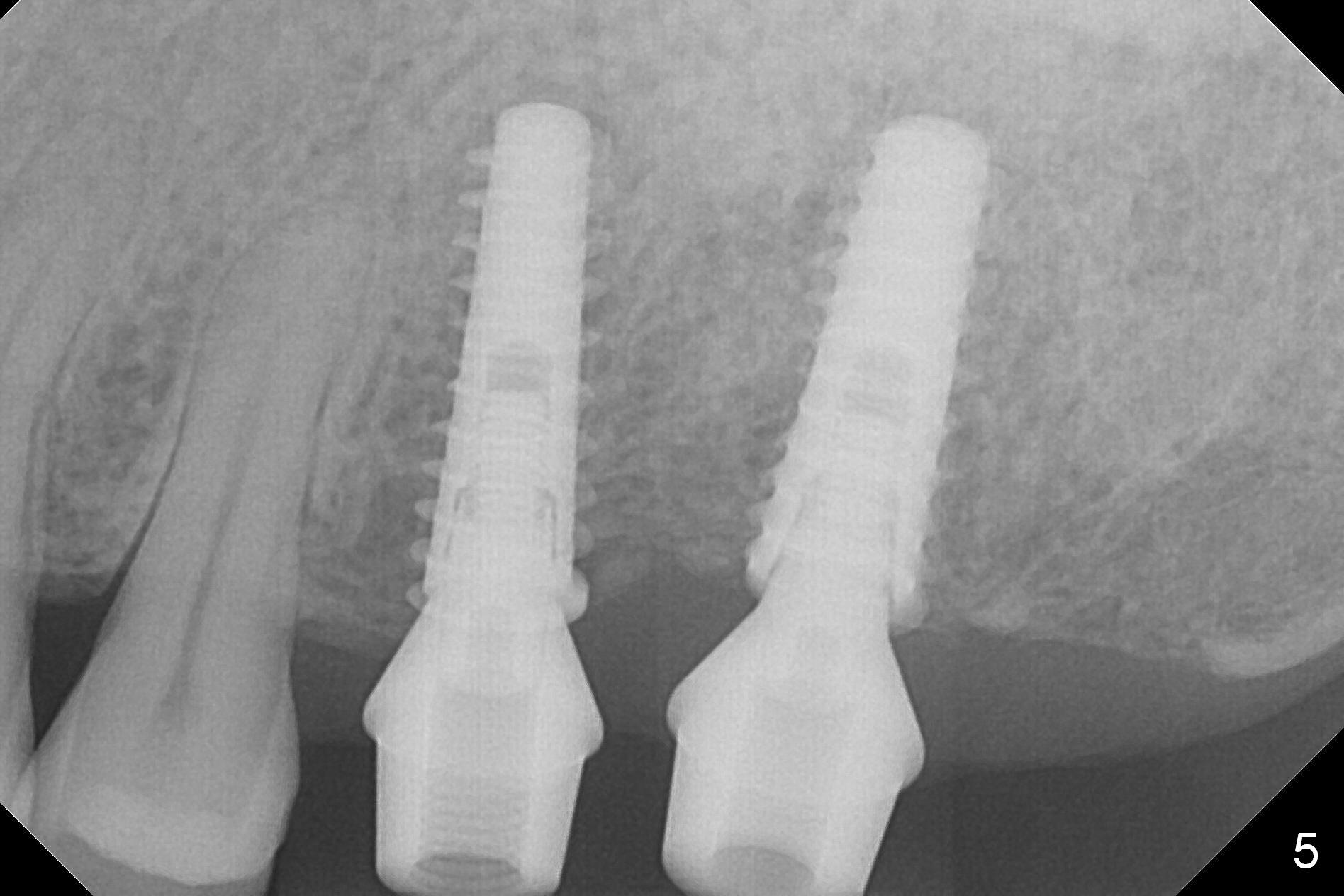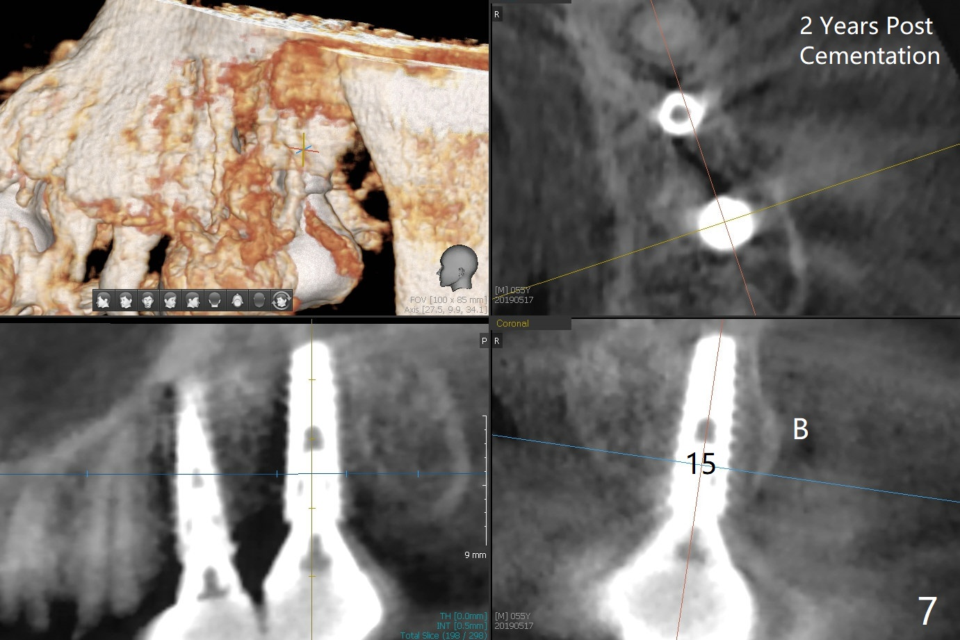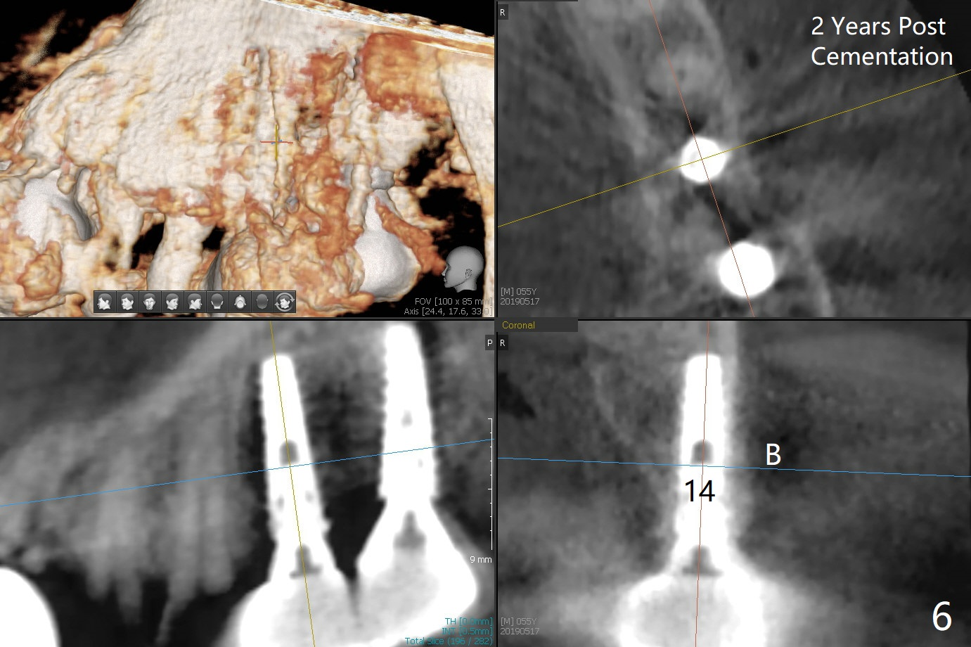 As shown by CT, the ridge at #14 is narrower than that of #15 (confirmed after incision), whereas the density at #14 is higher than that of #15. The osteotomies are established by combination of magic osteotomes and drills after change in trajectory (Fig.1-3). Following placement of 4.5x13 and 5x13 mm IBS implants and 6x4(3) and 6.5x4(3) mm pair abutments at #14 and 15 (Fig.4), flaps are sutured for hemostasis. Since the patient does not tolerate the surgery too well (unstable hypertension and oozing), immediate provisional is delayed. Periodontal dressing is applied instead. While the implants are healing, porcelain chips at the upper anterior bridge. There appears no bone resorption 6 months postop (Fig.5). Impression is taken following changing abutment to 5x4(2) mm at #14 and Diode gingivectomy. A panoramic film is taken 1 year 2 months post cementation. CT taken 2 years post cementation shows relatively good trajectory of these 2 implants (Fig.6,7).